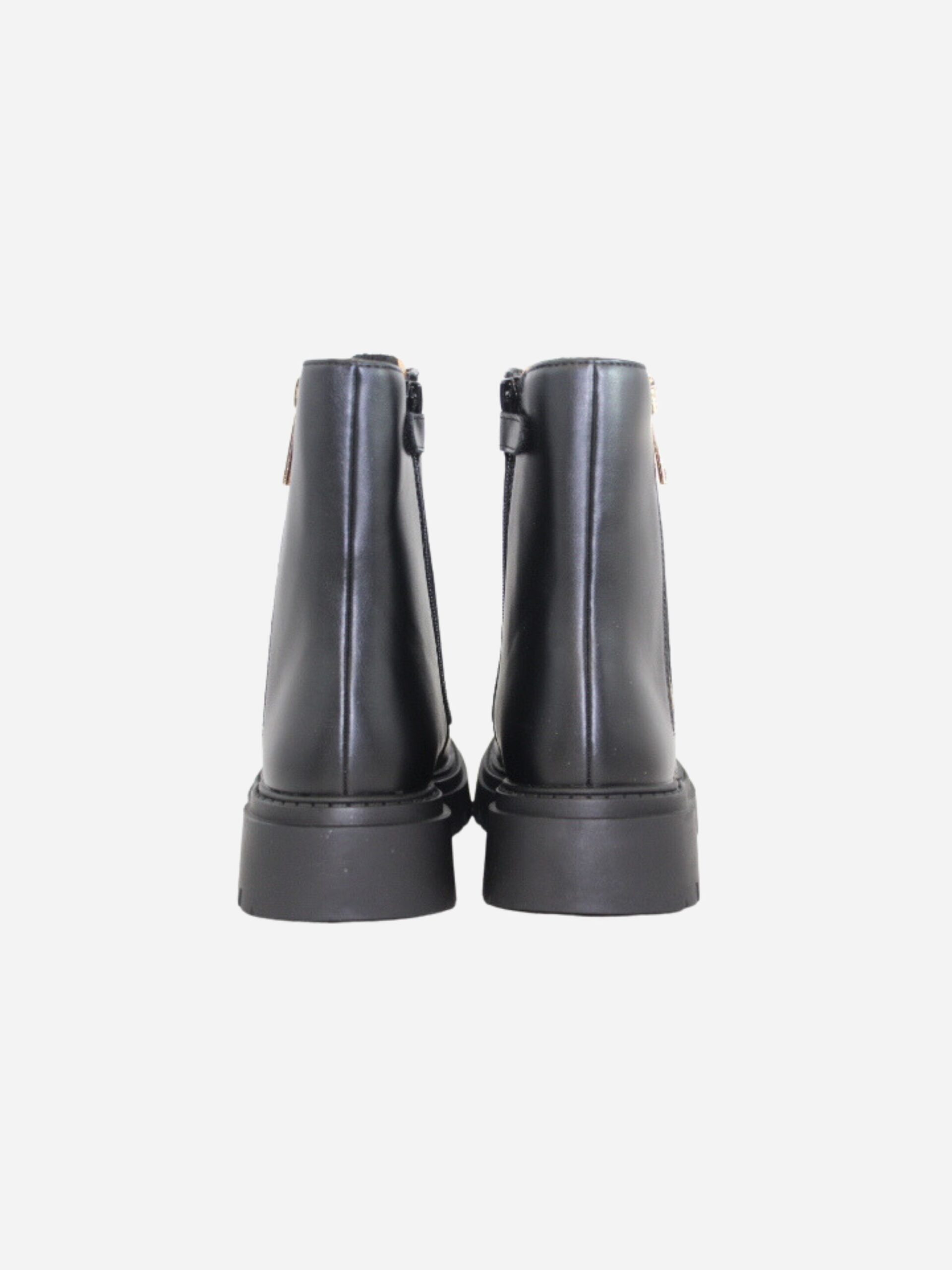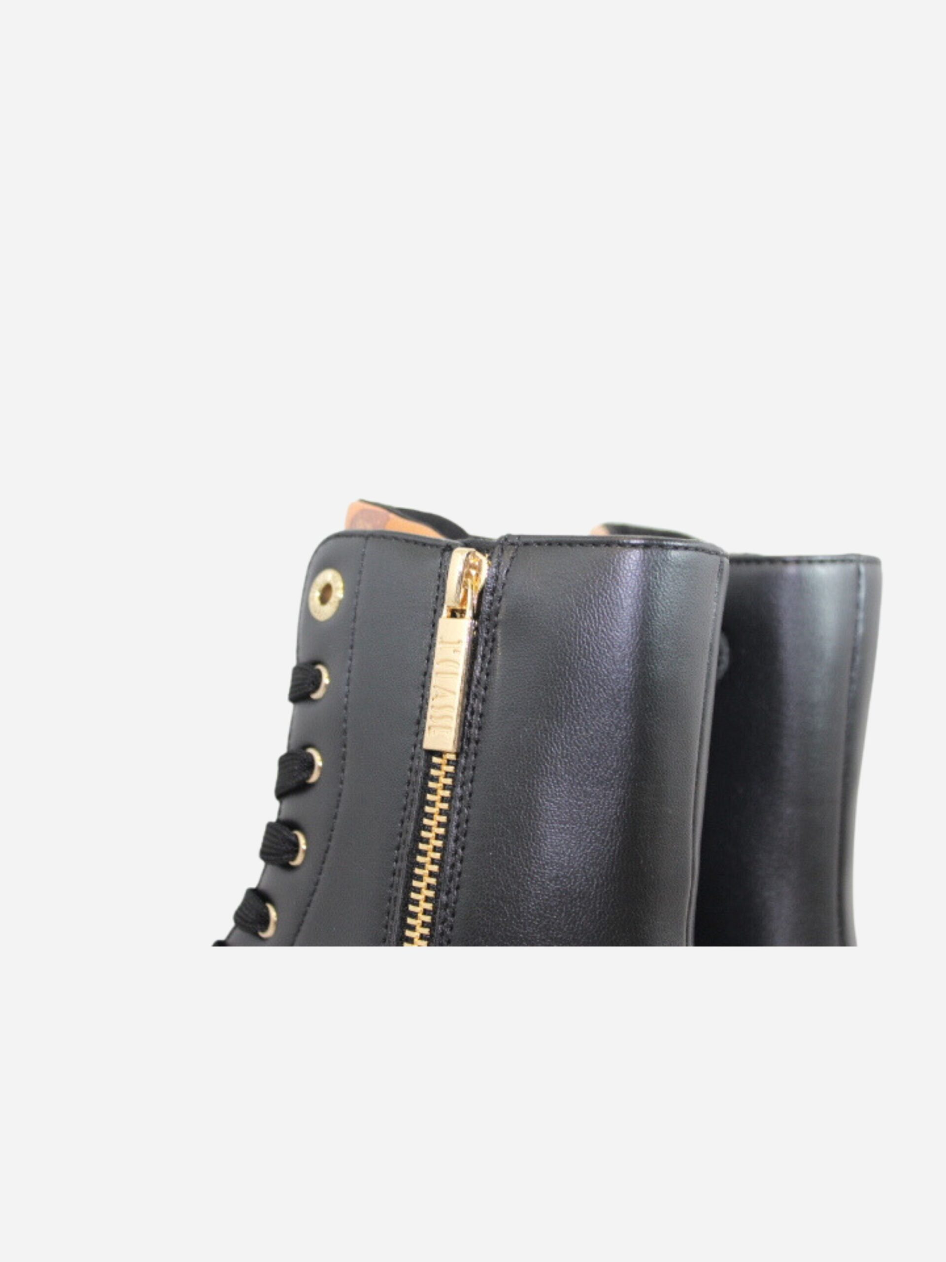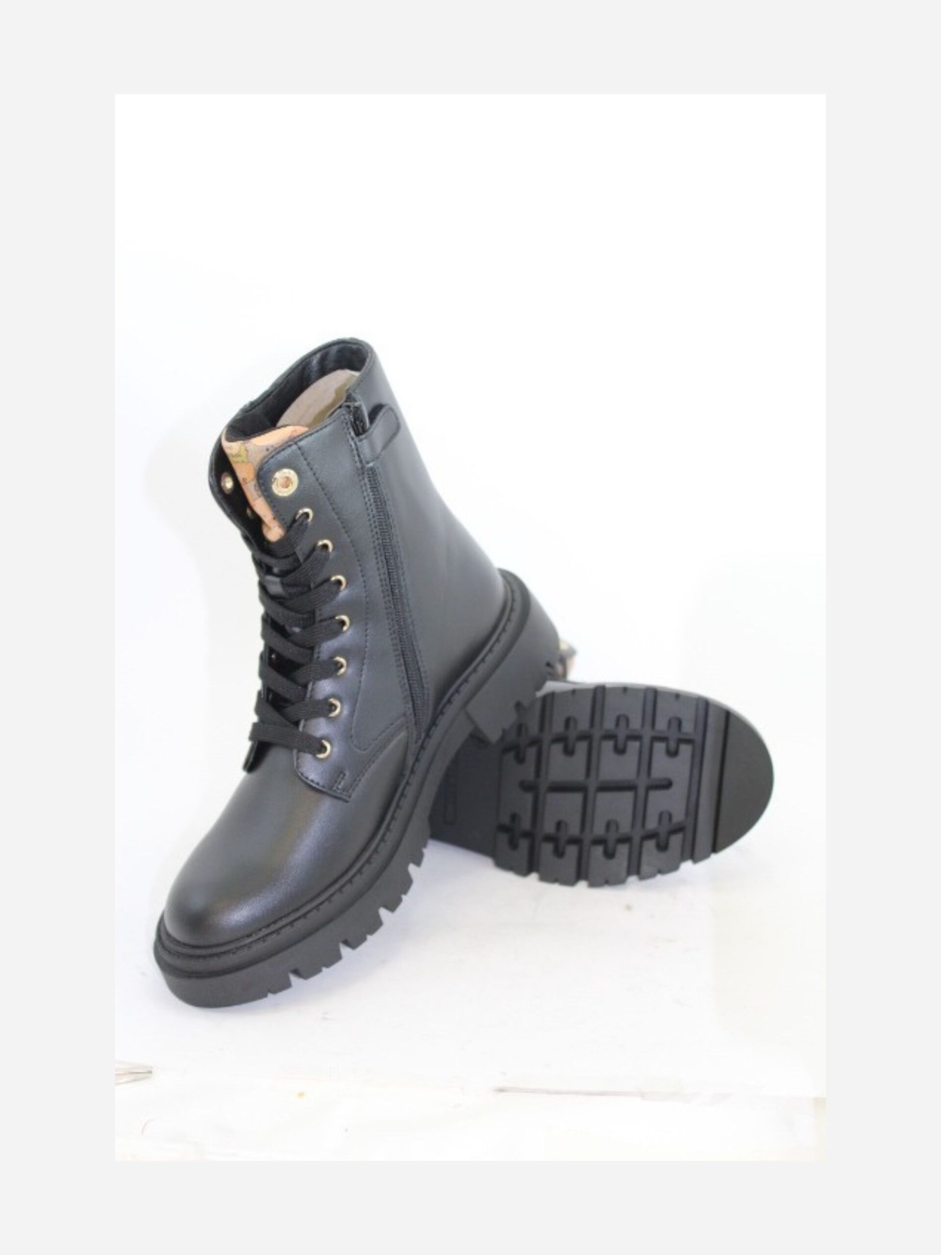 Anfibi by Prima Classe di Alviero Martini. Scarpe realizzate in pelle nera con suola track in gomma alta 4 cm. Cerniera laterale su entrambi i lati. Dettaglio a fantasia geo sulla linguetta.