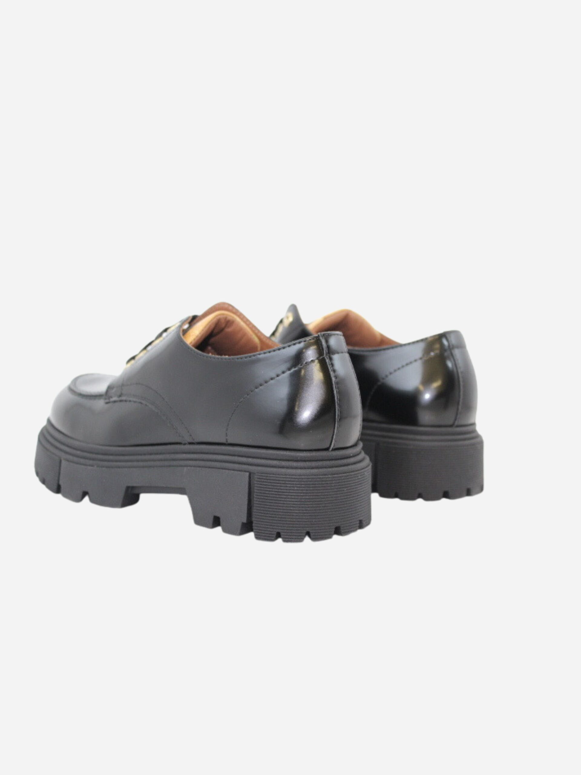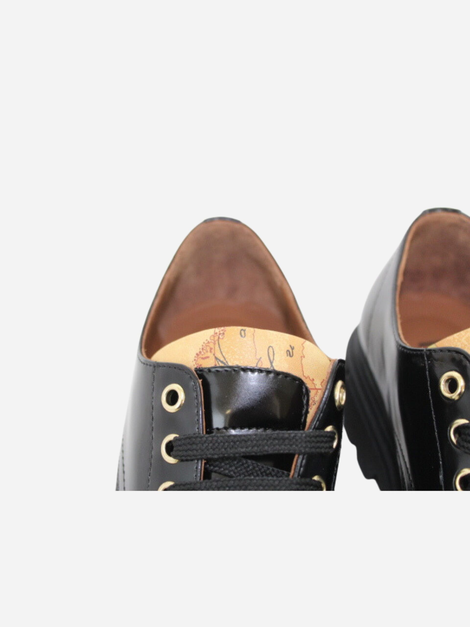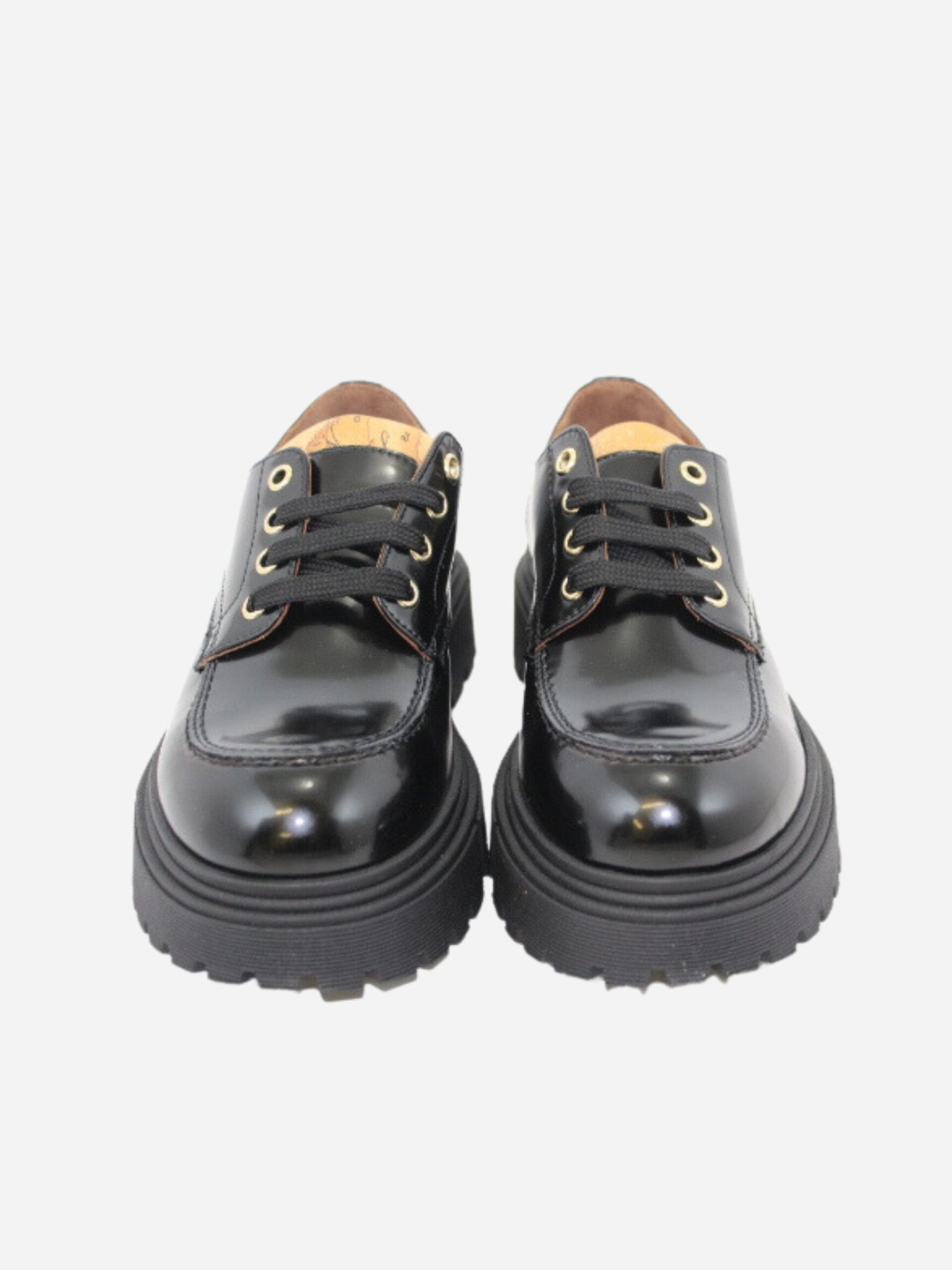 Scarpa stringata by Prima Classe di Alviero Martini. Scarpa realizzata in pelle nera spazzolata con interno in pelle. Fondo Platform di 3,5 cm. Chiusura con lacci. Dettaglio con l’iconica fantasia geo sulla linguetta.