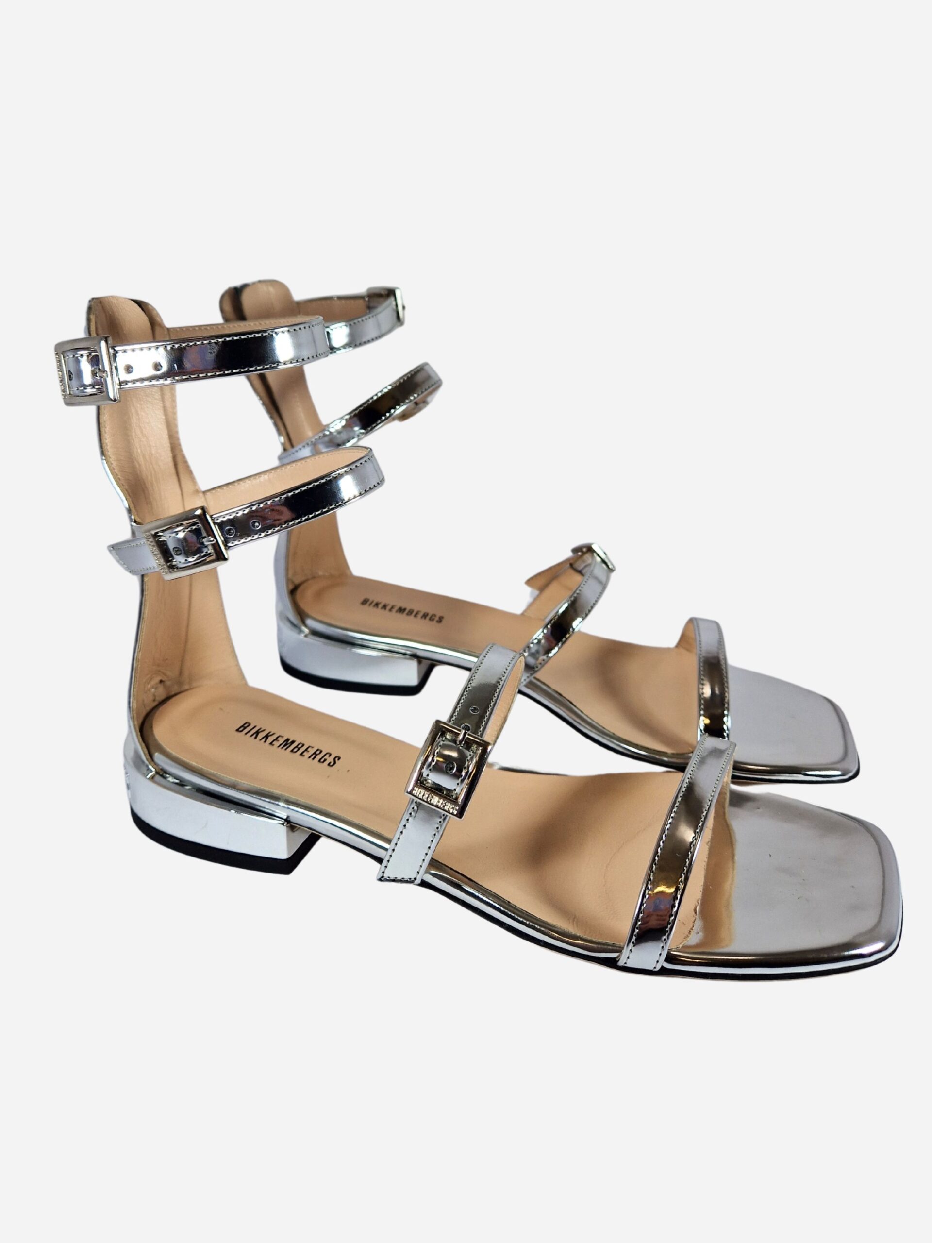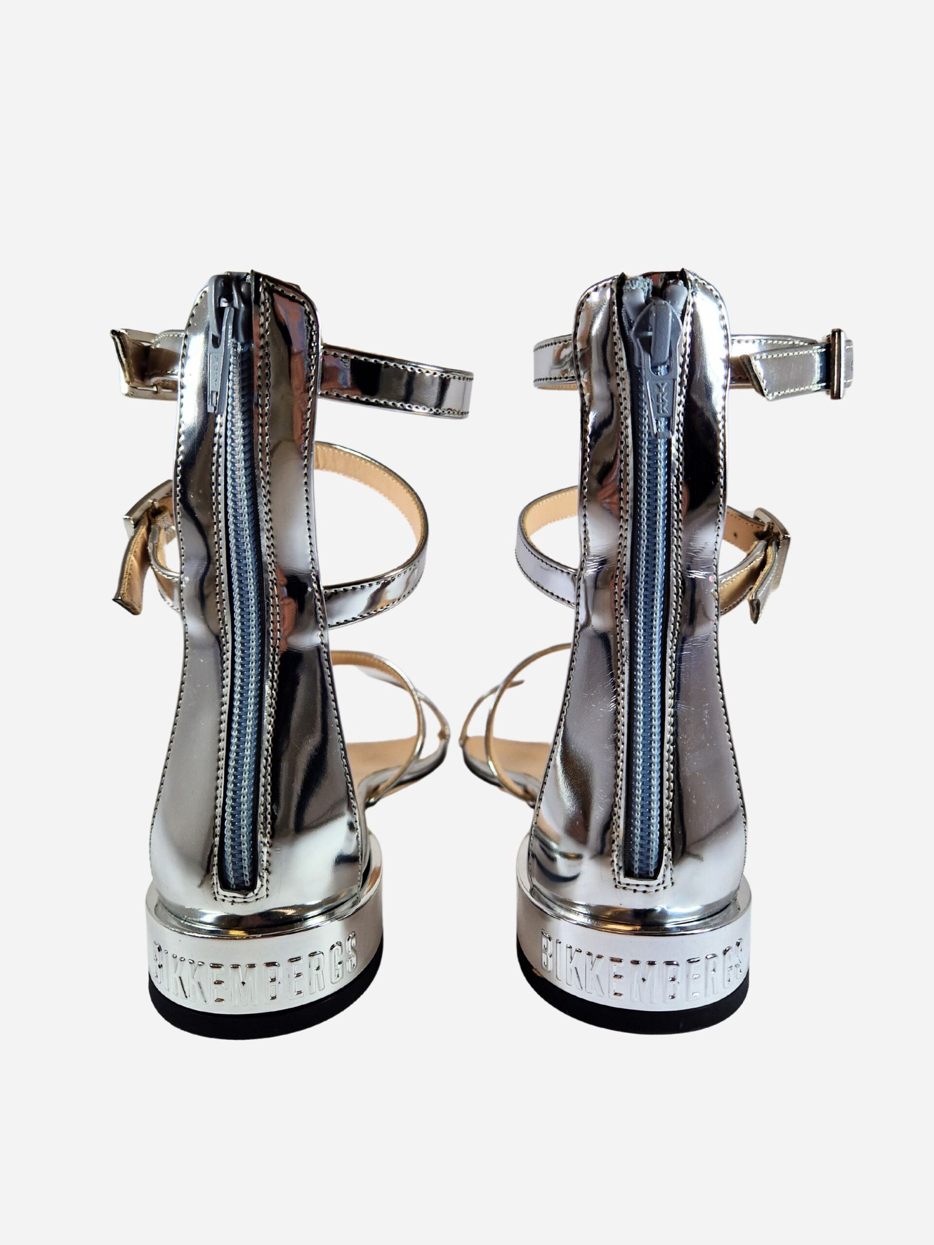 Sandali con cinturini alla schiava Bikkembergs. Calzature realizzate in vera pelle effetto specchio argento con interno in morbido cuoio. Tacchetto effetto specchio con logo.