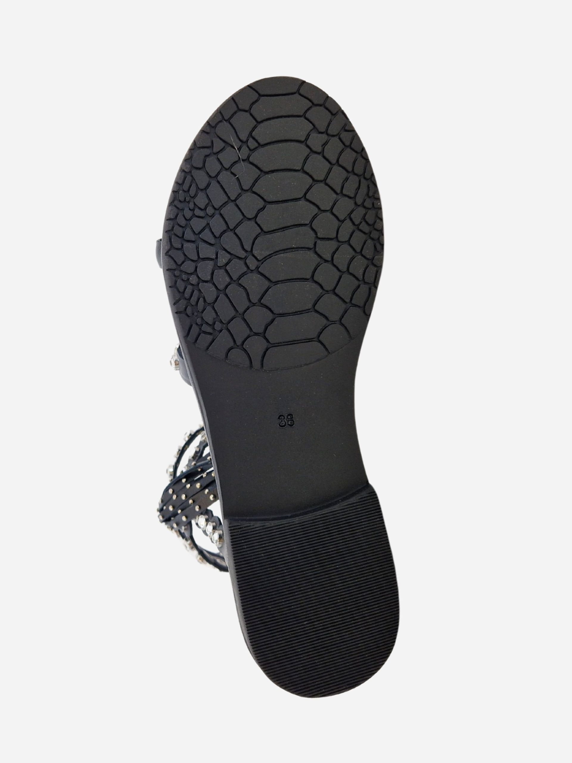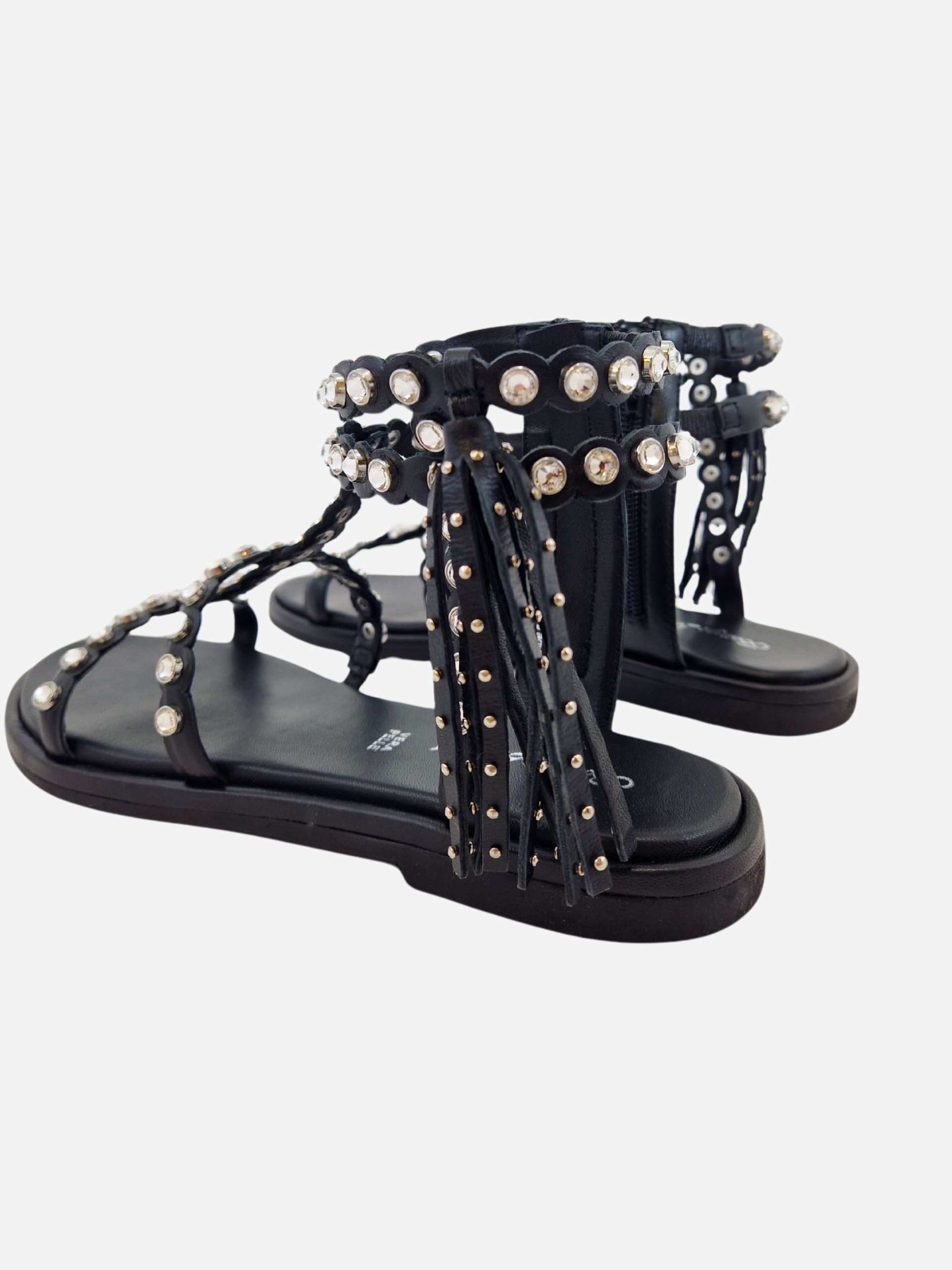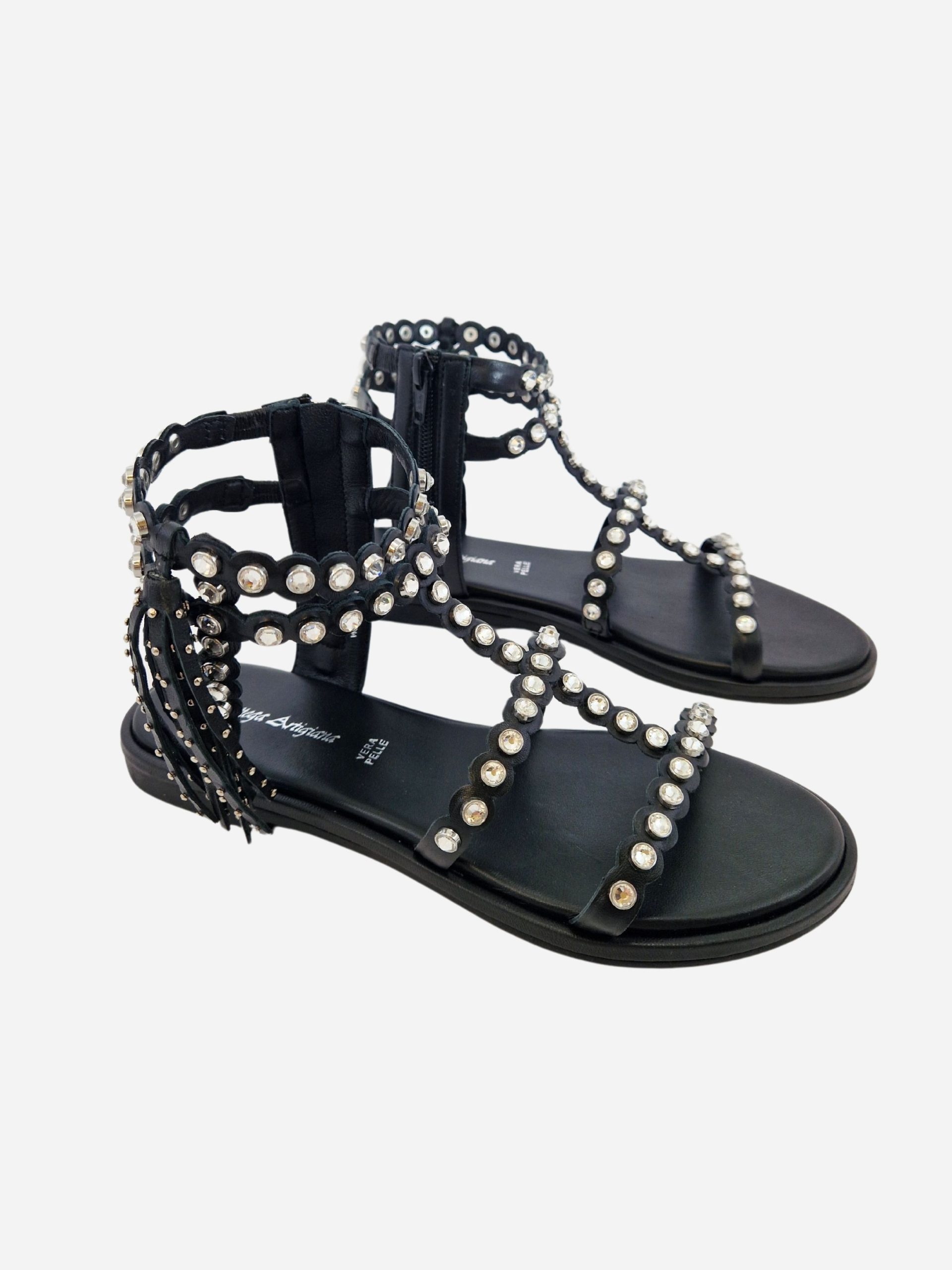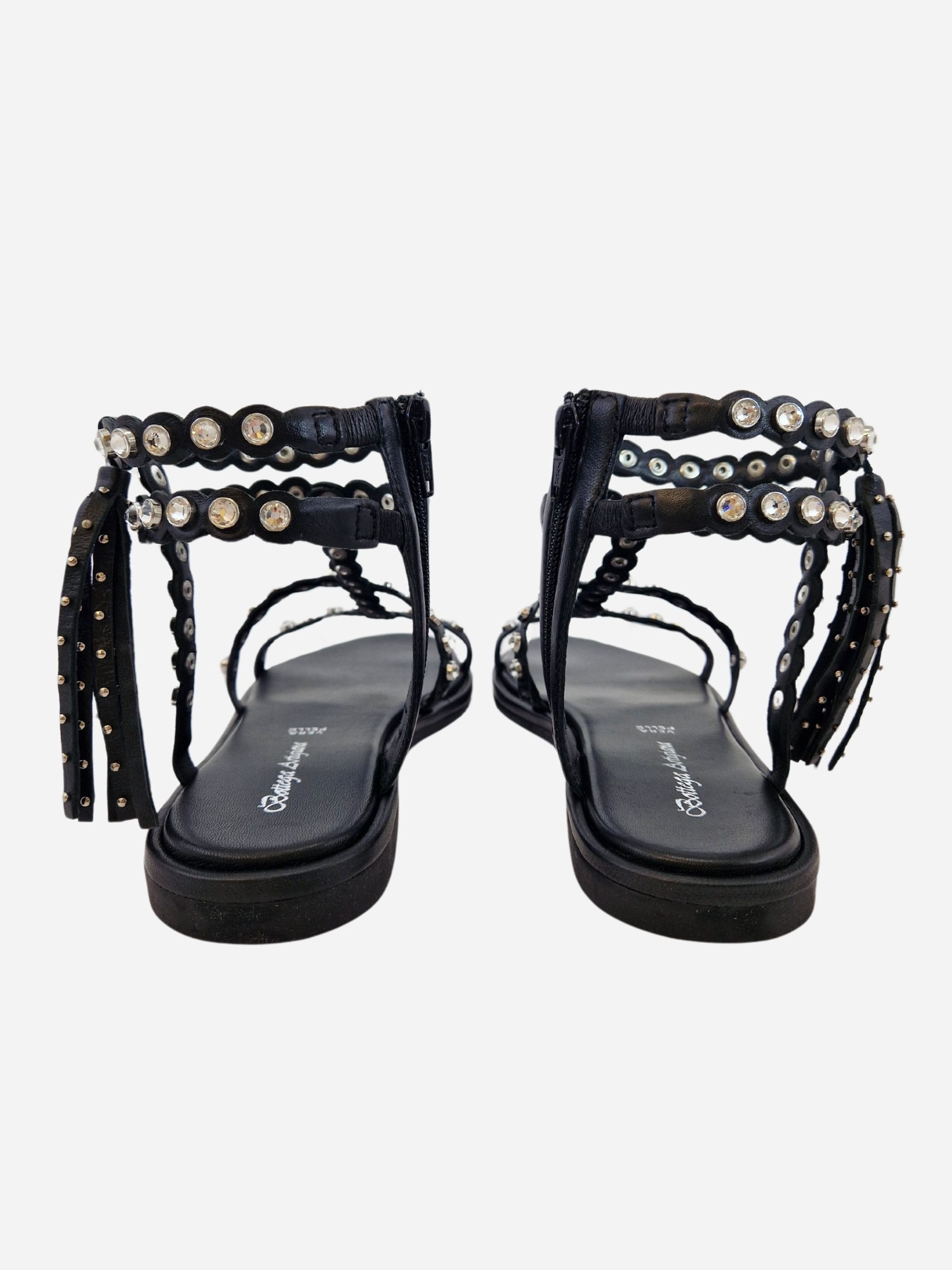 Sandali by Bottega Artigiana. Calzature realizzate in vera pelle, arricchite da strass applicati su tutte le fascette e nappina laterale. Punta arrotondata. Chiusura con cinturino al tallone.