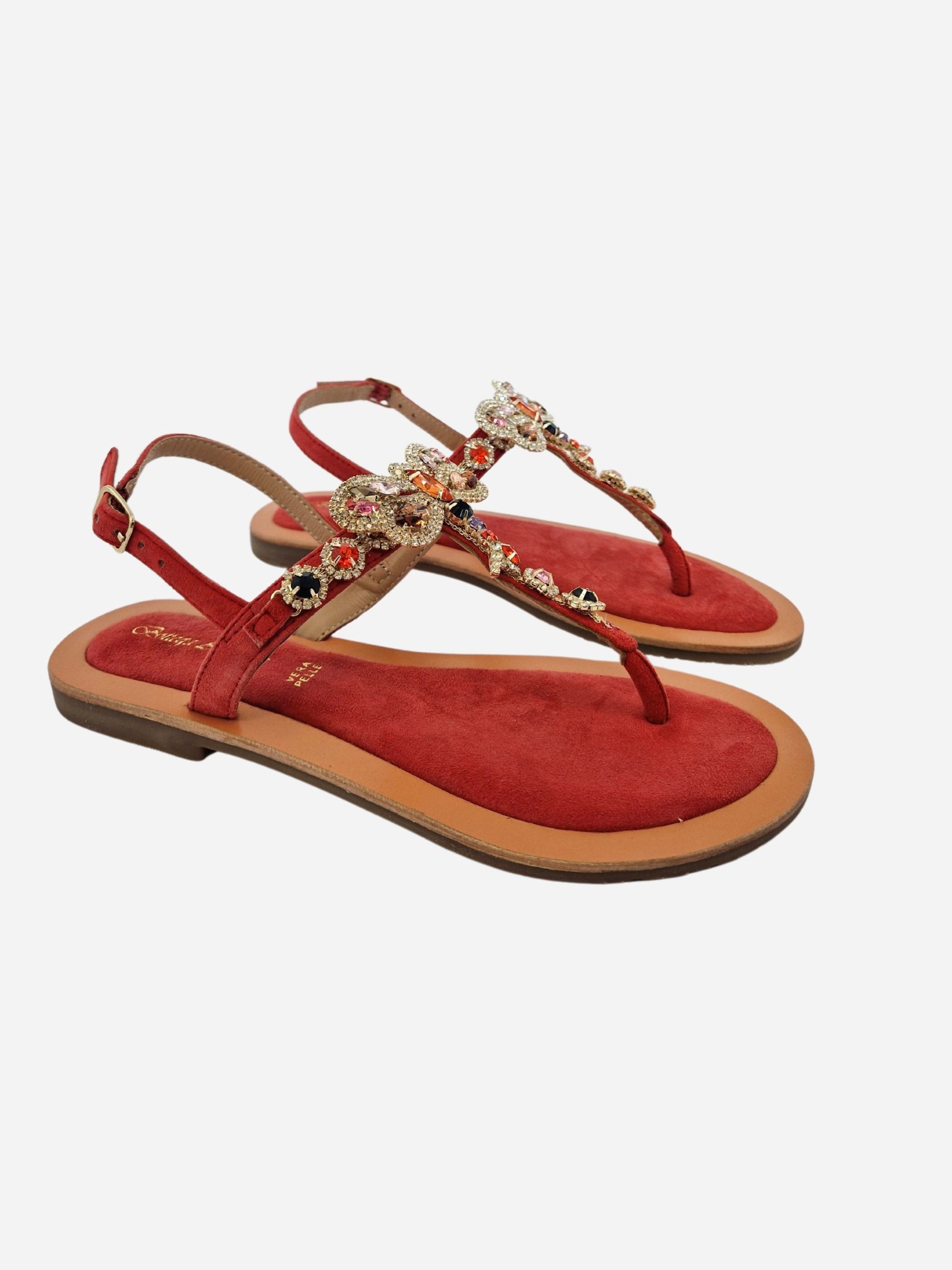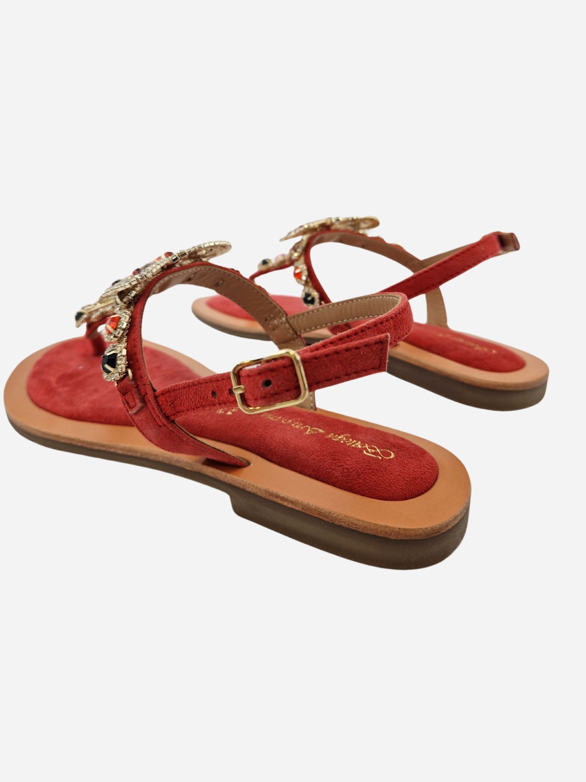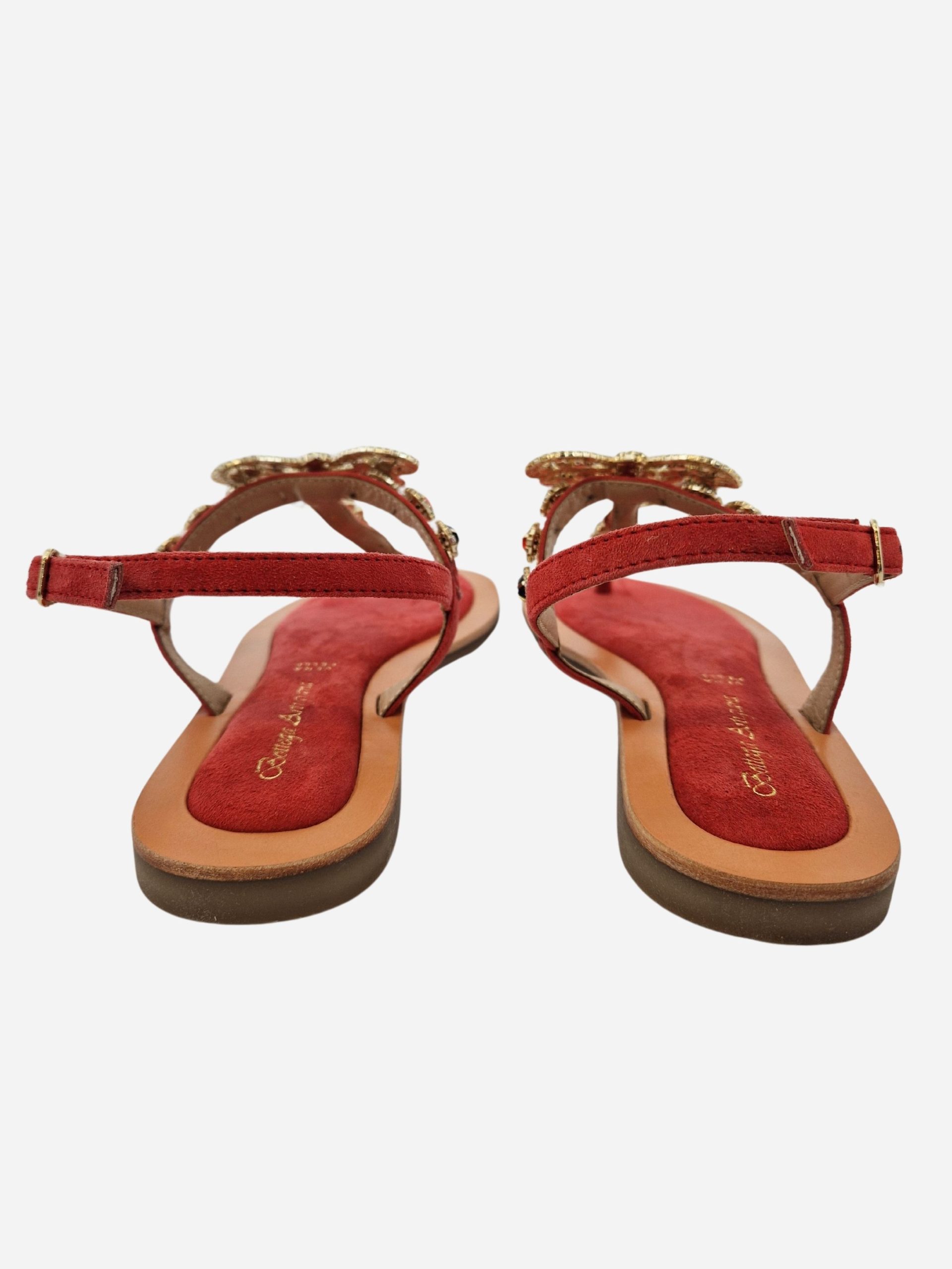 Sandali infradito by Bottega Artigiana. Calzature realizzate in vera pelle con fondo morbido, arricchite da una farfalla e strass applicati. Punta arrotondata. Chiusura con cinturino al tallone.