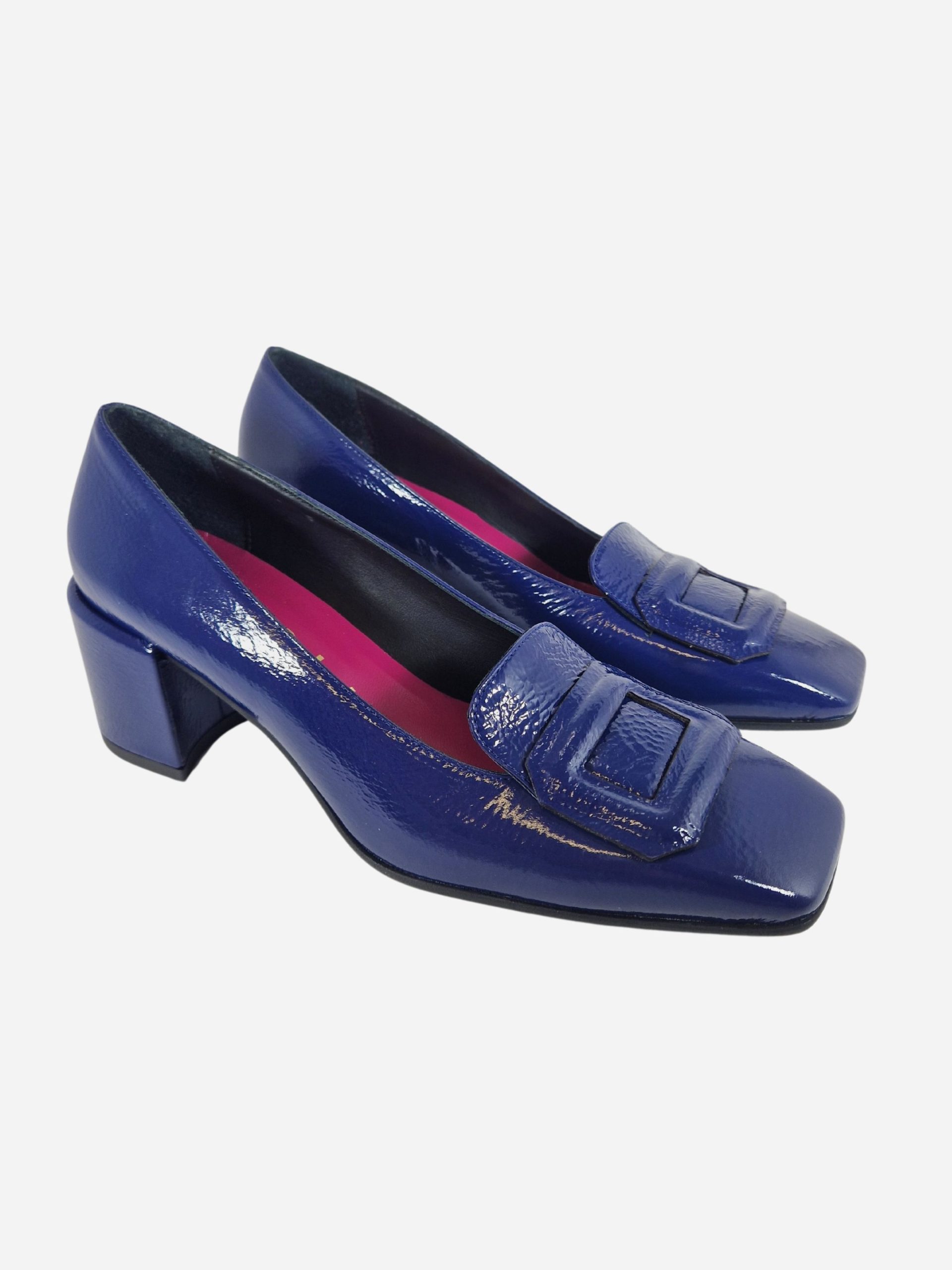 Mocassini con tacco largo di 5 cm arricchiti da un accessorio sulla punta. Calzature realizzate in vera pelle verniciata, con fondo in cuoio e suola in materiale sintetico.