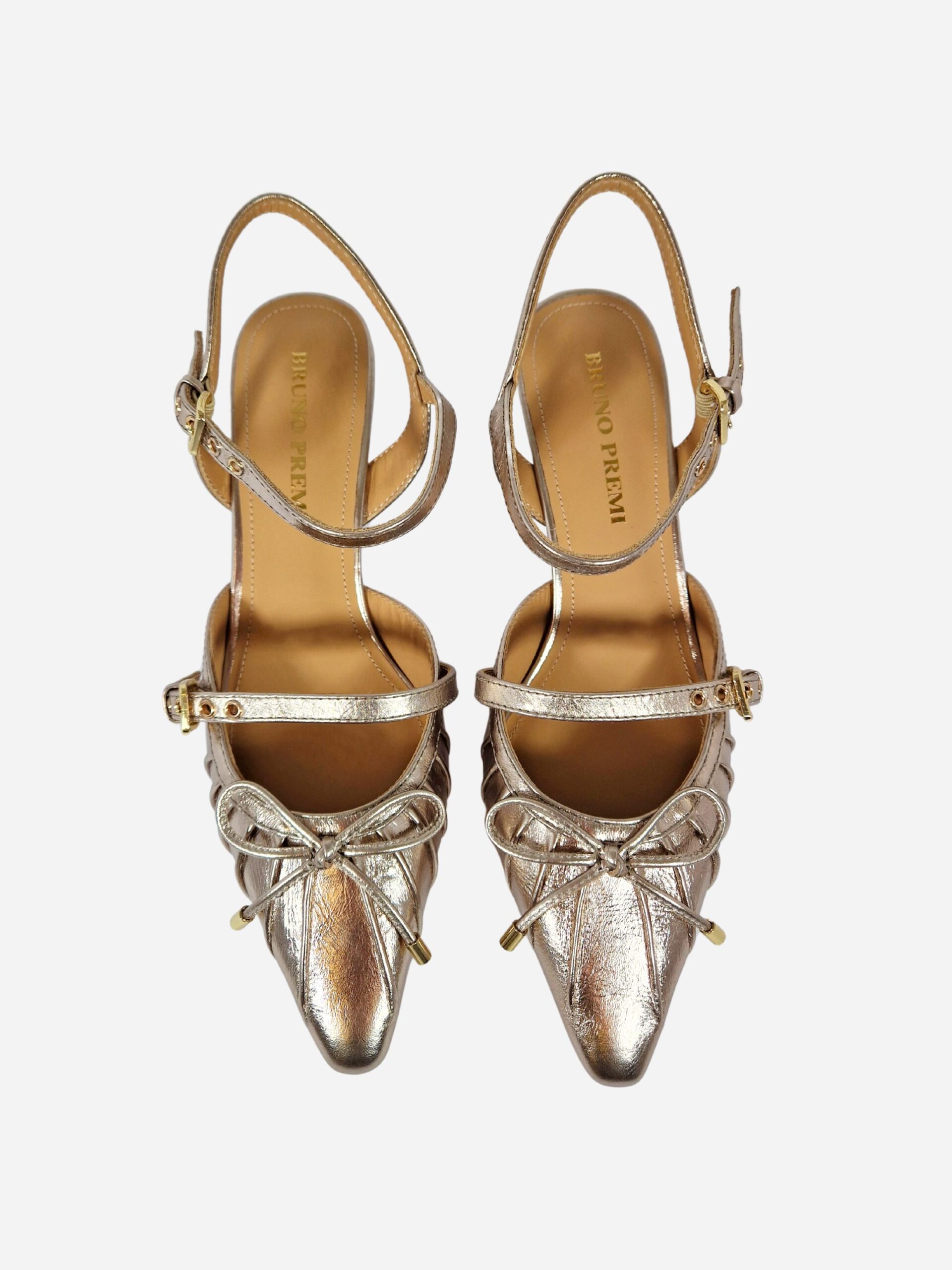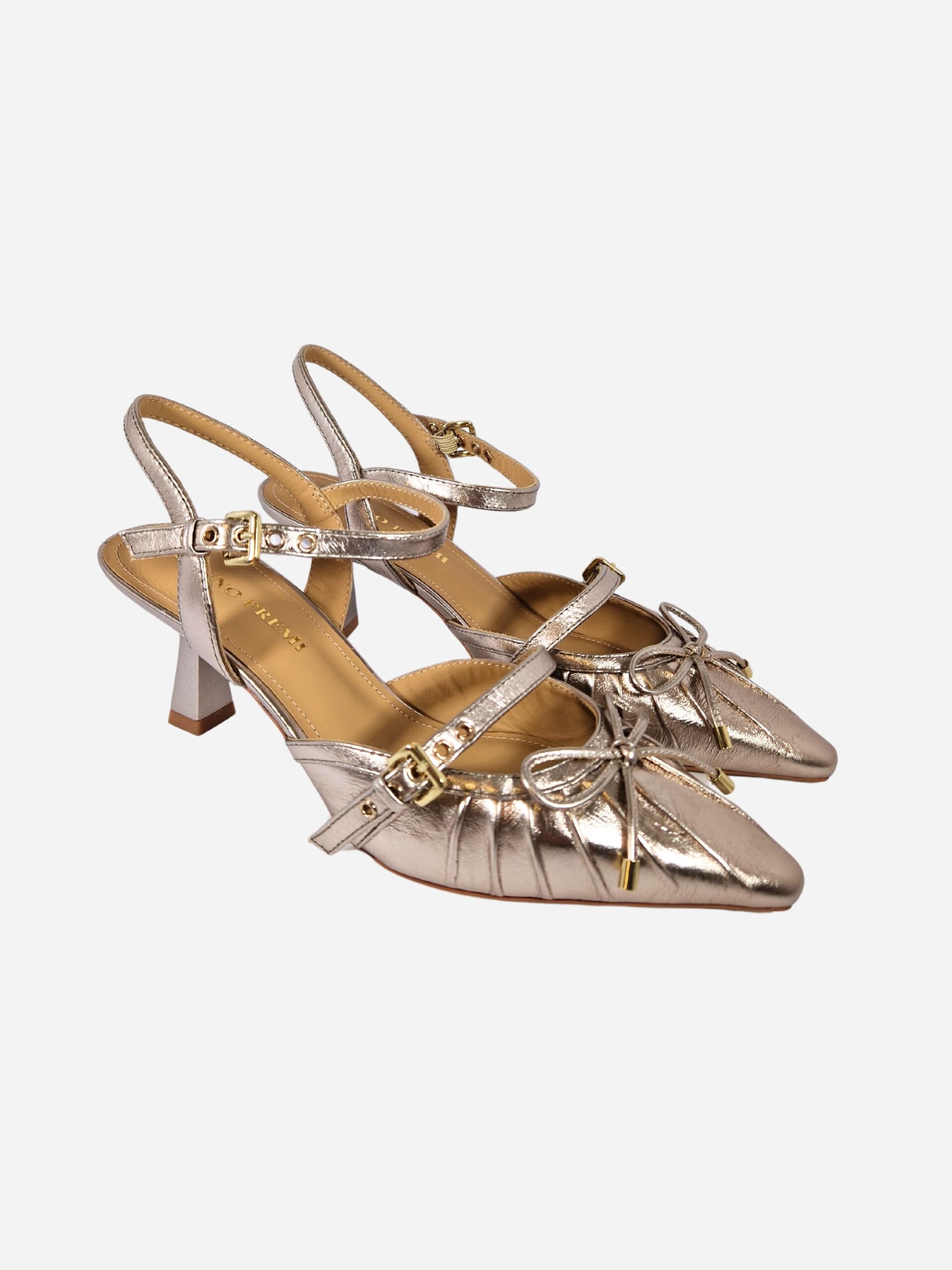 Slingback by Bruno Premi. Calzature realizzate in vera pelle effetto metallizzato, con interno in cuoio e suola in materiale sintetico. La punta è arricchita da una decorazione plissettata e da un fiocchetto. Chiusura con cinturino alla caviglia. Tacco di 7 cm.