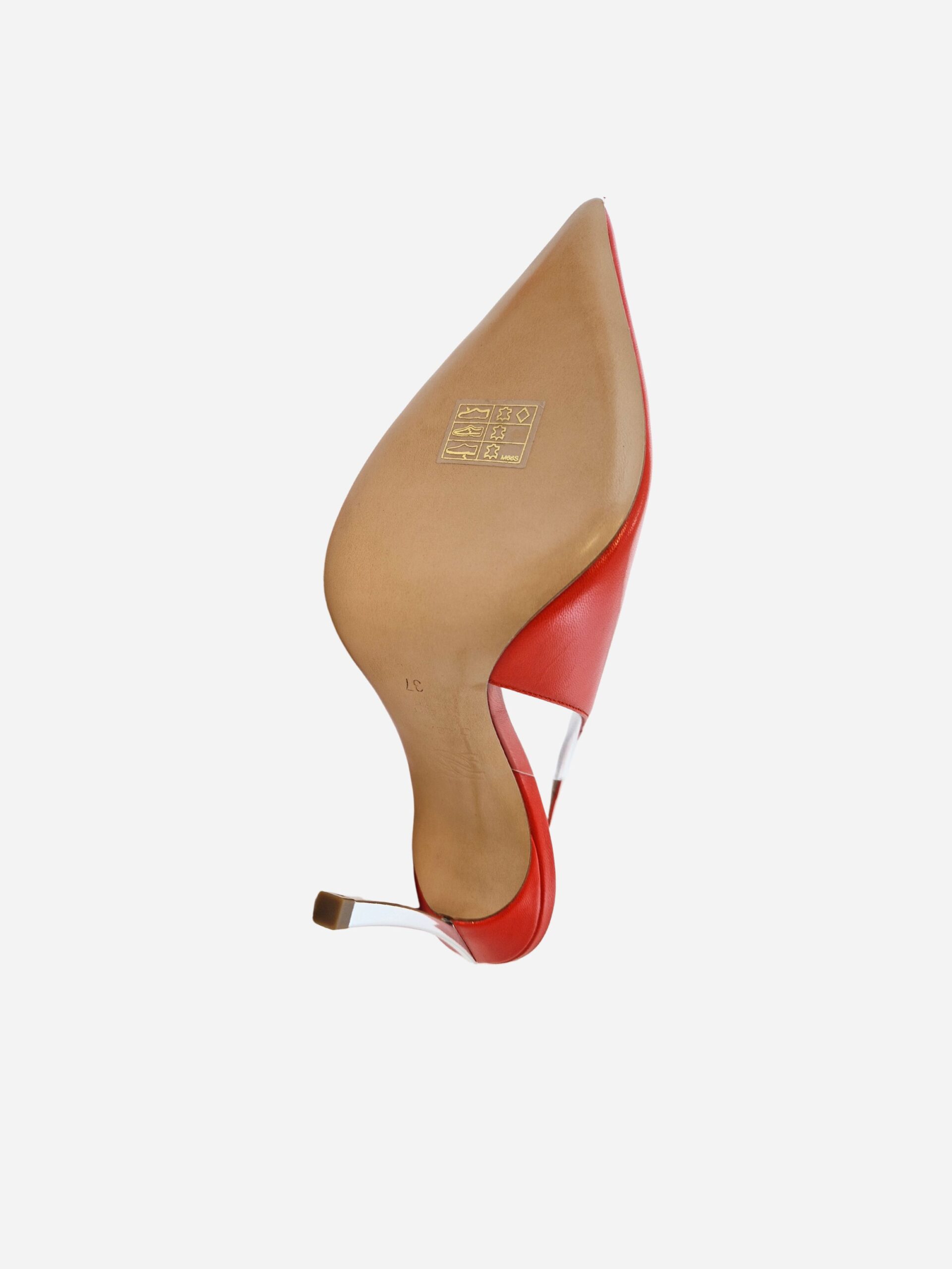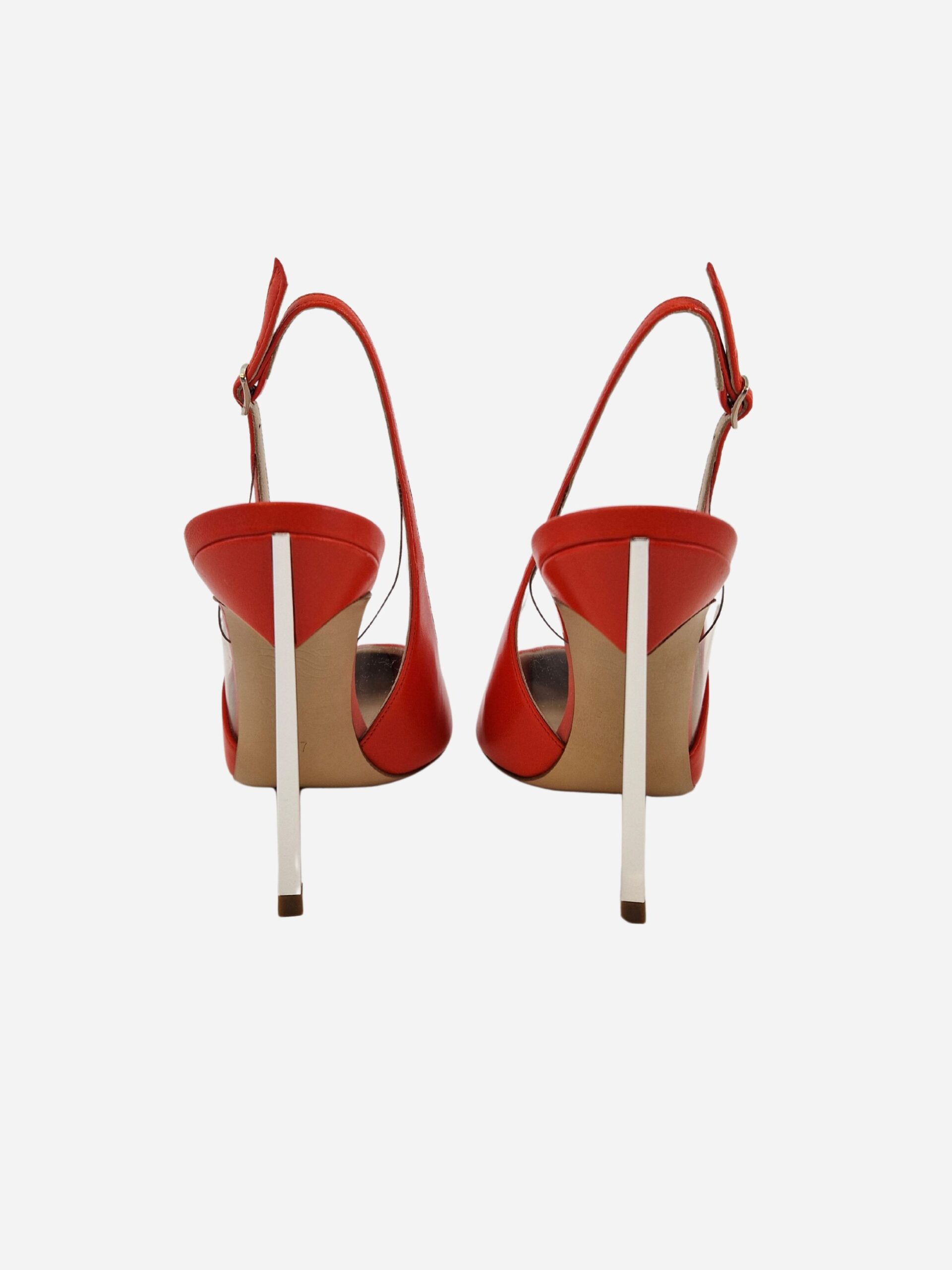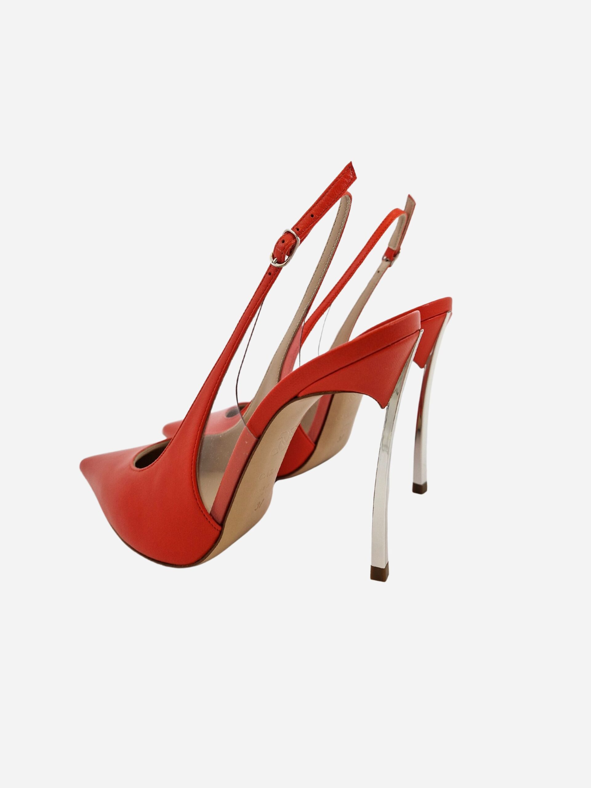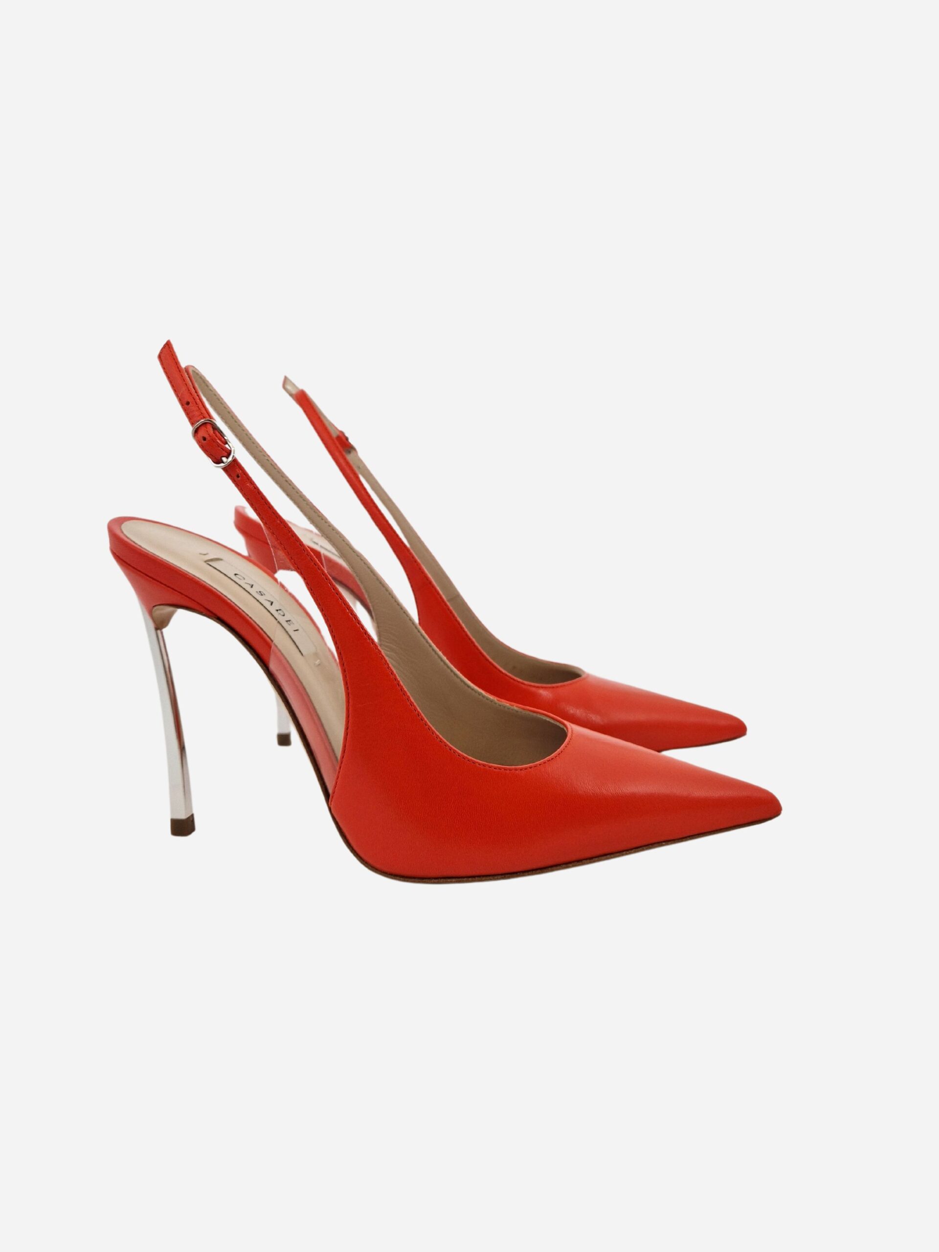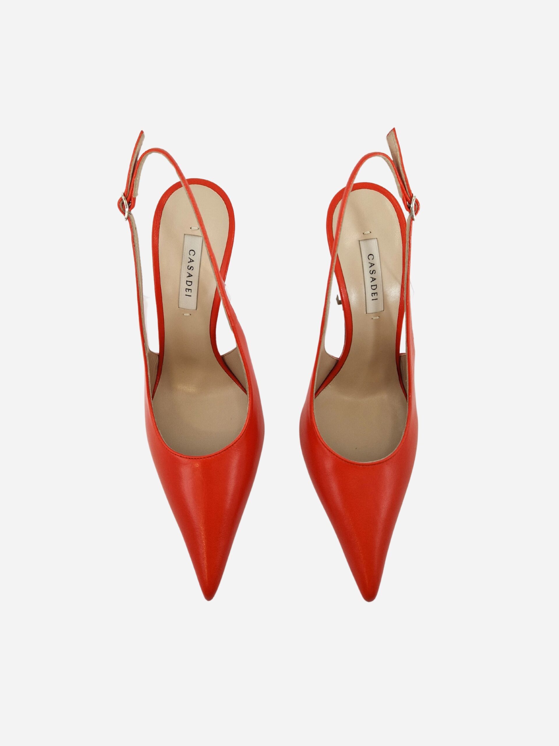 Slingback by Casadei. Scarpe realizzate in vera pelle di vitello verniciata con mobido fondo in cuoio. Inserti in pvc laterali. Iconico tacco blade di 10 cm simbolo della maison. Disponibile in due varianti: nero, arancione.