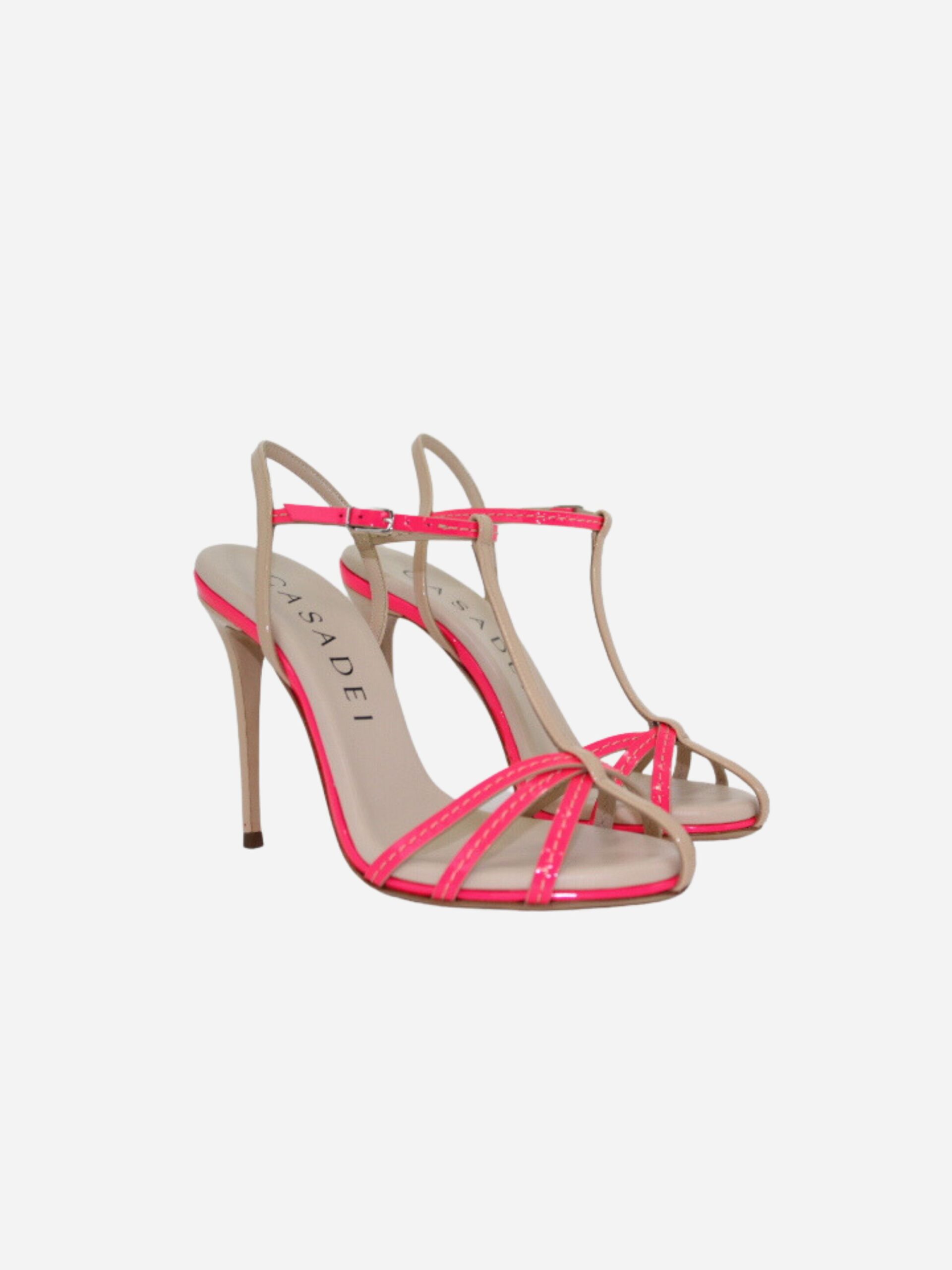 Sandali con fascette by Casadei. Scarpe realizzate in vera pelle con suola in cuoio. Inserti in pelle verniciata color fuxia con dettaglio cucitura a contrasto. Tacco a spillo di 10 cm.
