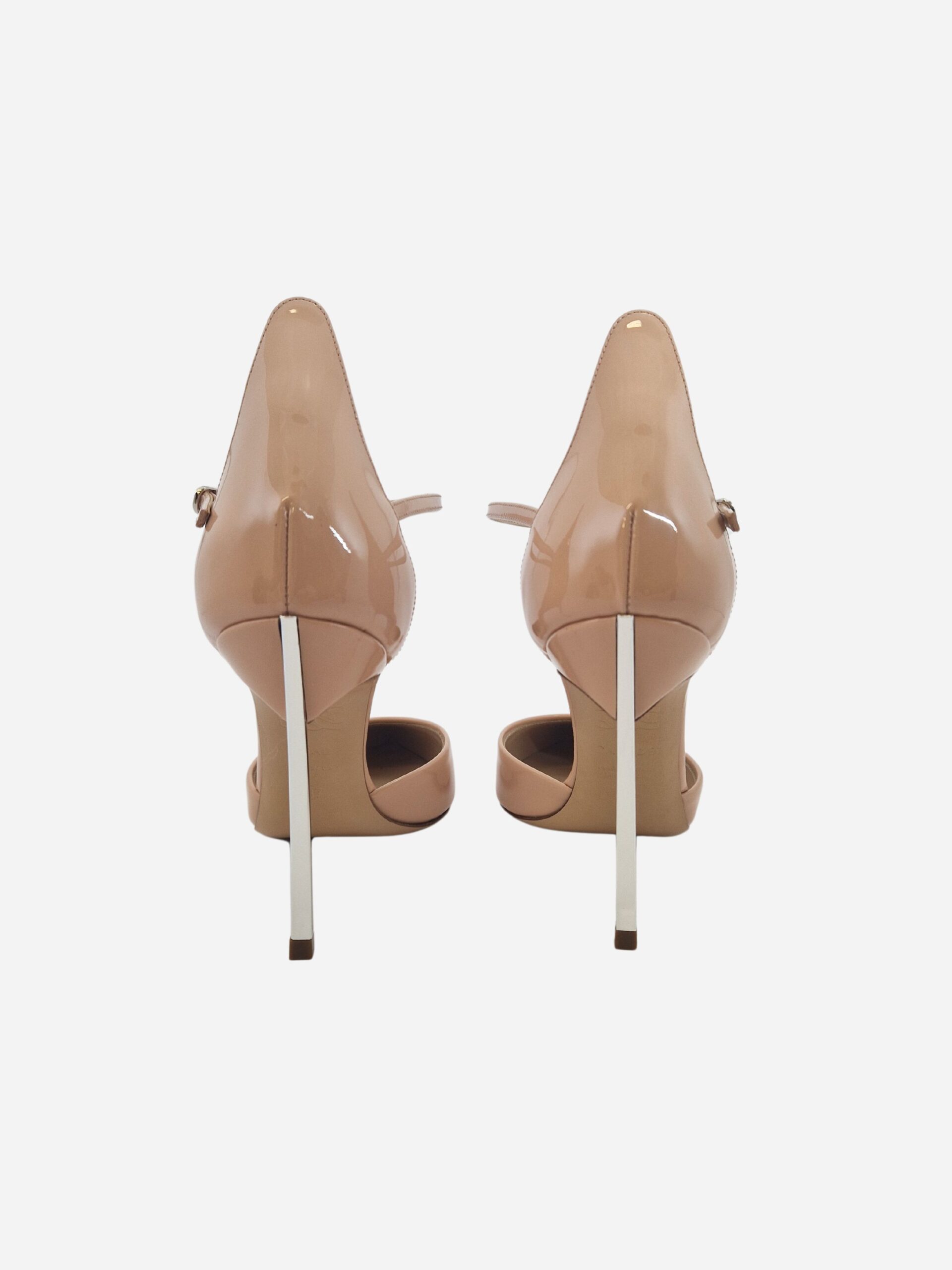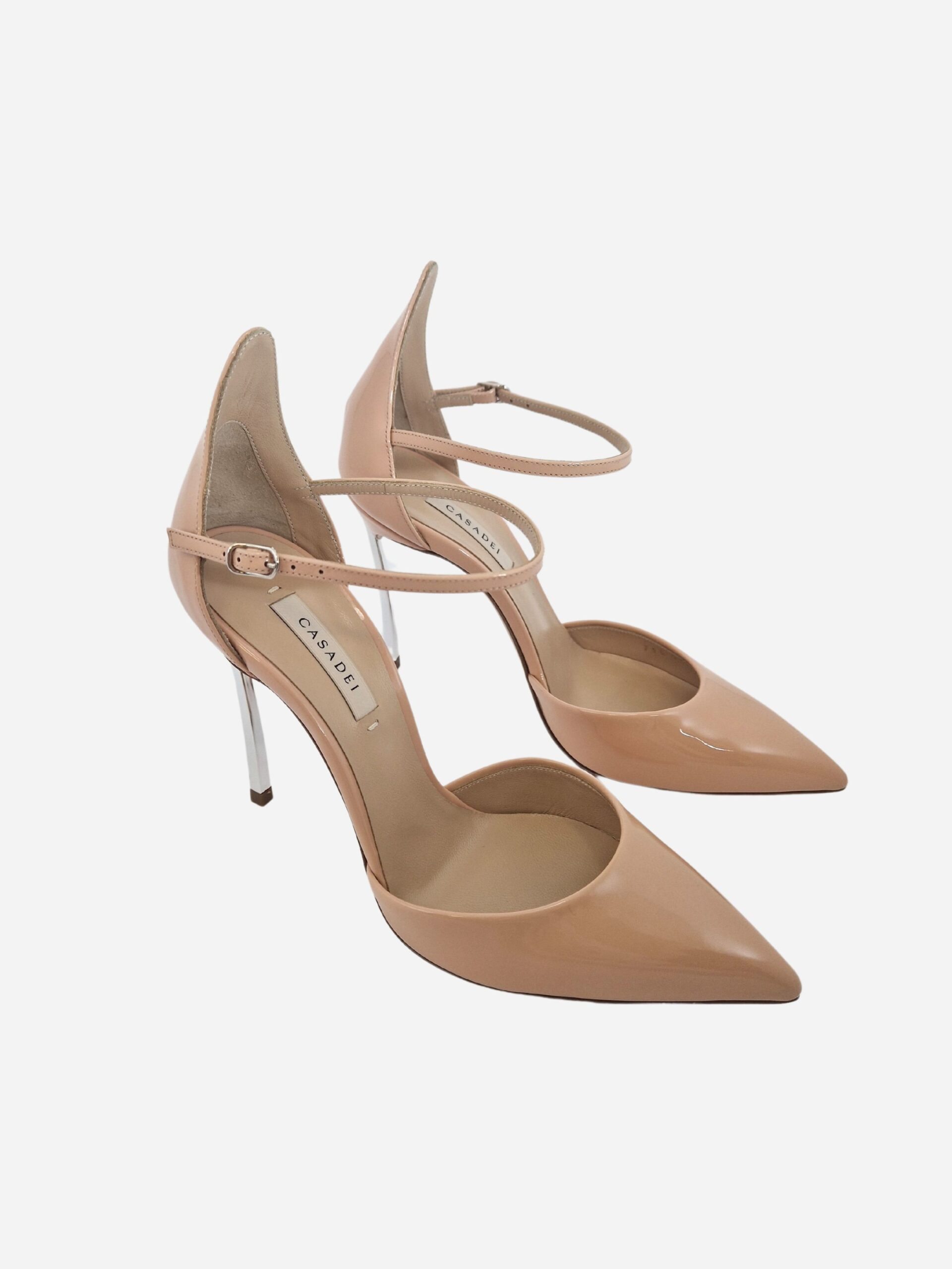 Scarpa con cinturino by Casadei. Scarpe realizzate in pelle verniciata nella variante cipria con morbido fondo in cuoio. Tacco Blade in acciaio metallizzato di 10 cm simbolo della maison.