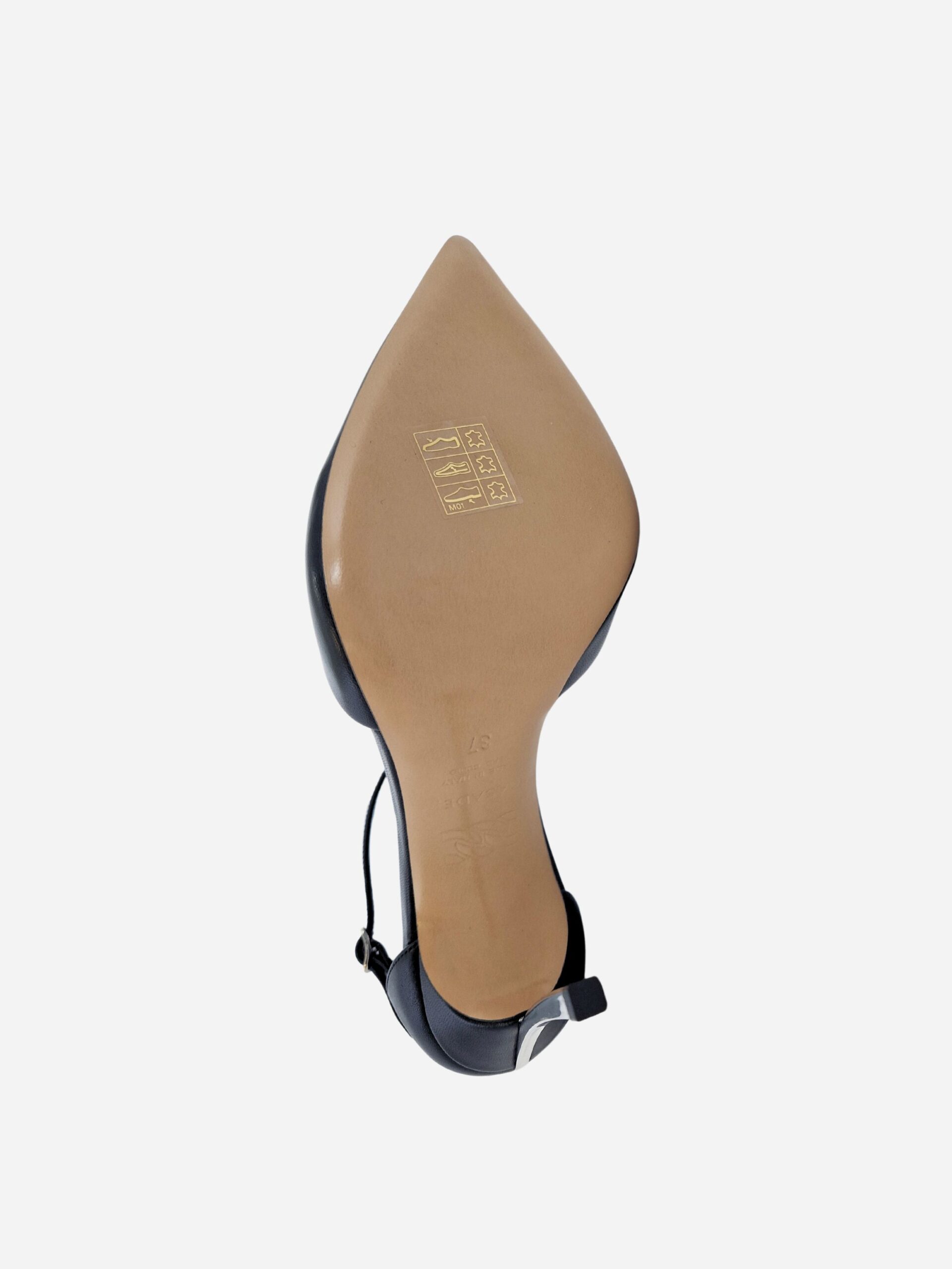 Scarpa con cinturino by Casadei. Scarpe realizzate in pelle nella variante nera con morbido fondo in cuoio. Tacco Blade in acciaio metallizzato di 10 cm simbolo della maison.