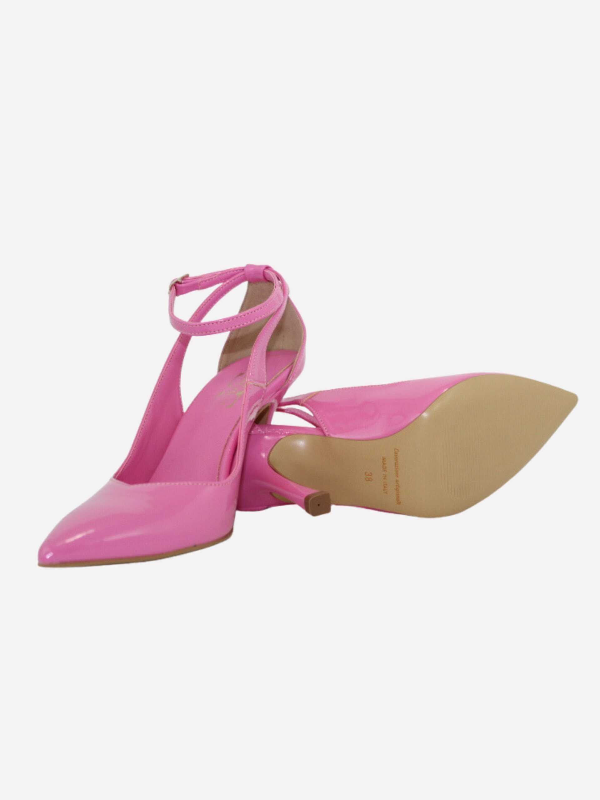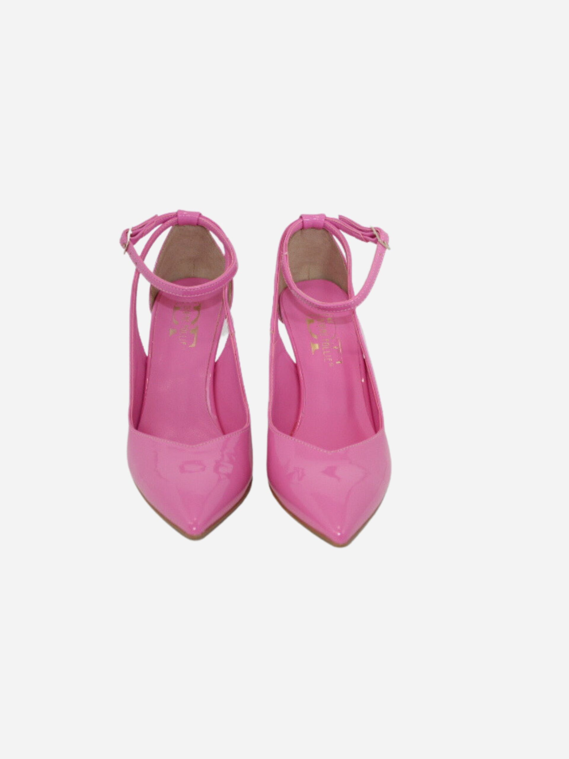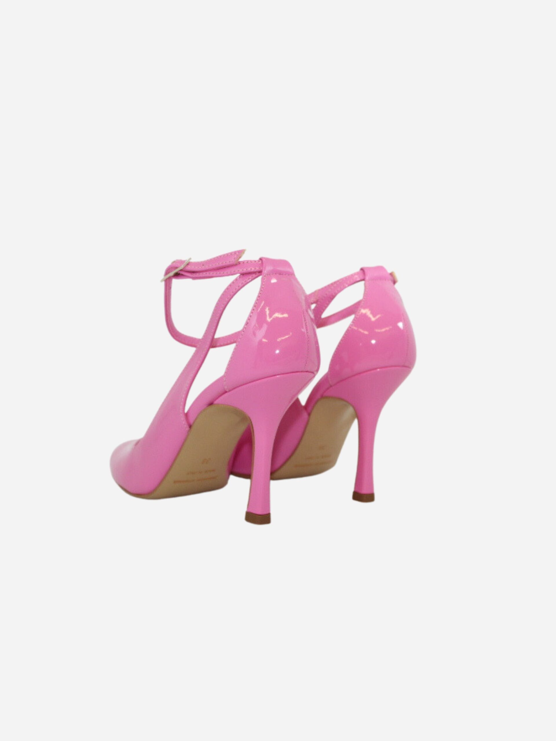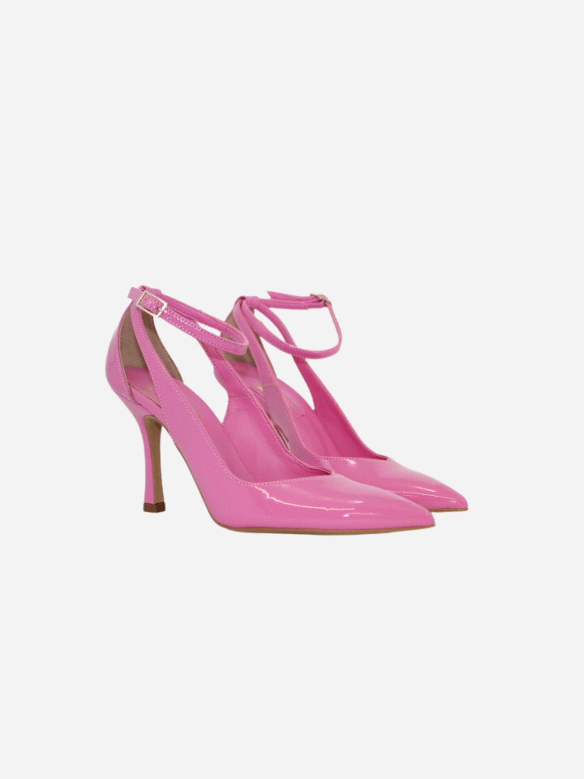 Décolléte by Divine Follie. Scarpe realizzate in pelle verniciata con tacco di 10 cm. Fondo in cuoio. Chiusura con cinturino.