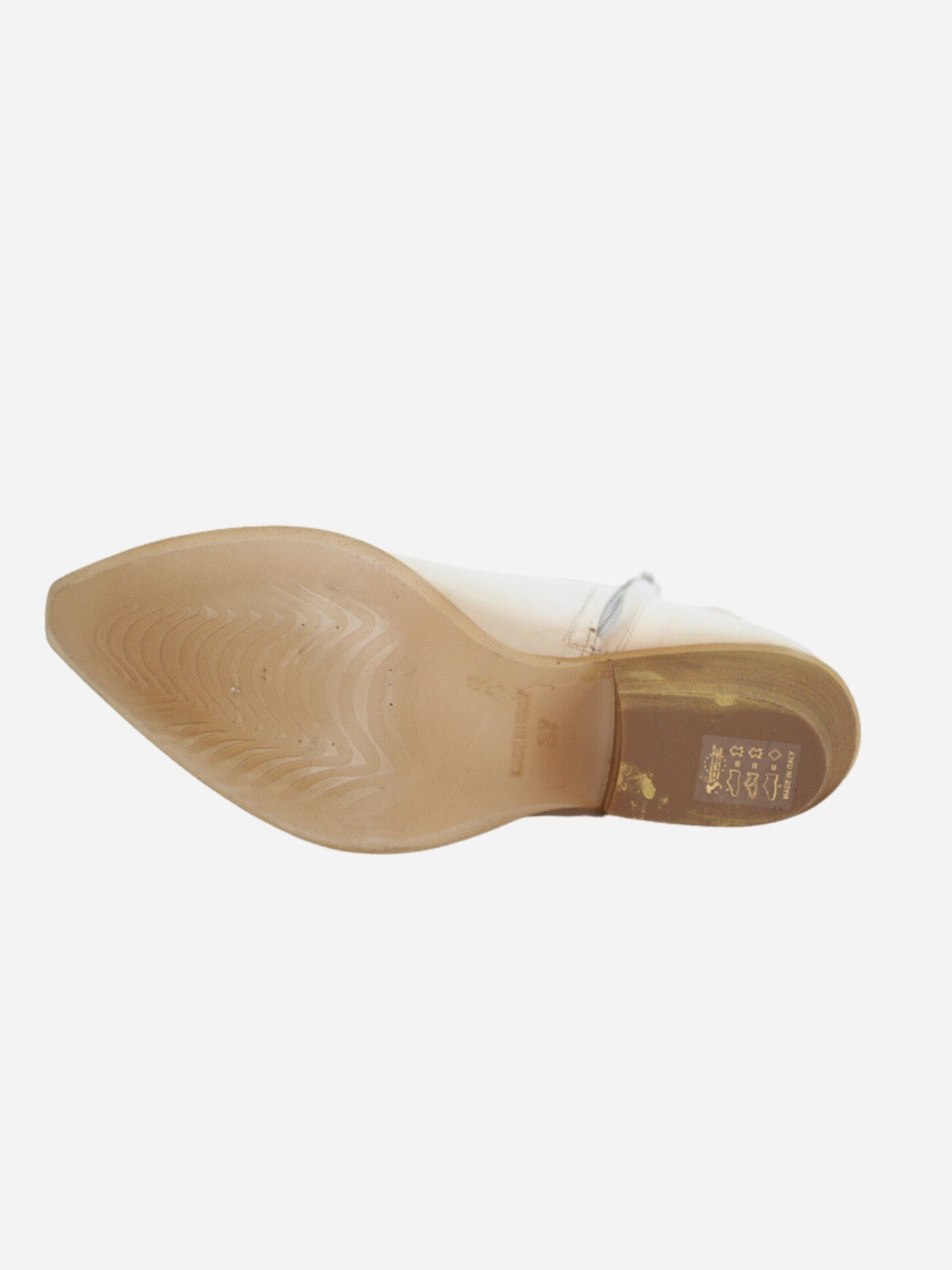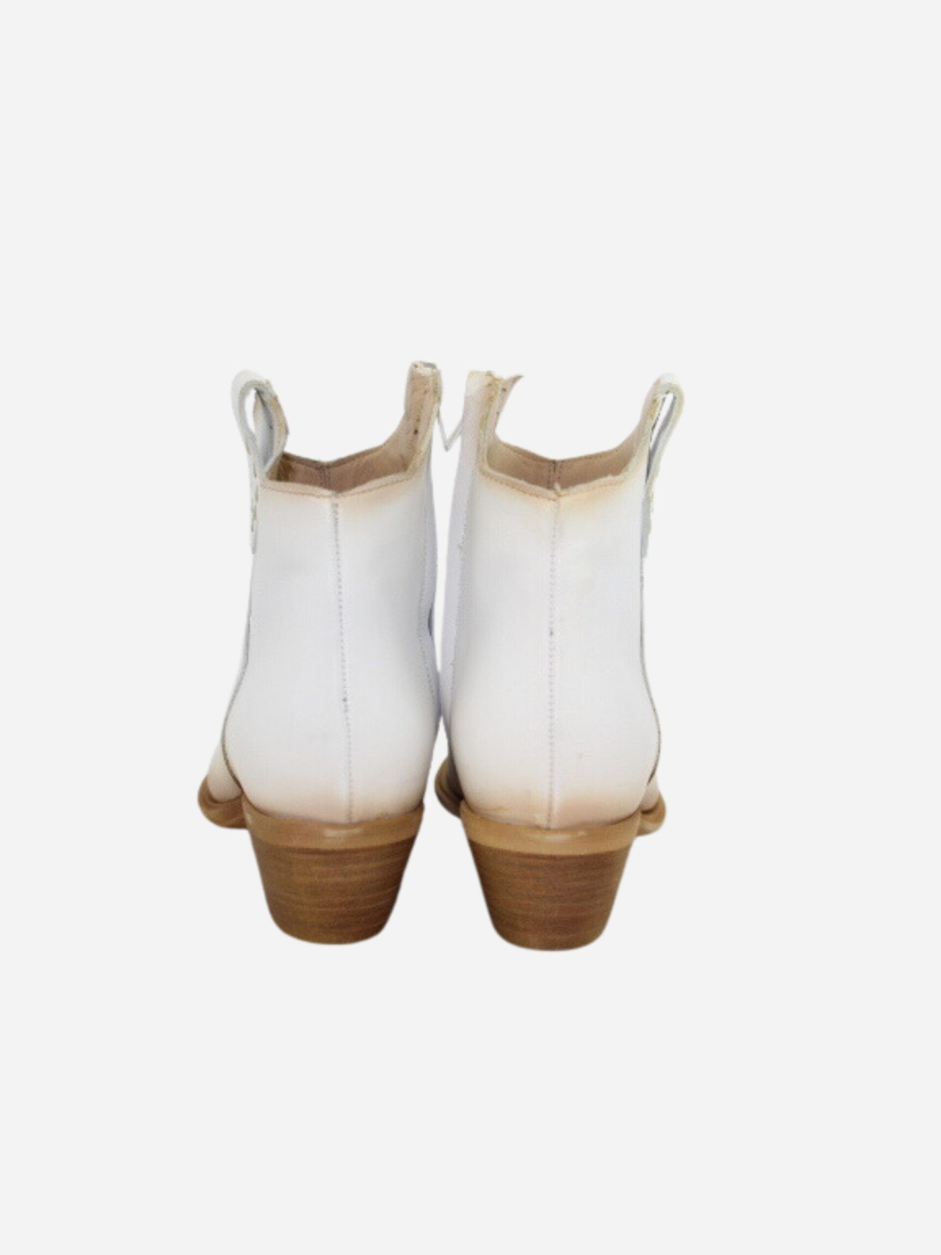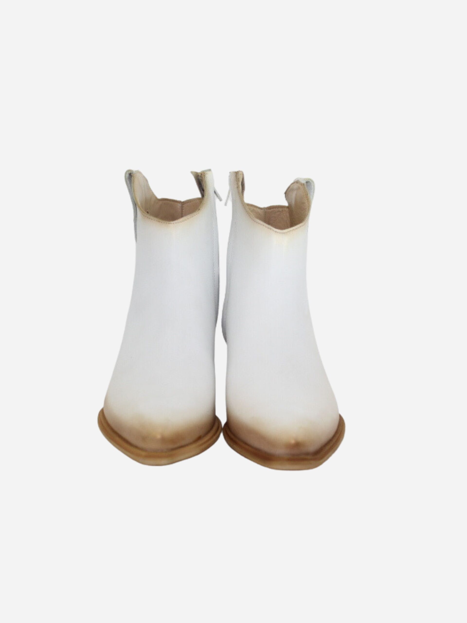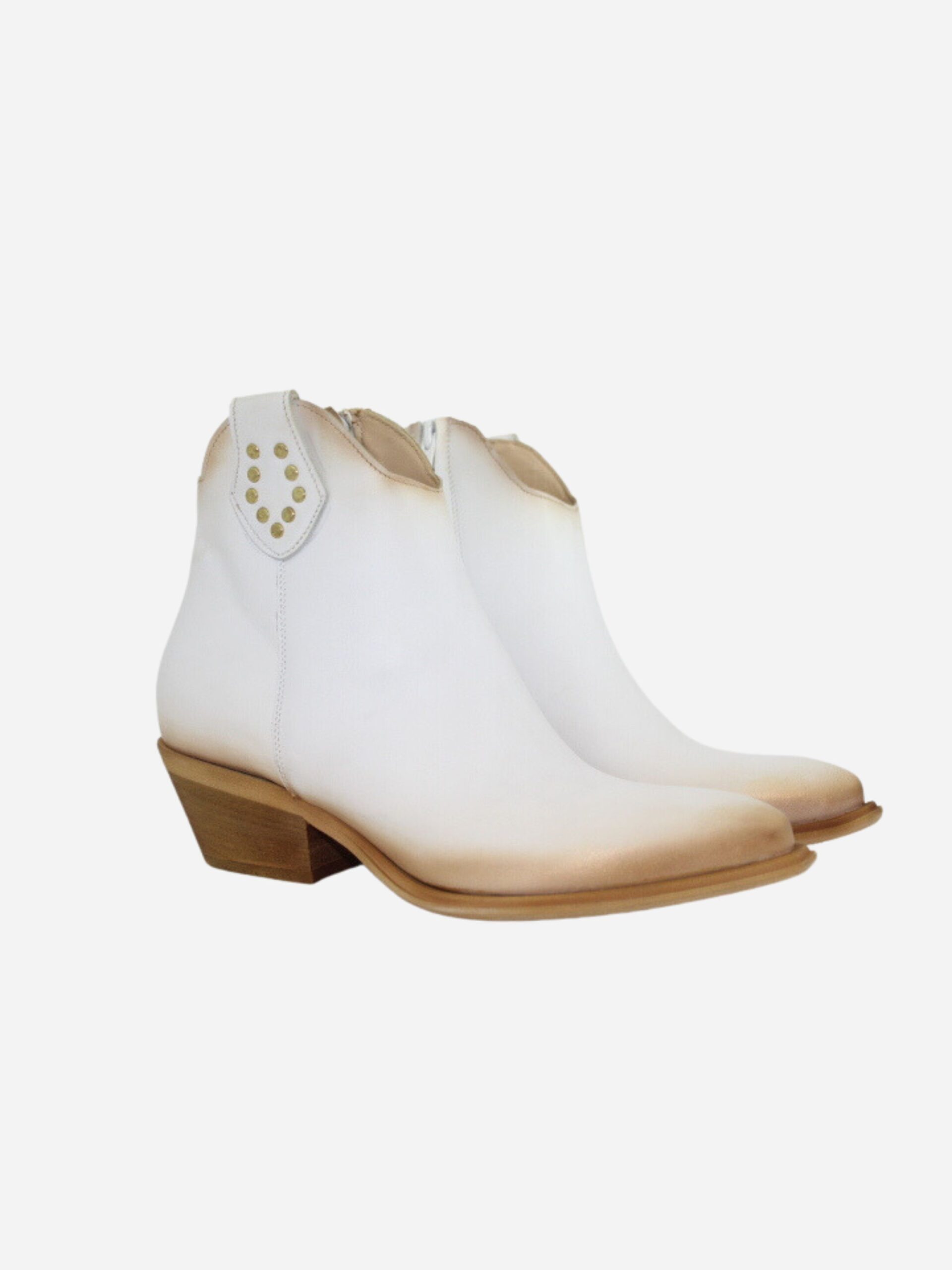 Texano by Divine Follie nella variante bianco/oro. Scarpe realizzate in nappa effetto invecchiato. Dettaglio con borchiette dorate applicate. Comodo tacco largo di 3 cm.