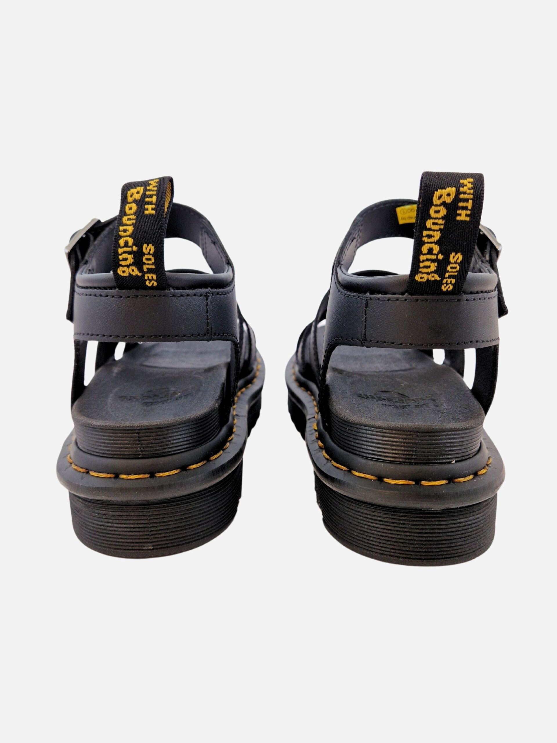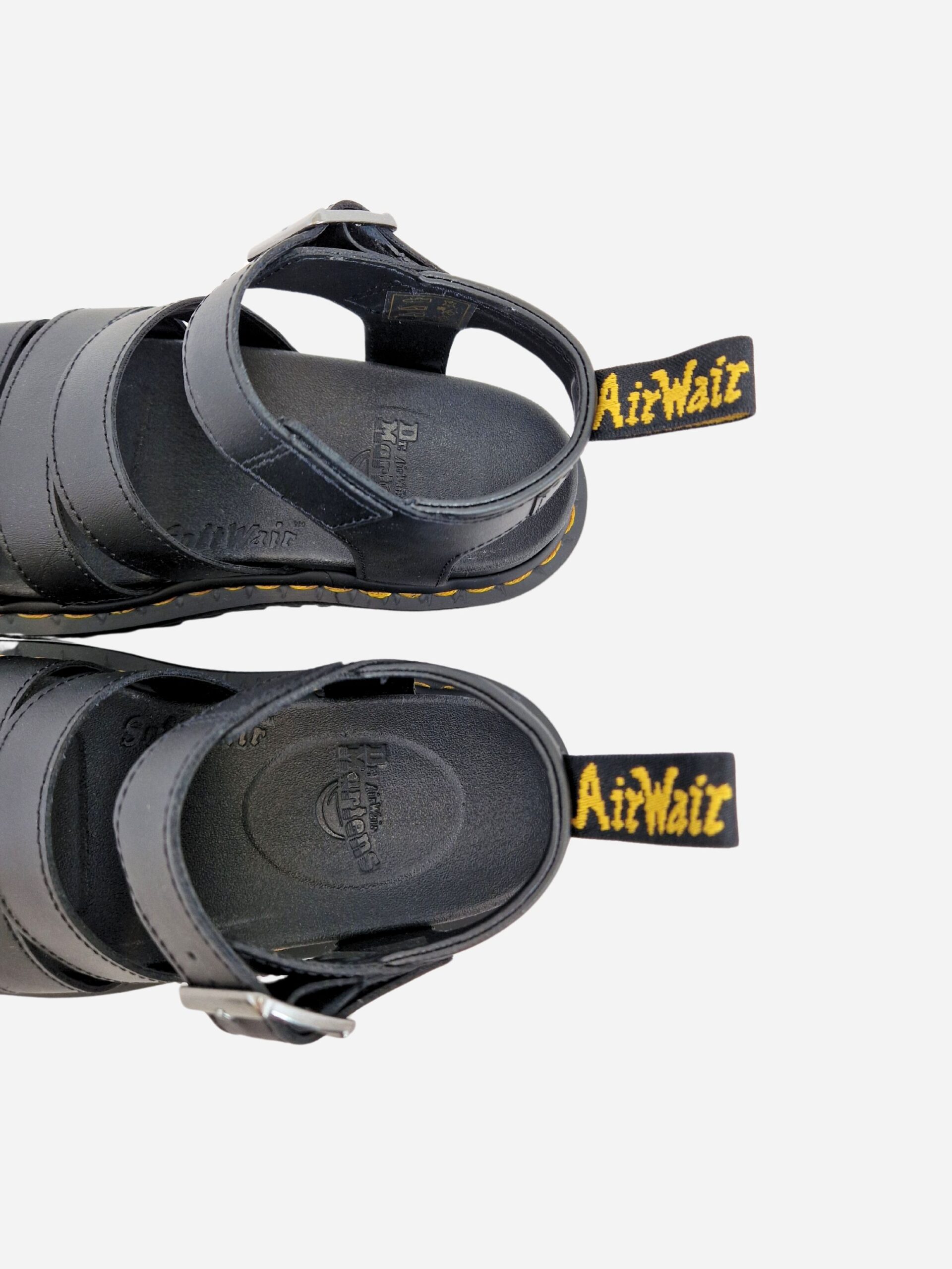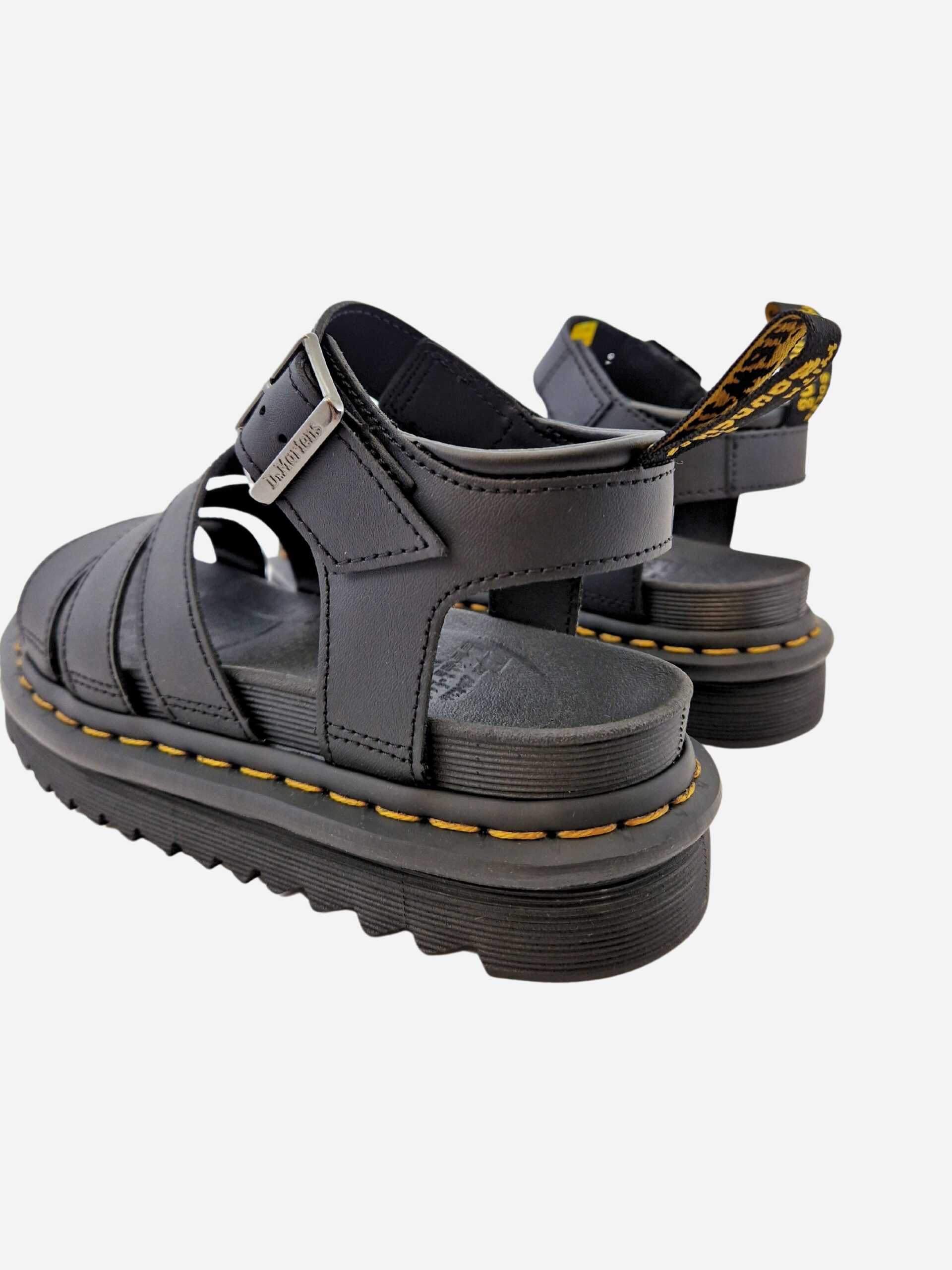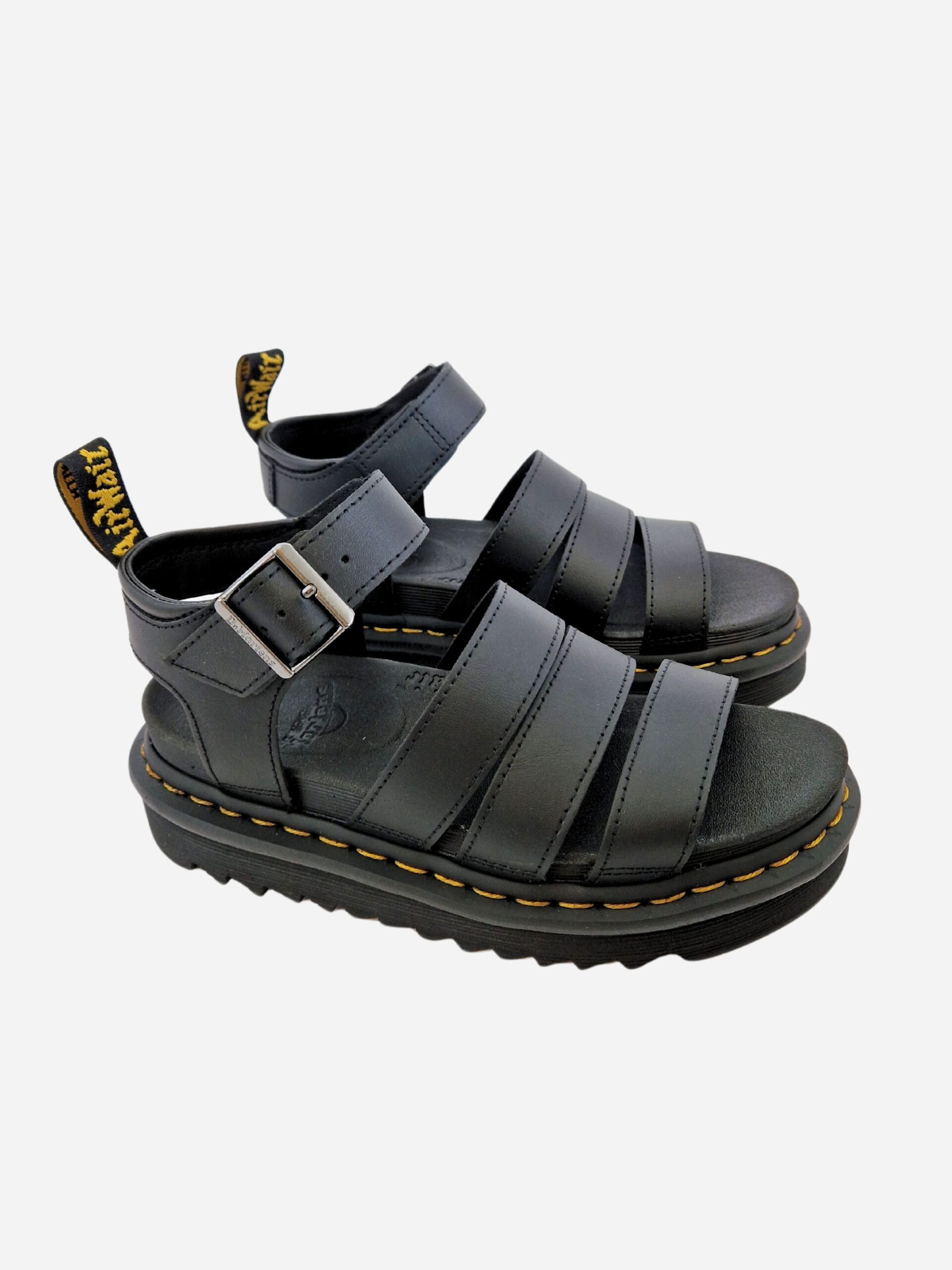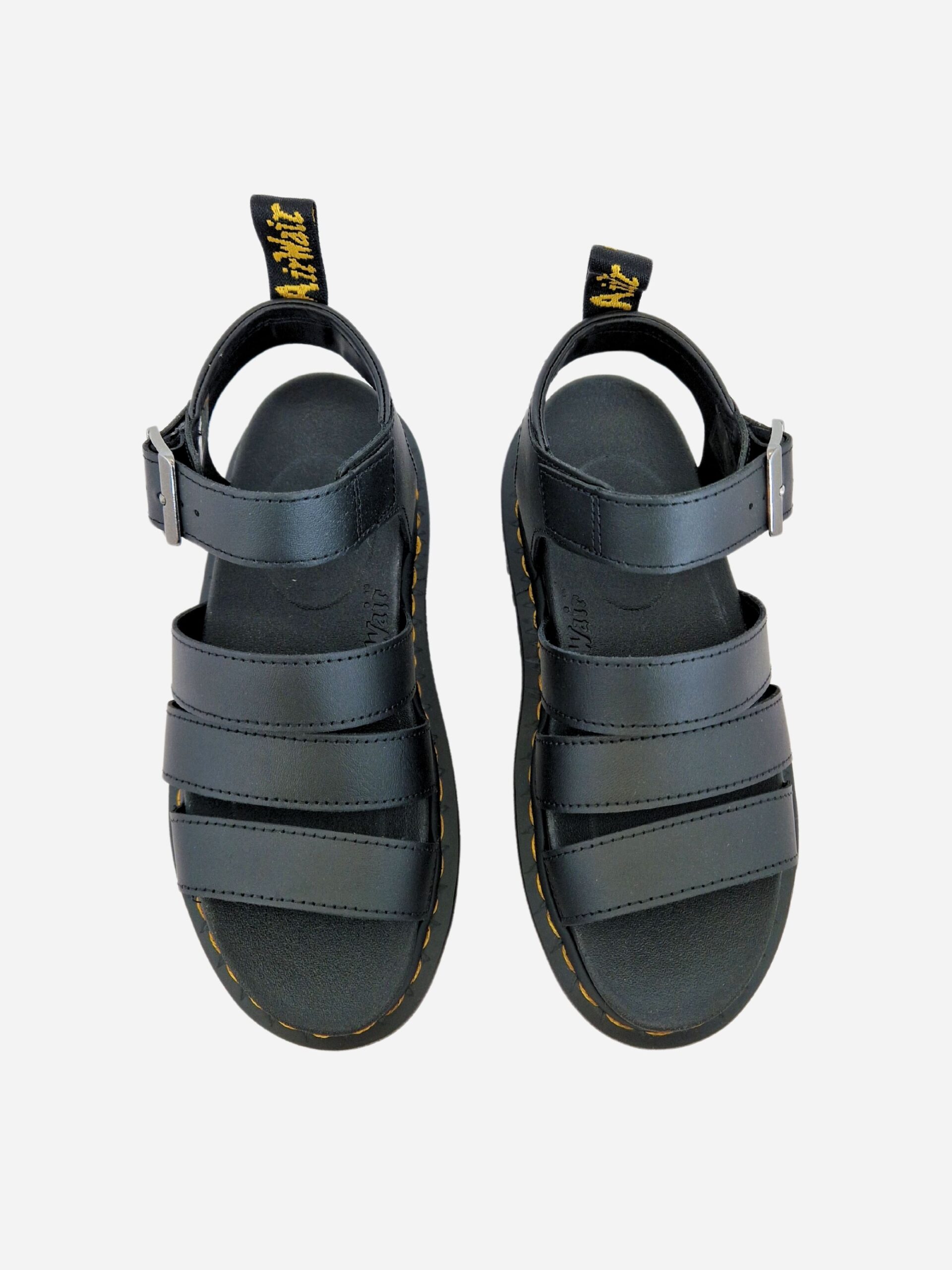 Sandali BLAIRE by Dr. Martens. Sandali con tre fasce e cinturino alla caviglia con fibbia, realizzati in vera pelle con fondo in pelle e tessuto. Suola in PVC. Cuciture gialle a contrasto, segno distintivo del brand.