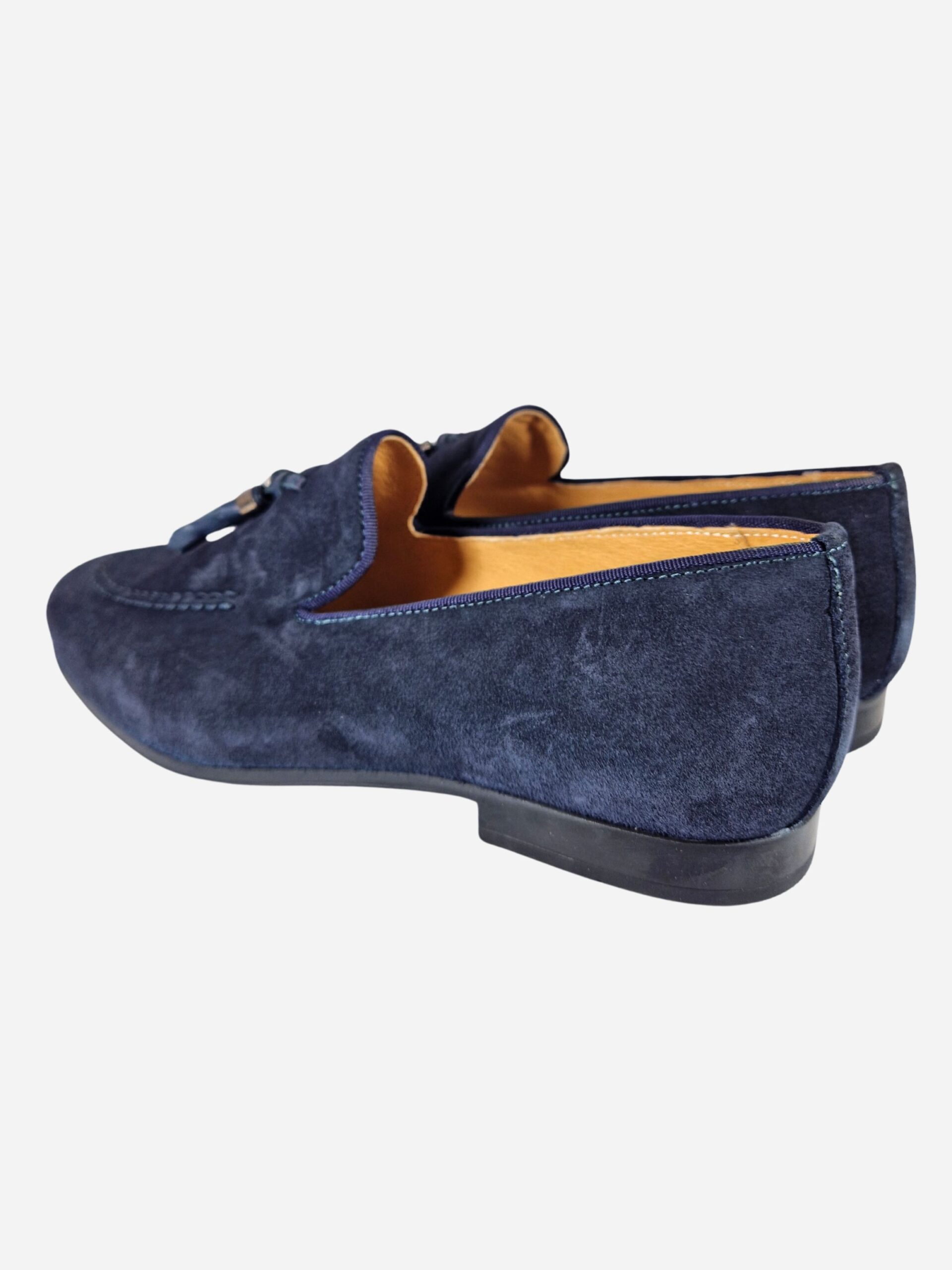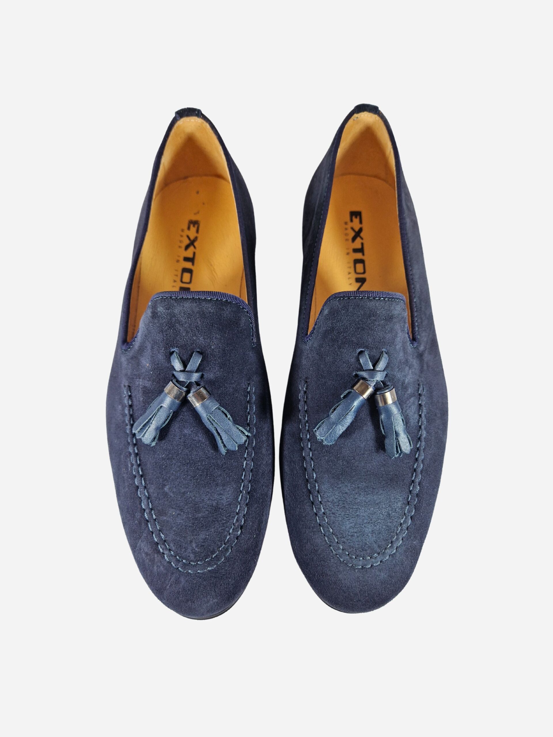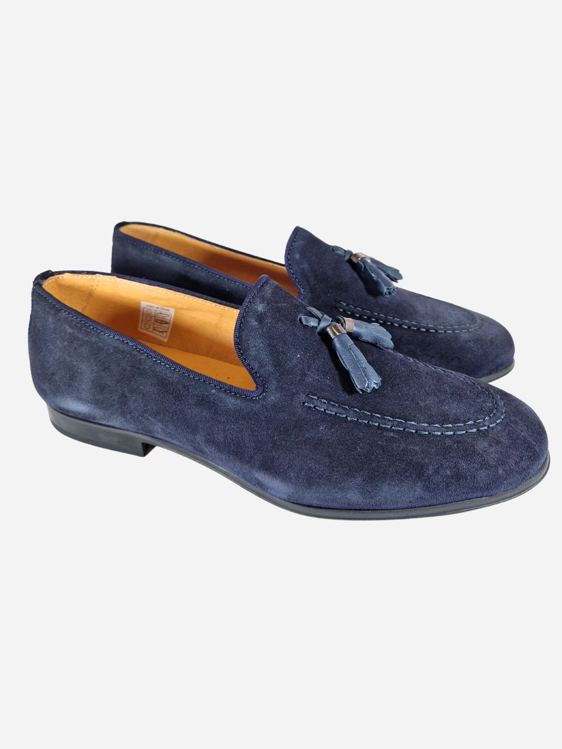 Mocassini by Exton. Calzature realizzate in pelle scamosciata con fondo in cuoio, arricchite da una nappina decorativa. Suola in gomma.