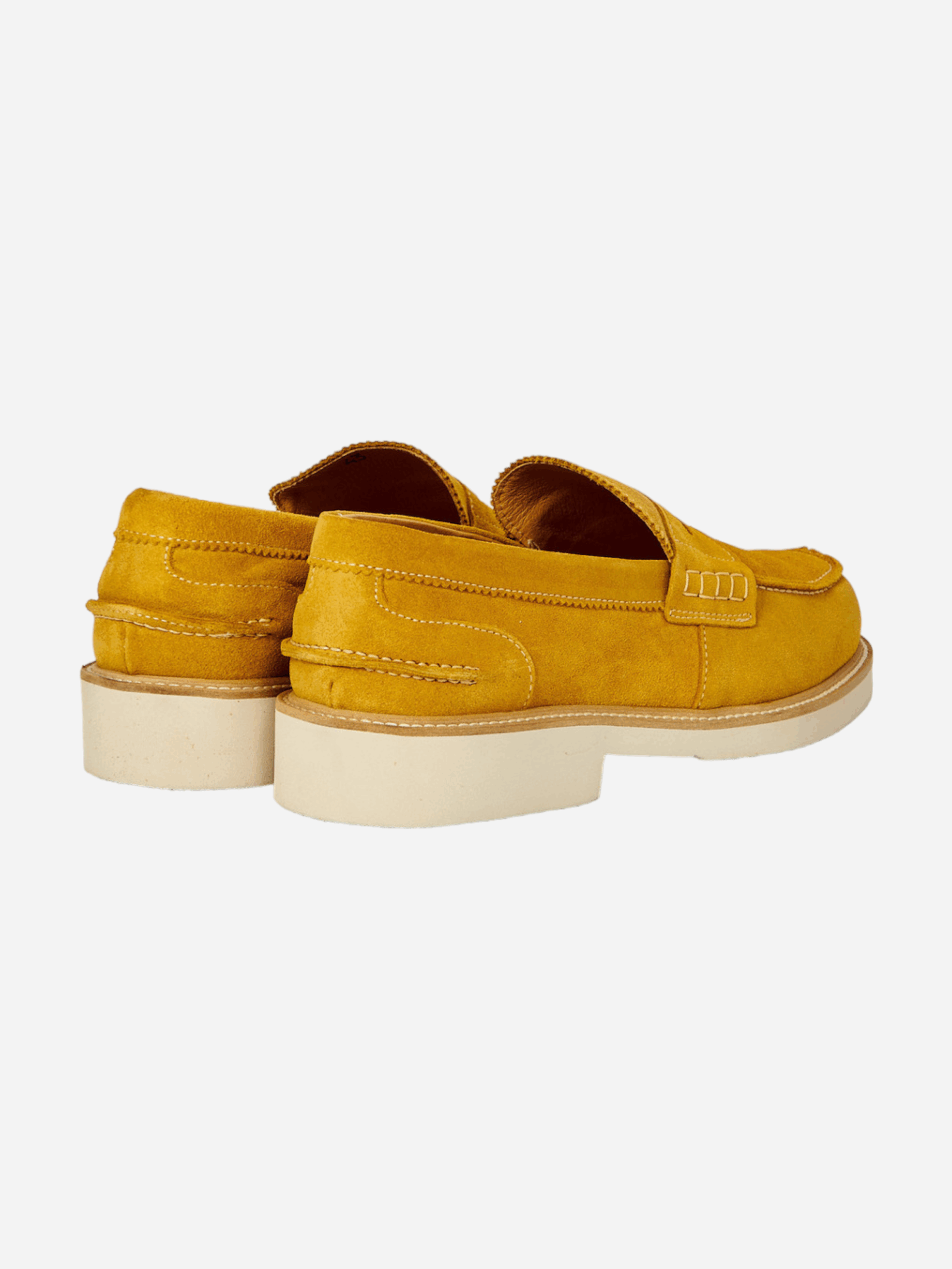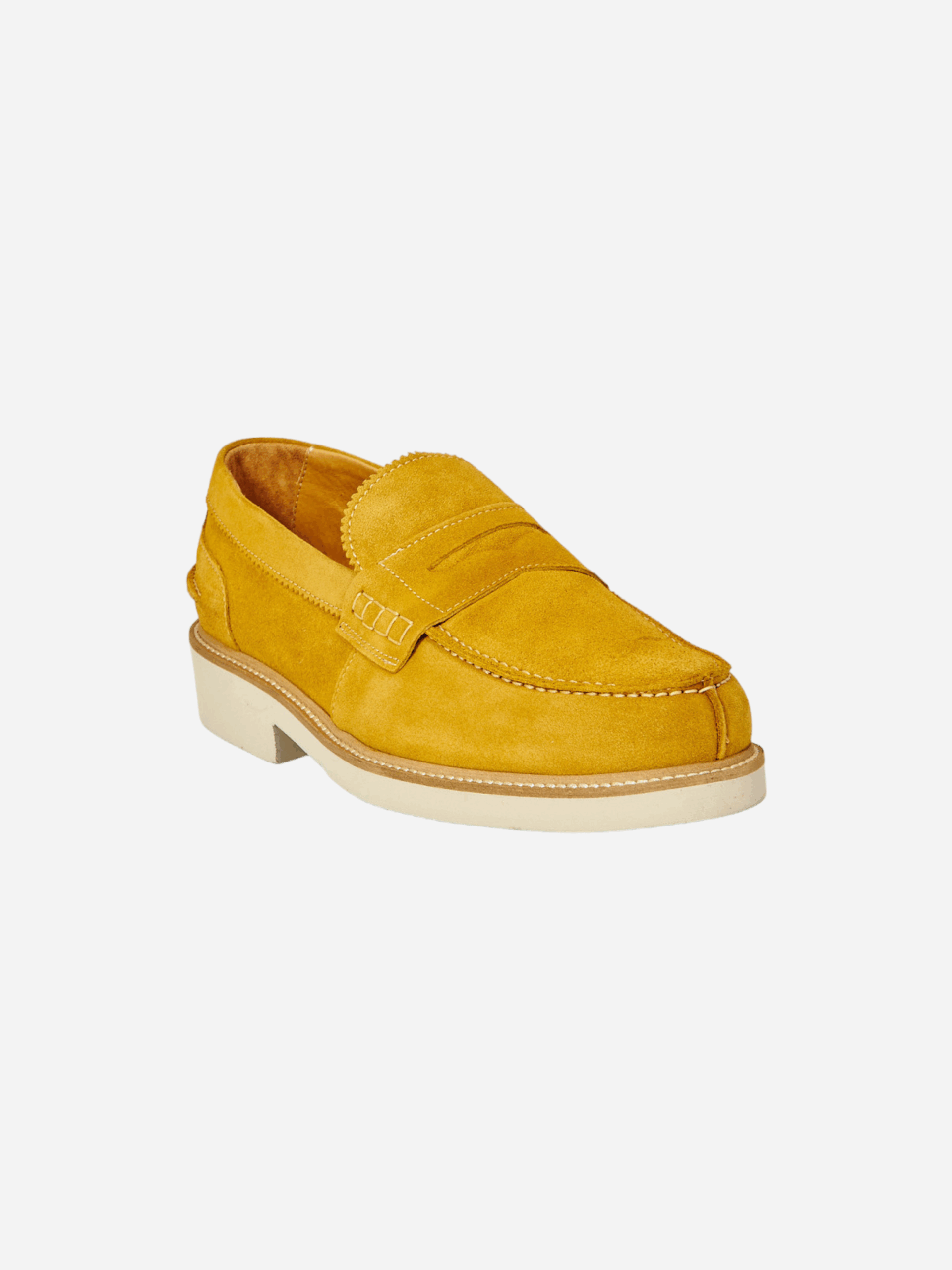 Mocassino AE20E di Exton. Mocassini in pelle scamosciata ocra con cuciture tono su tono e banda frontale a decorazione. Interno realizzato in vera pelle e fondo in cuoio.