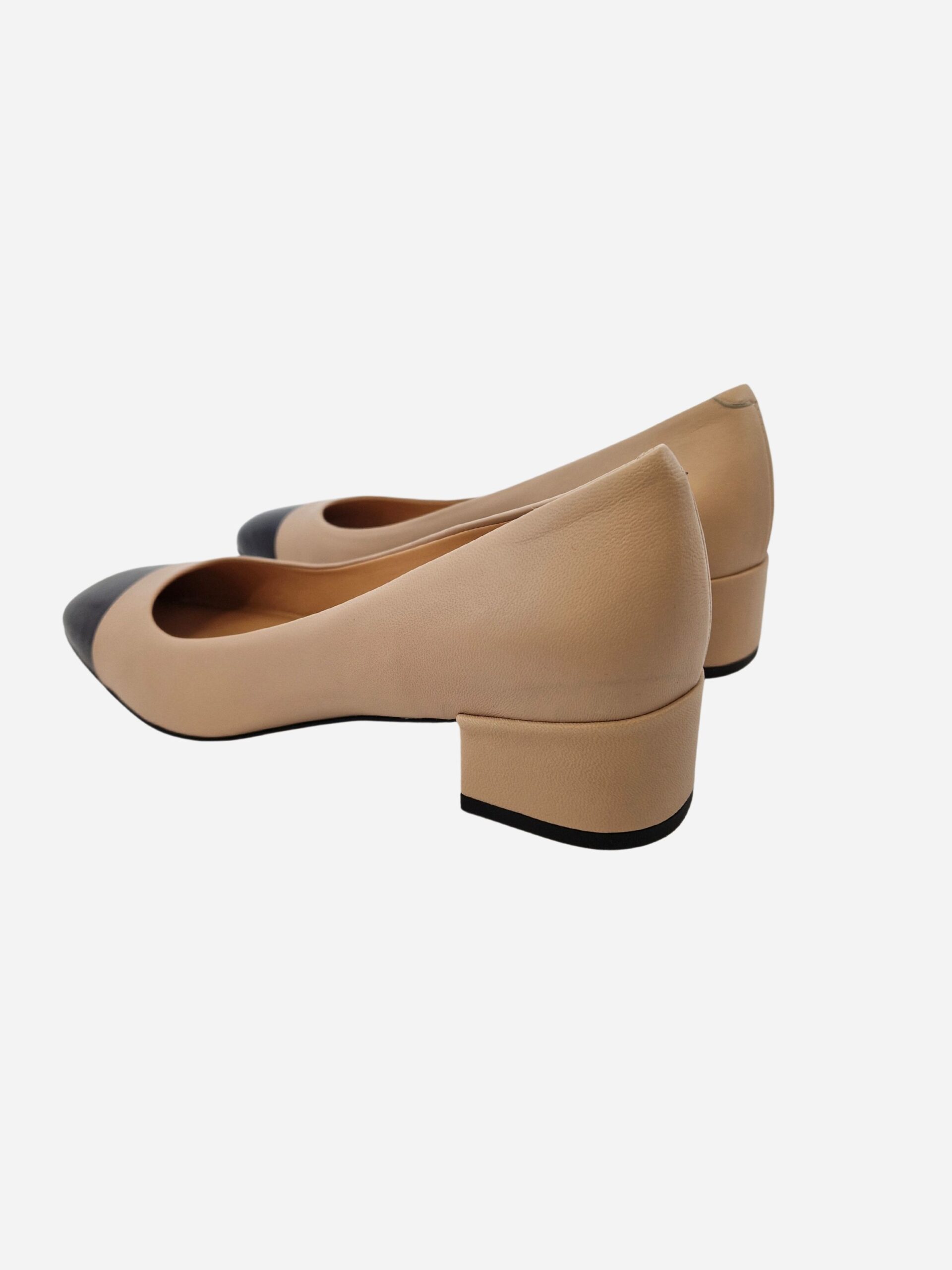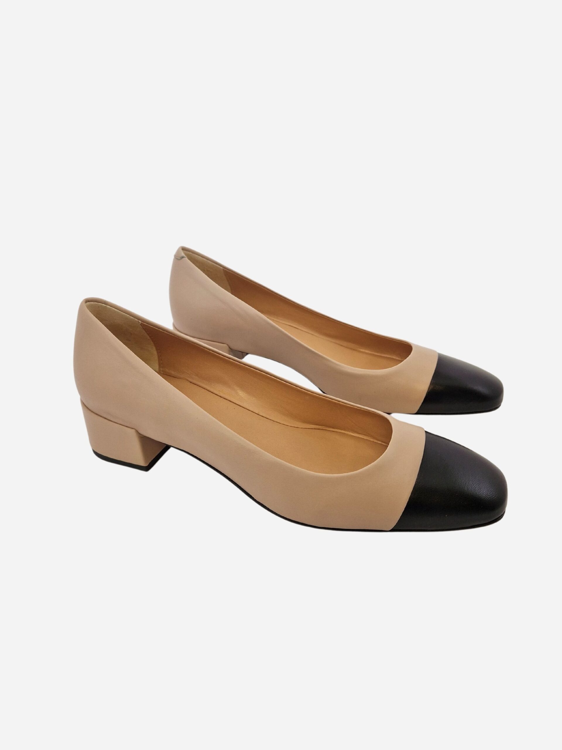 Ballerine by Franco Russo. Scarpe realizzate in nappa color beige con punta a contrasto nera e morbido fondo in cuoio. Comodo tacco largo di 4 cm. Made in Italy
