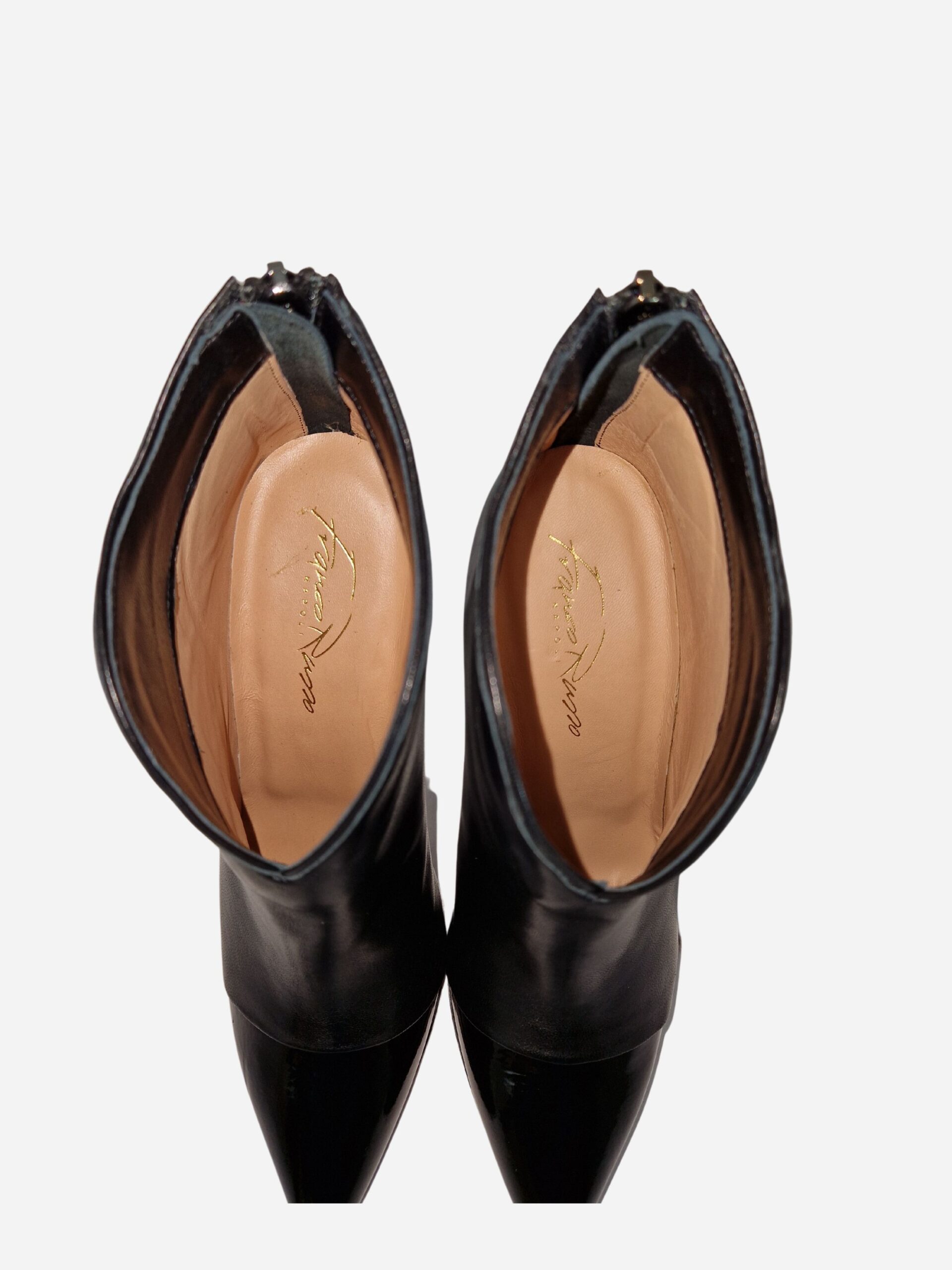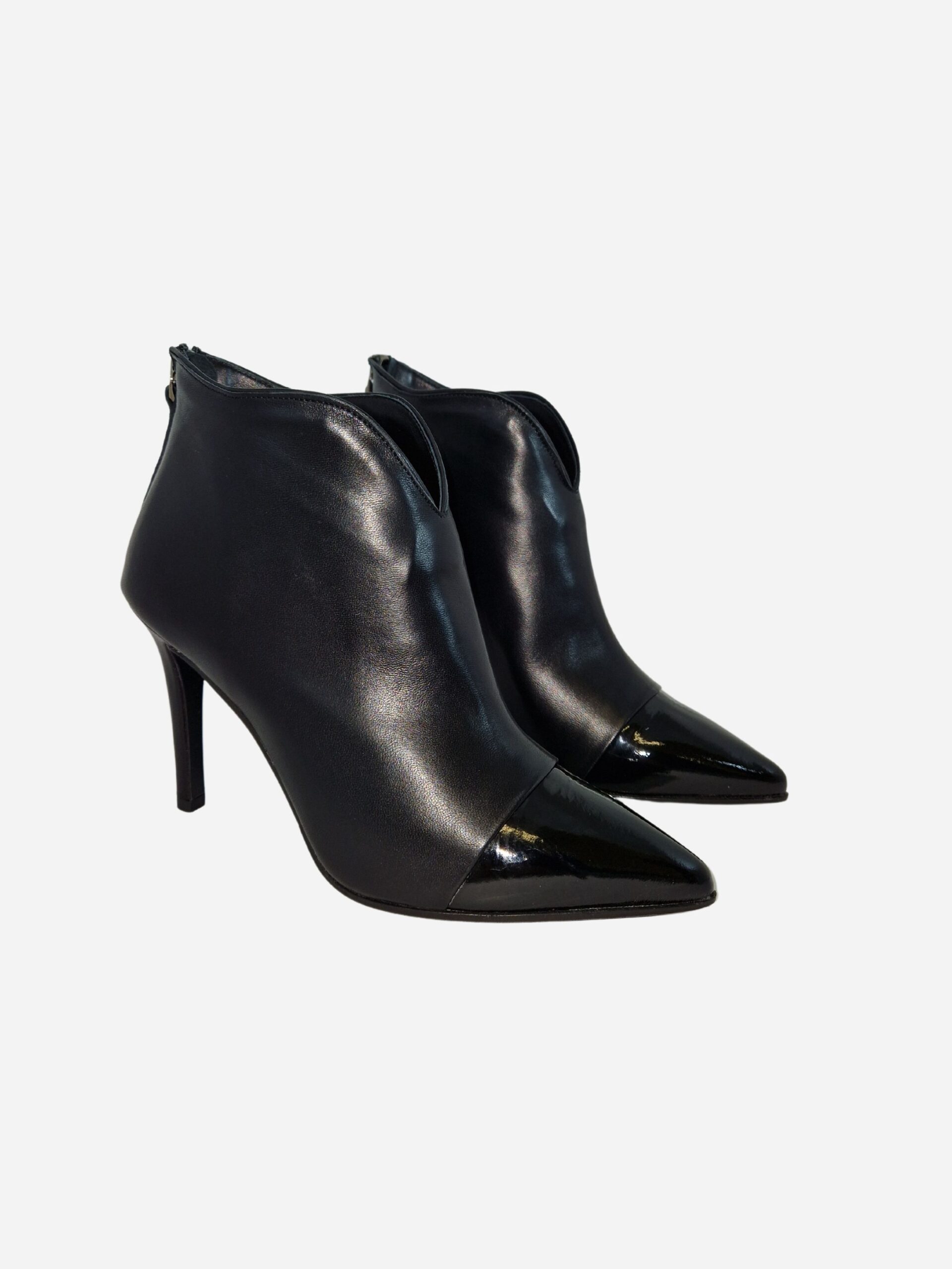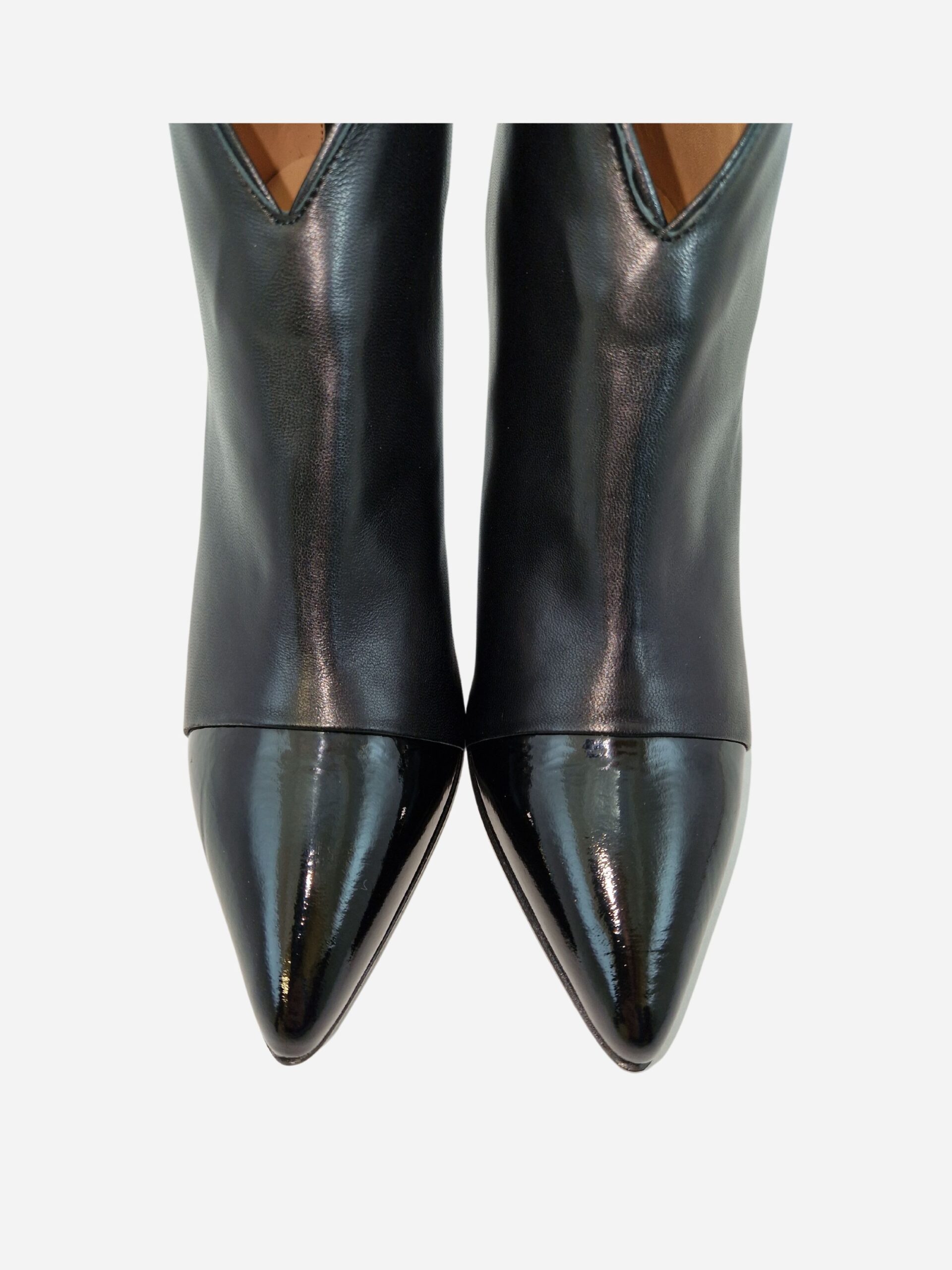 Tronchetti by Franco Russo. Stivaletti realizzati in nappa nera con inserti in naplak e morbido fondo in cuoio. Tacco a spillo di 9 cm. Chiusura con cerniera posteriore.