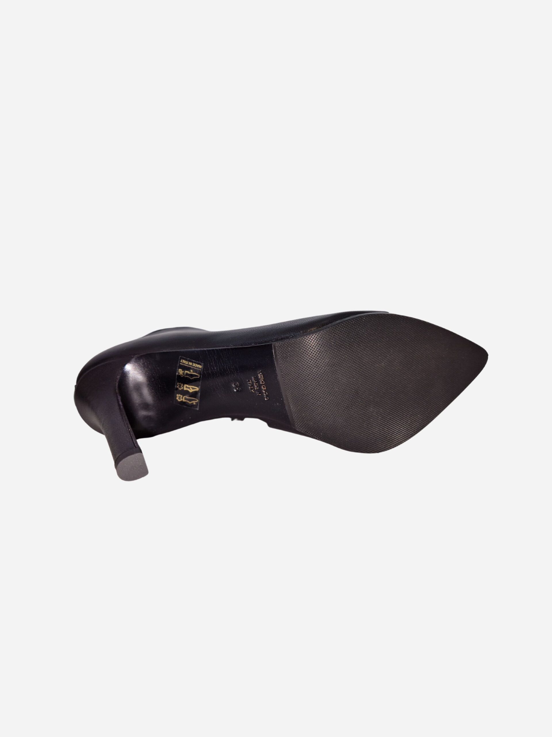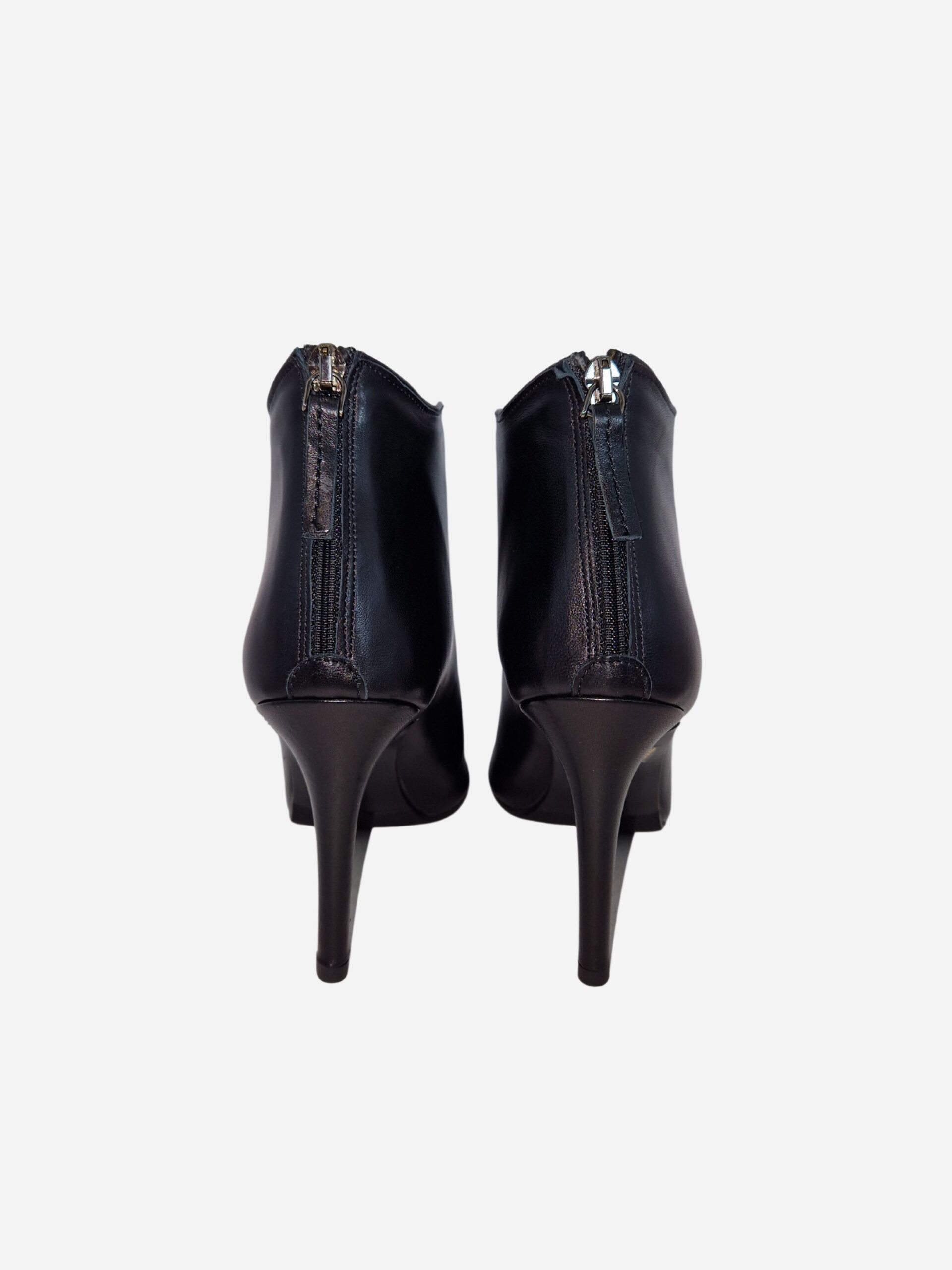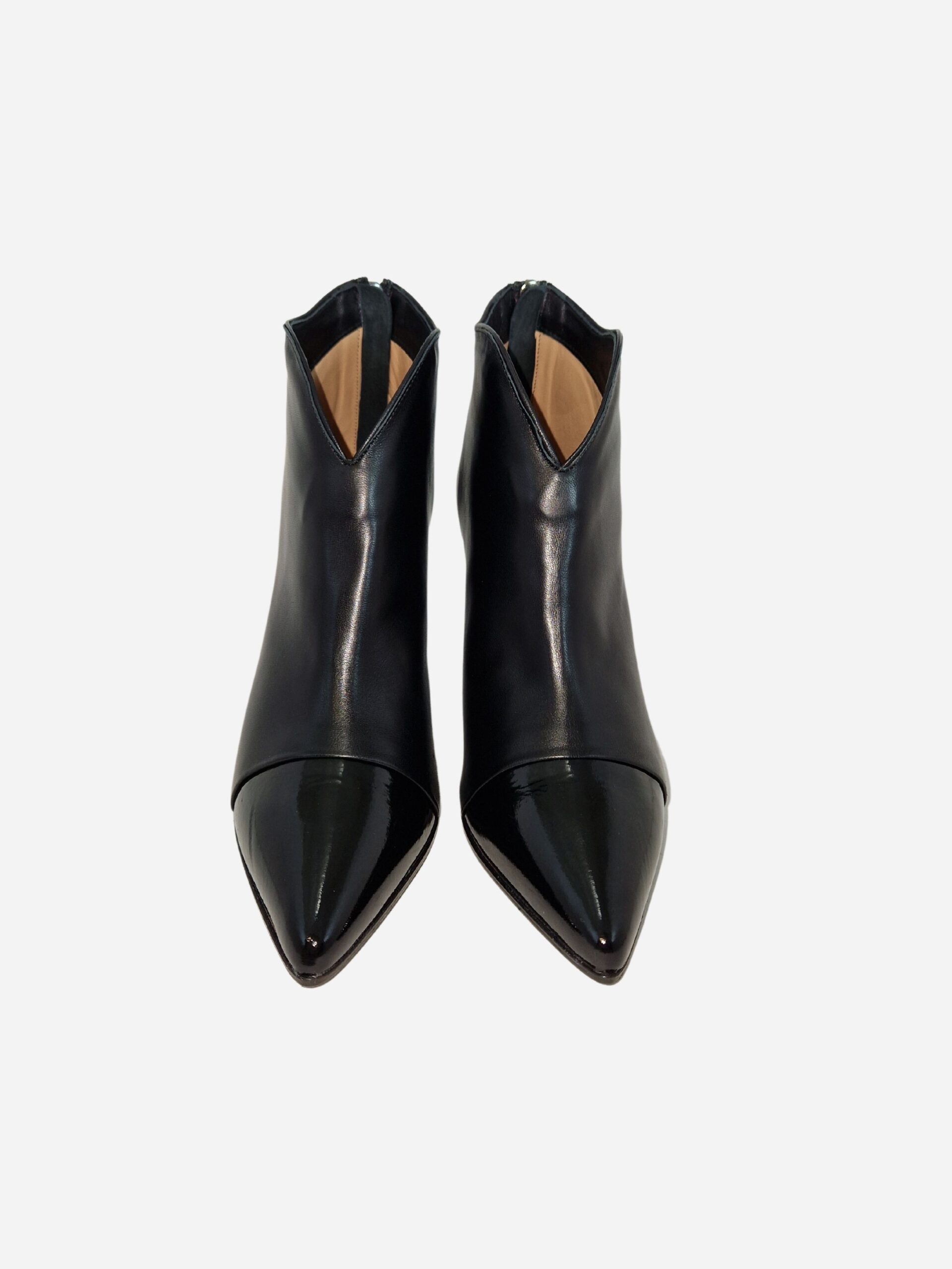 Tronchetti by Franco Russo. Stivaletti realizzati in nappa nera con inserti in naplak e morbido fondo in cuoio. Tacco a spillo di 9 cm. Chiusura con cerniera posteriore.