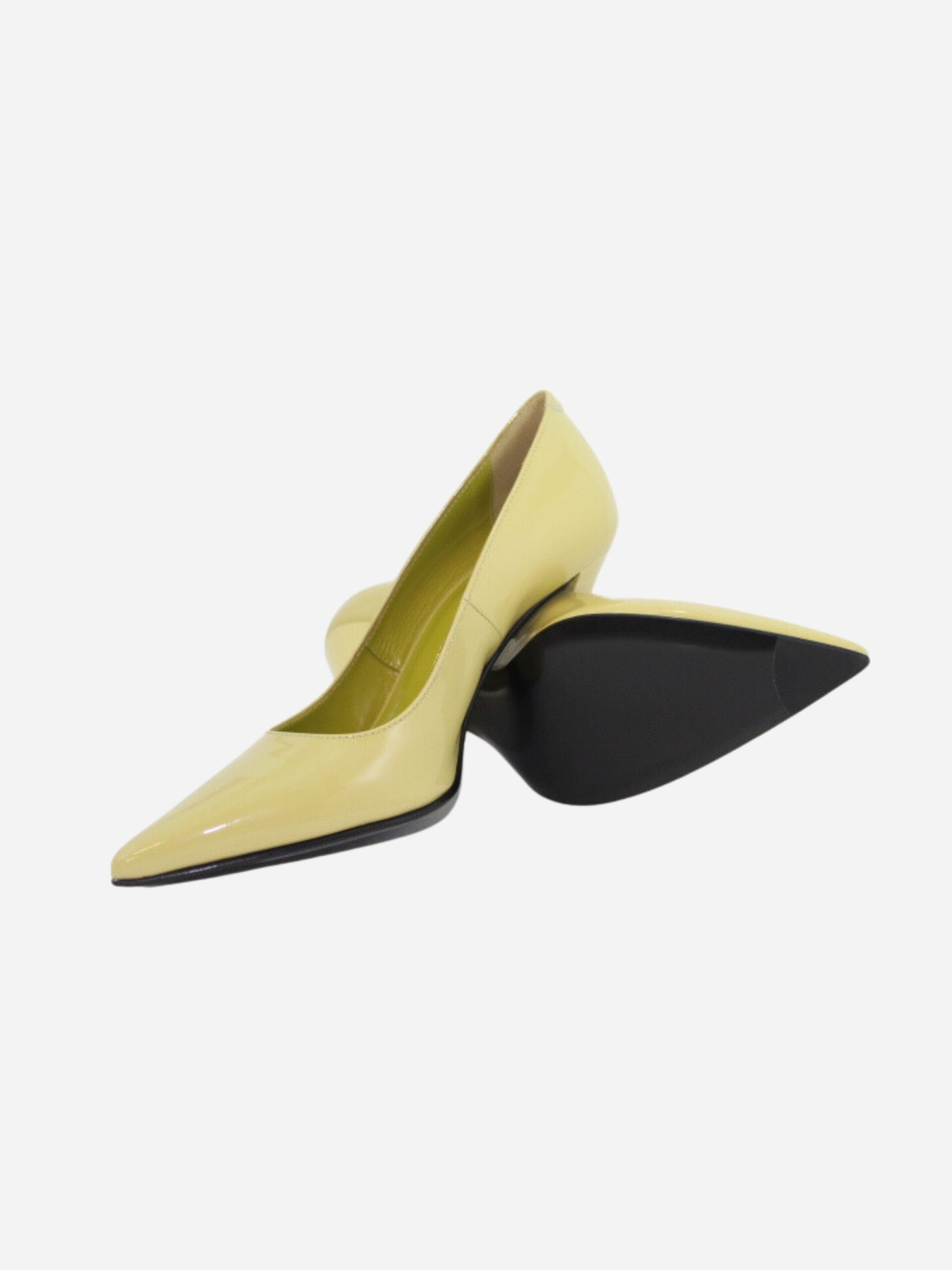 Décolleté by Giampaolo Viozzi. Scarpe realizzate in vera pelle verniciata nella variante verde acido con fondo in cuoio e suola in materiale sintetico pregiato. Tacco leggermente concavo di 10 cm.