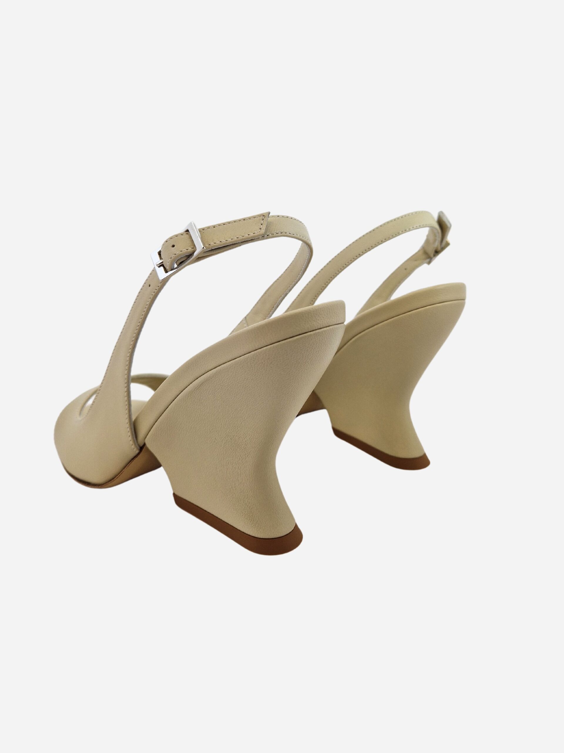 Sandalo con zeppa by Giampaolo Viozzi. Calzature realizzate in vera pelle, con morbido fondo in cuoio e suola in materiale sintetico. Chiusura con cinturino al tallone. Punta arrotondata. Zeppa di 10 cm.