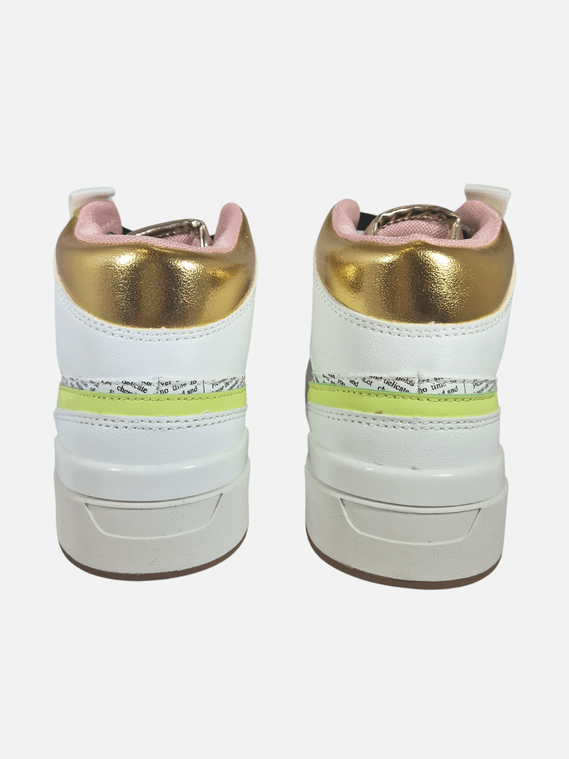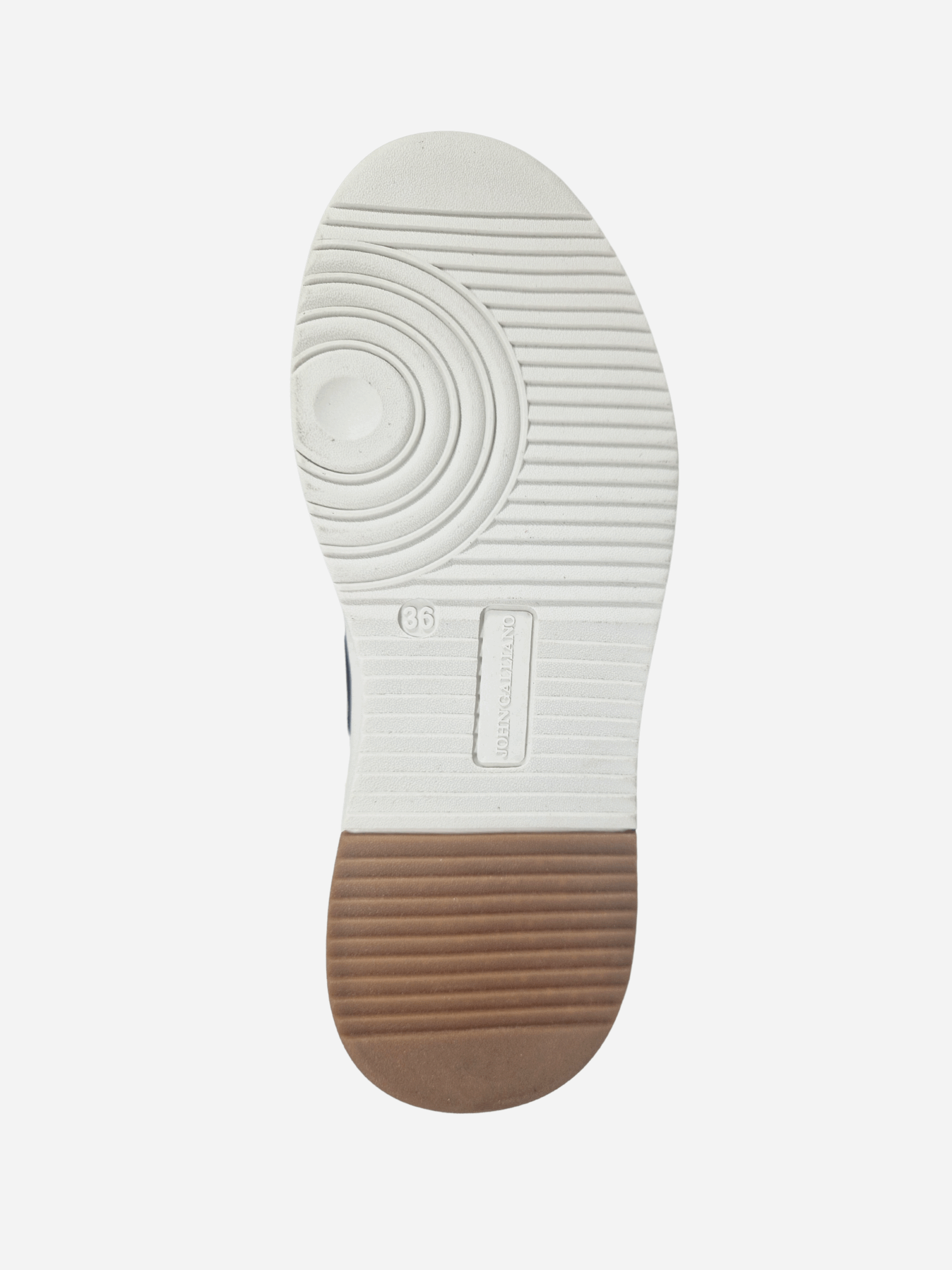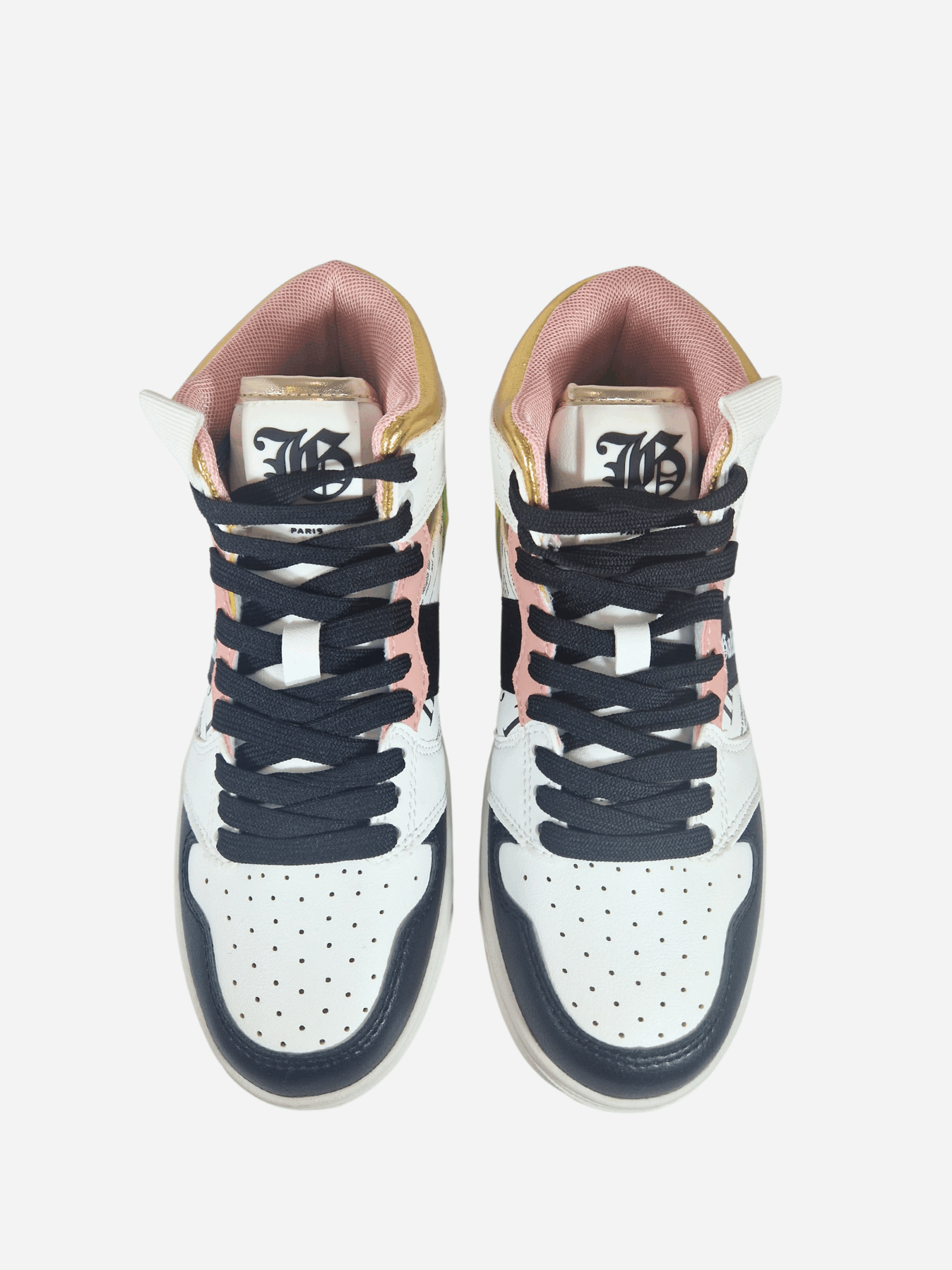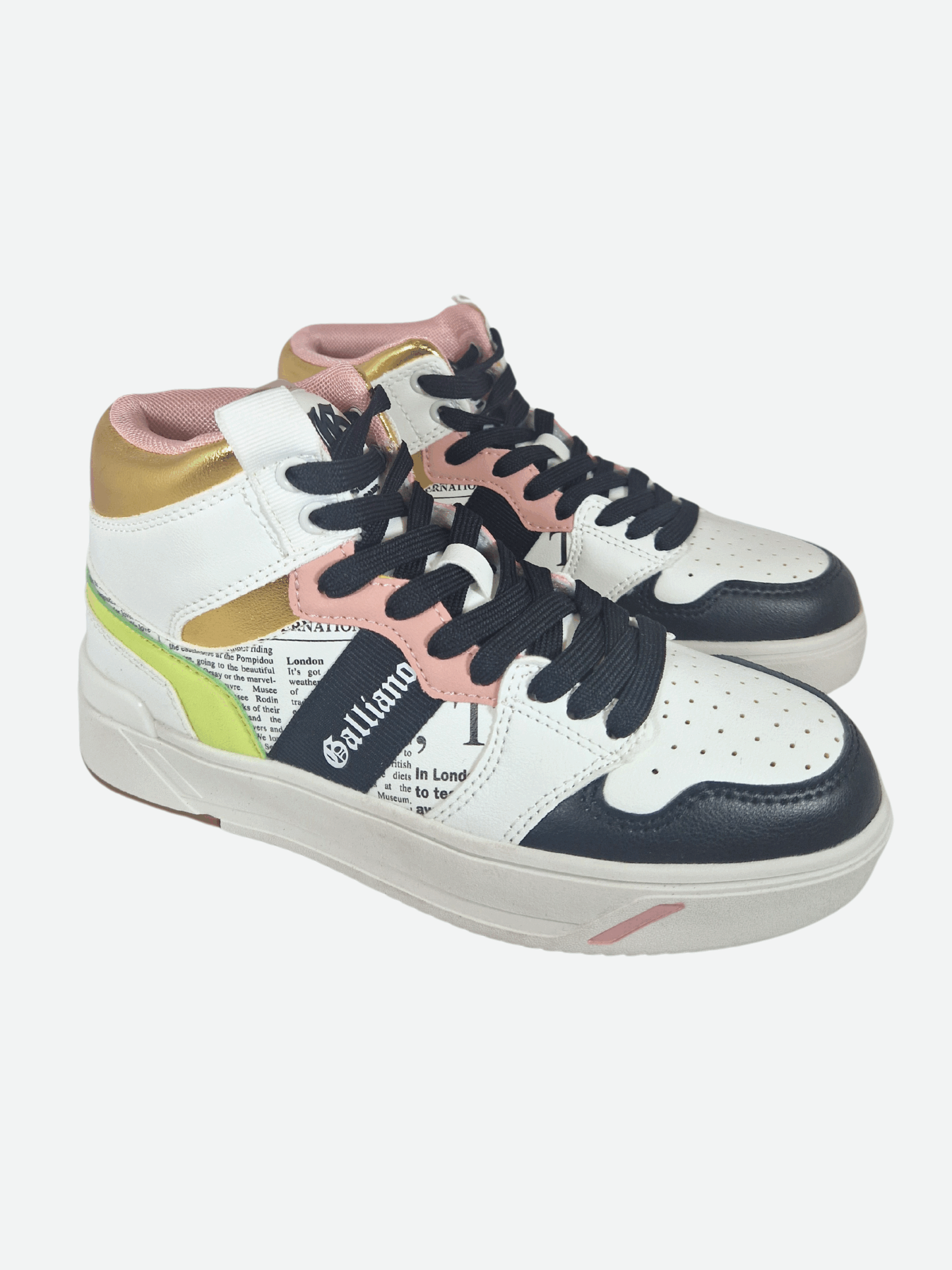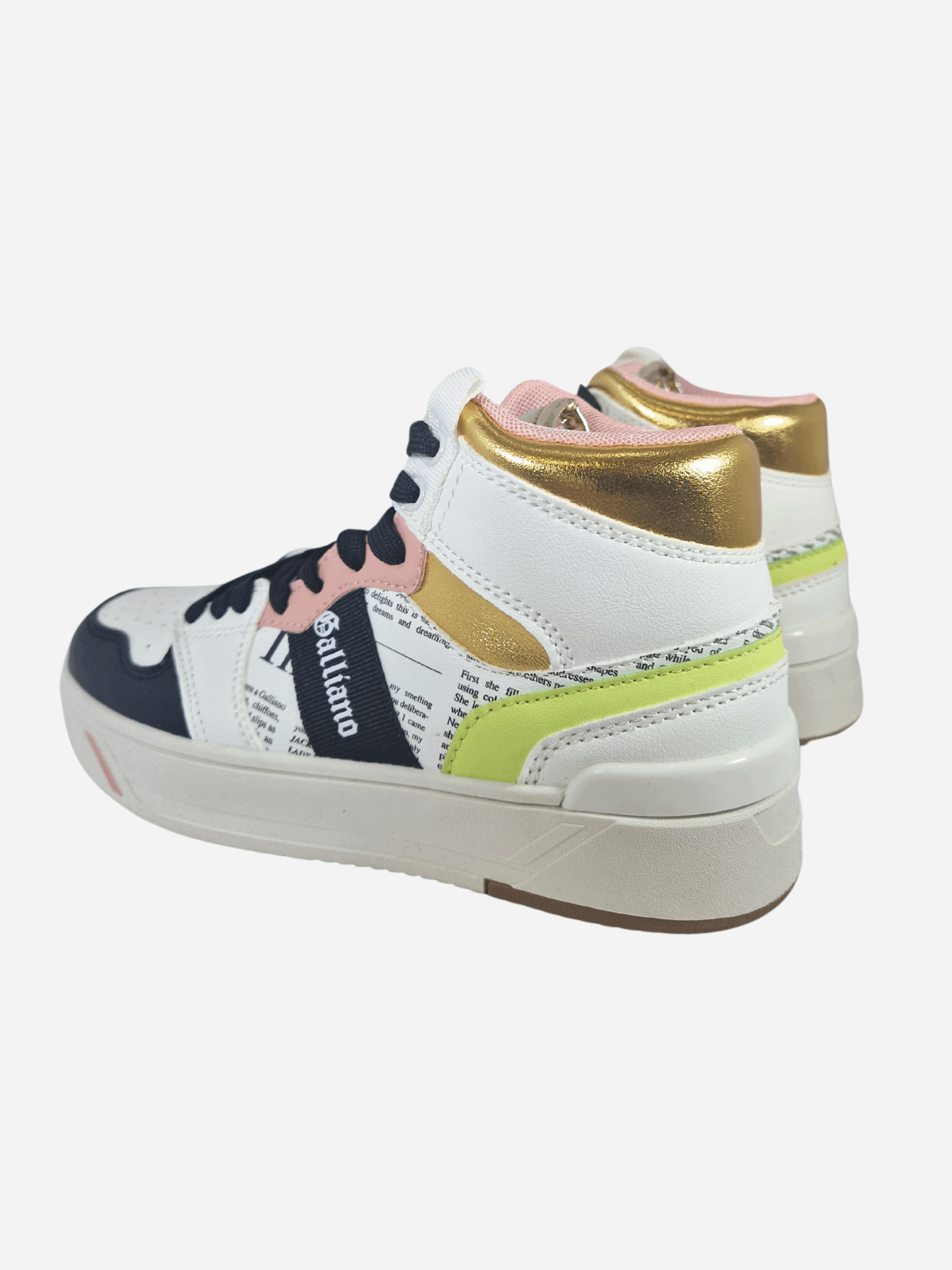 Sneakers alte by John Galliano realizzate in pelle di vitello con interno in tessuto. Caratterizzate dall’iconica fantasia a giornale e inserti in pelle multicolor a contrasto. Suola in gomma.