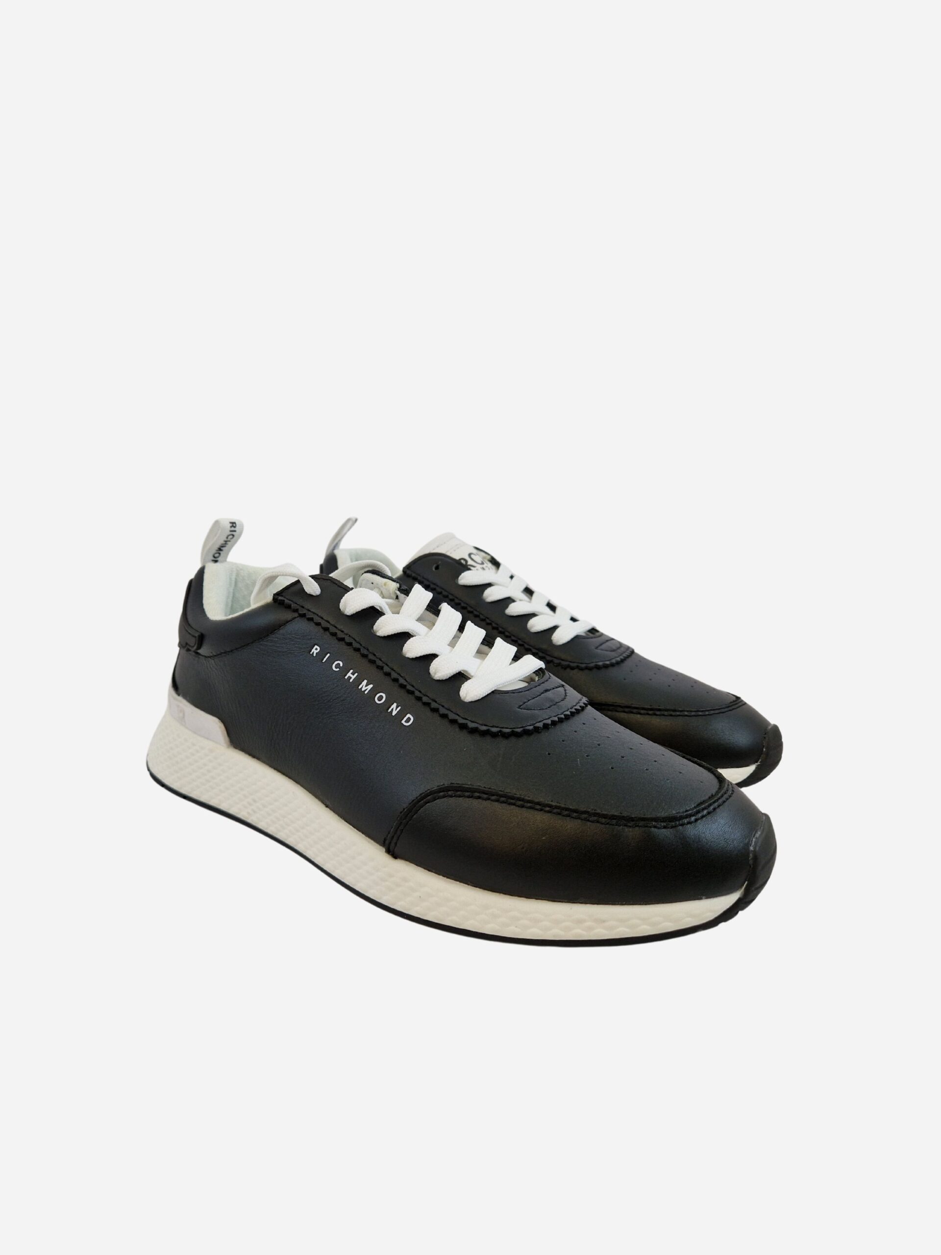Sneakers da uomo by John Richmond. Scarpe realizzate in vera pelle nera con dettagli bianchi a contrasto. Suola in gomma leggermente rialzata.