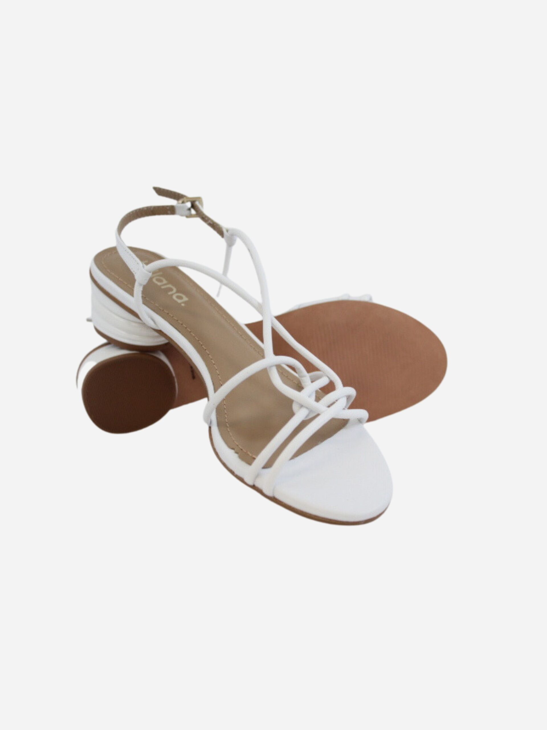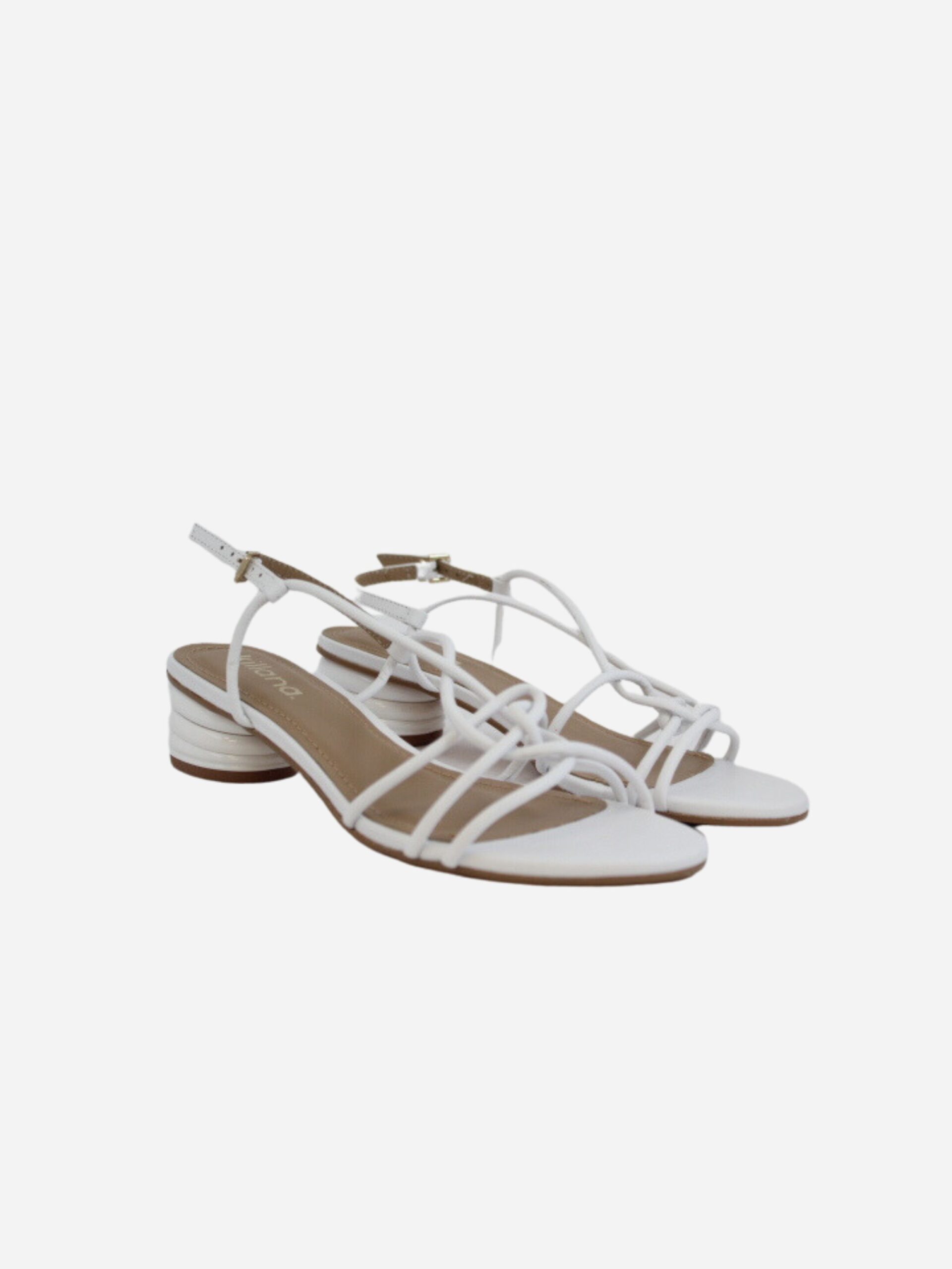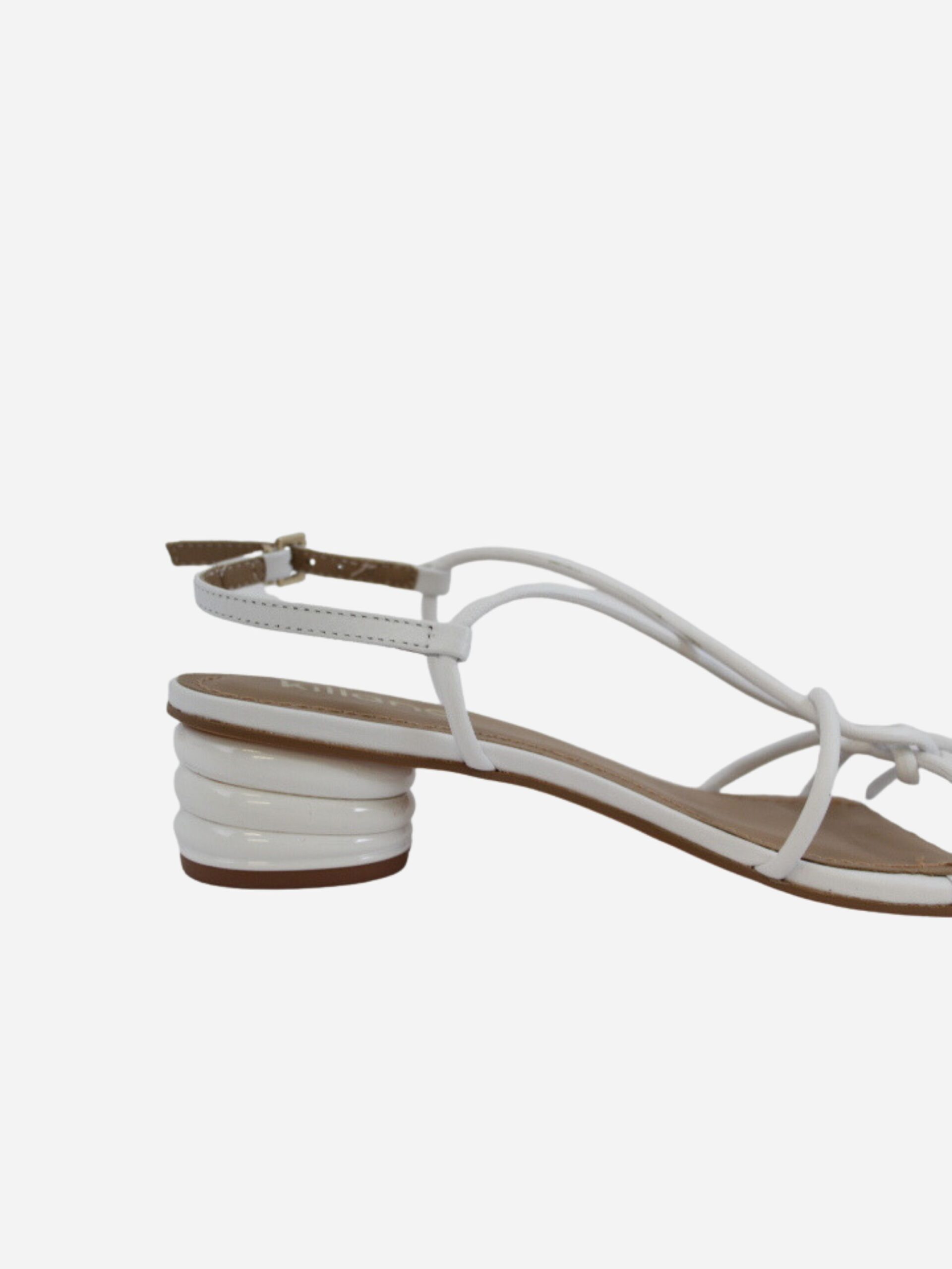 Sandalo bianco con fascette. Tacco largo con dettagli in rilievo. Chiusura con cinturino