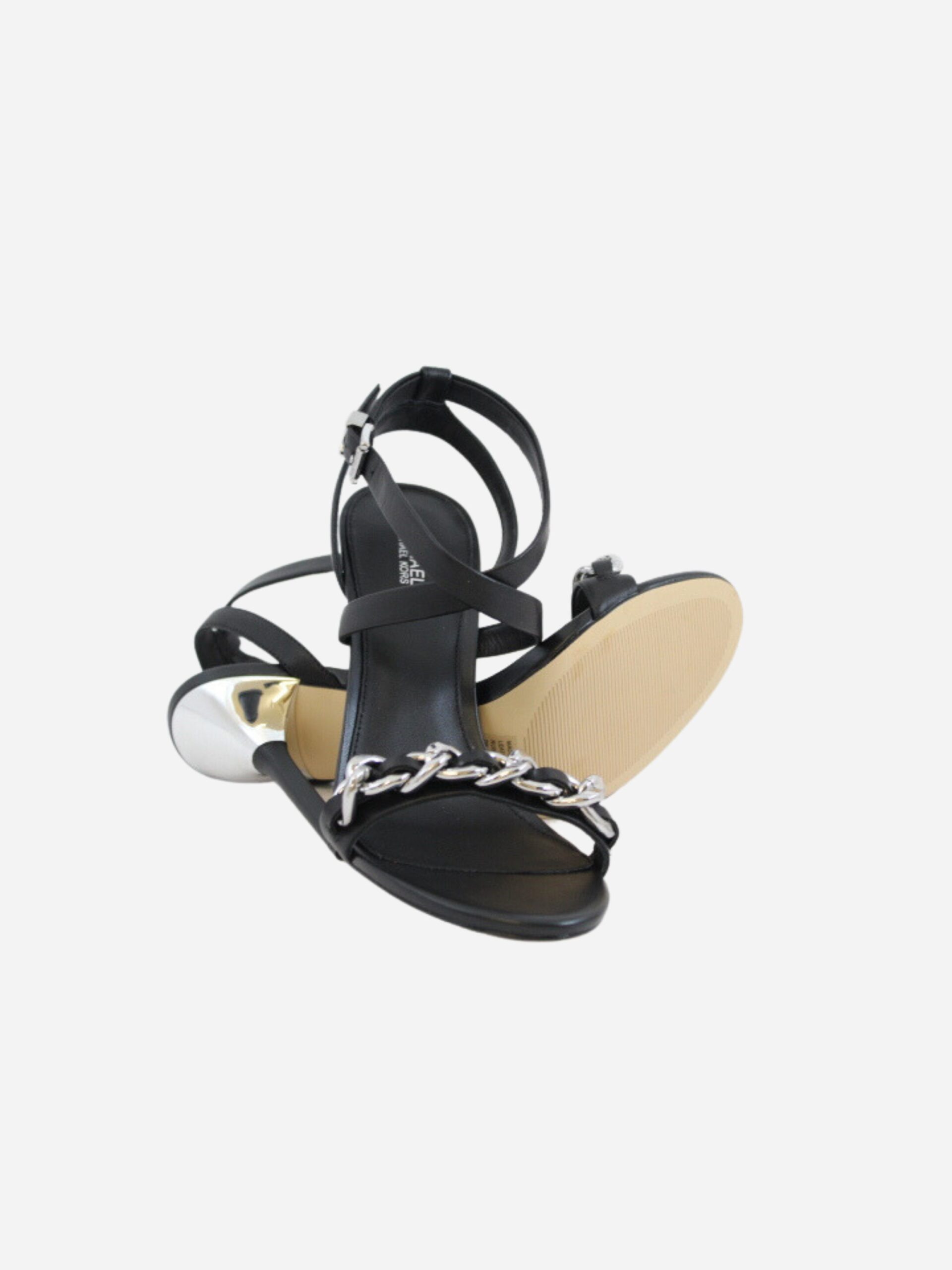 Sandalo in pelle con fascette incrociate alla caviglia decorato con catena in metallo. Dettaglio con logo sul cinturino ed effetto specchio sul retro.