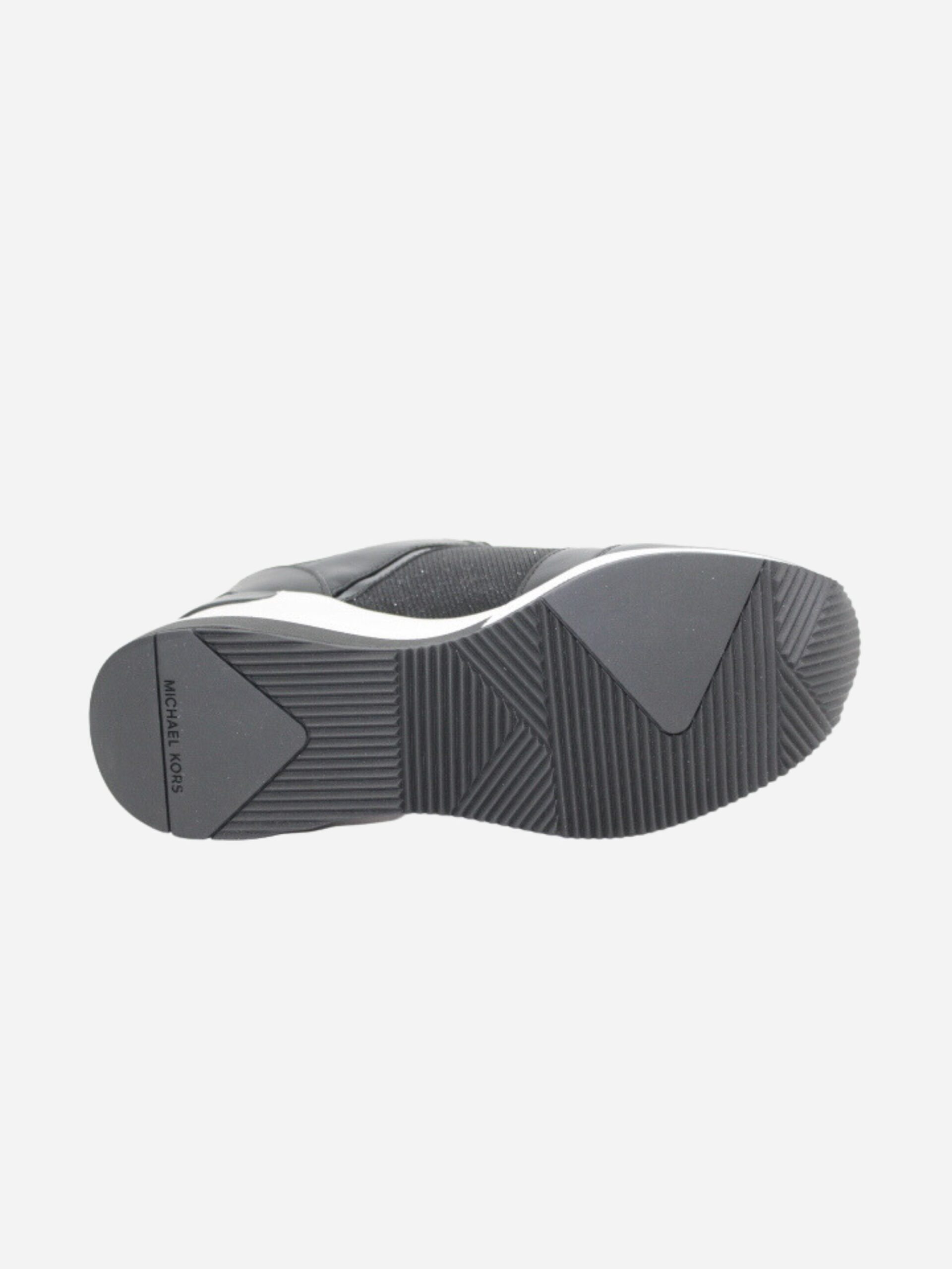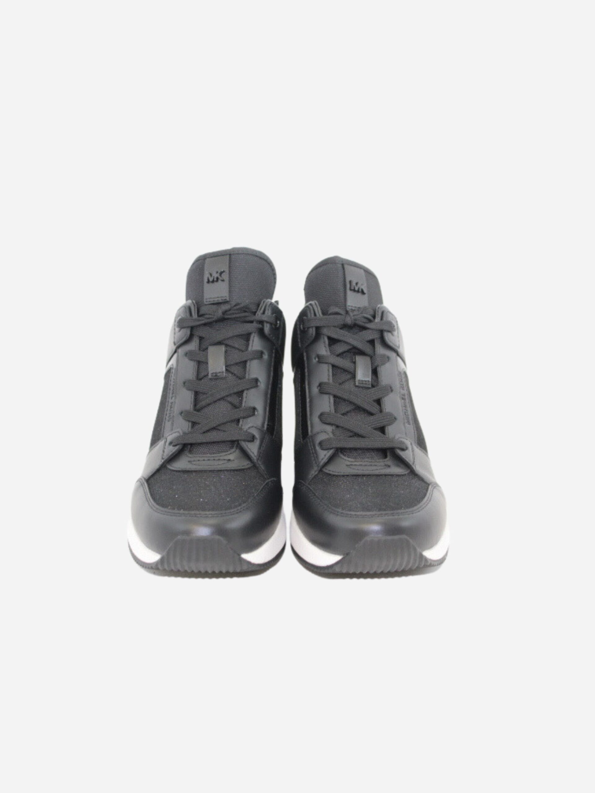 Sneakers con zeppa by Michael Kors. Scarpe realizzate in similpelle con inserti in tessuto nero glitterato. Fondo alto di 6 cm. Chiusura con lacci.