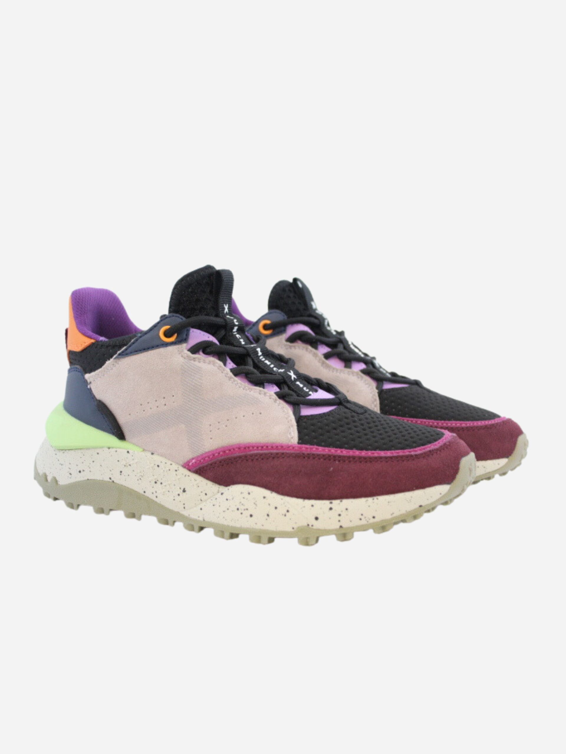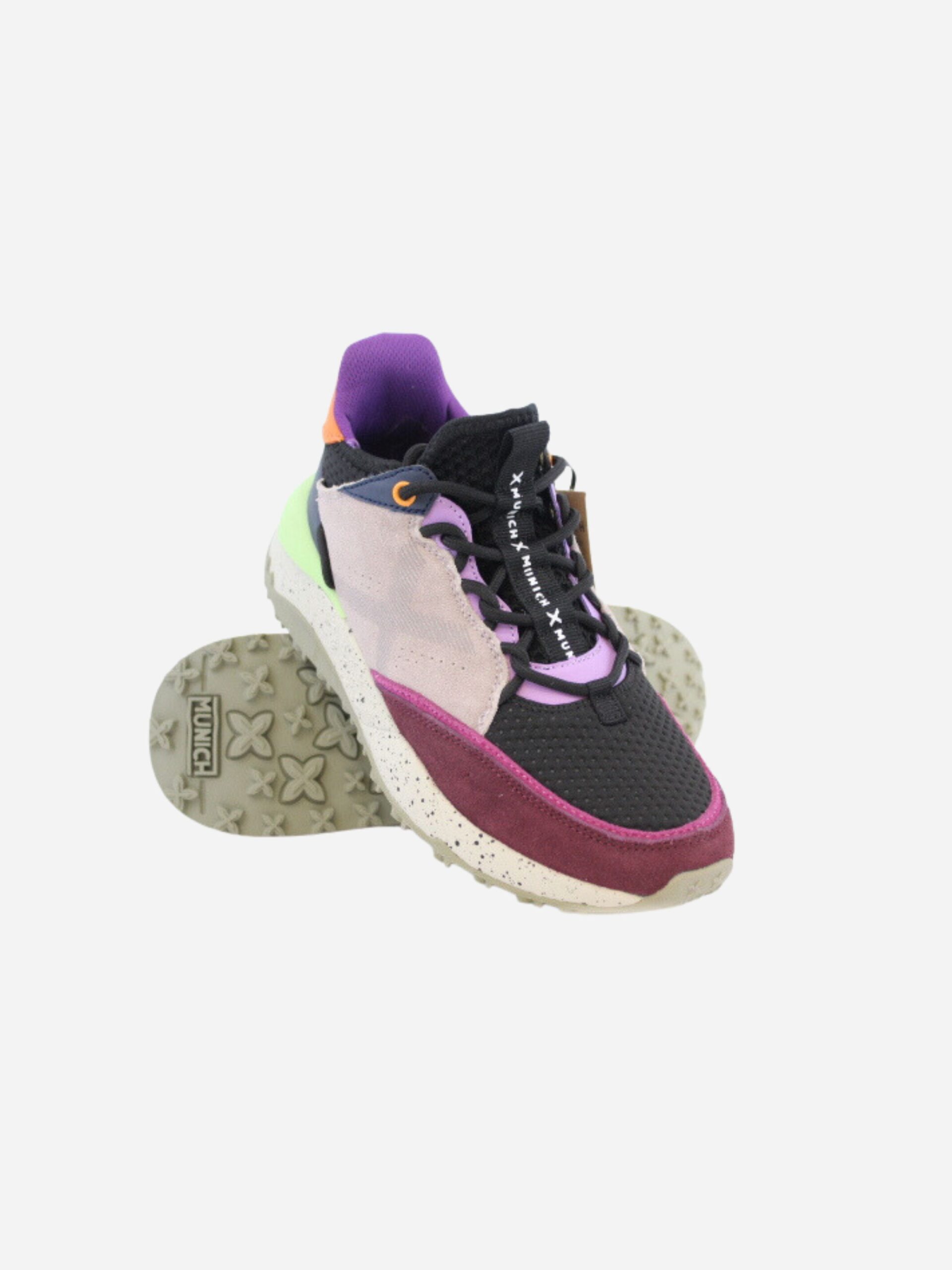 Sneakers DORO 27 WMN by Munich. Scarpe in stile scarponcino realizzate in vera pelle scamosciata con inserti colorati a contrasto verde, arancione e fuxia. Suola in gomma leggermente rialzata. Chiusura con lacci.