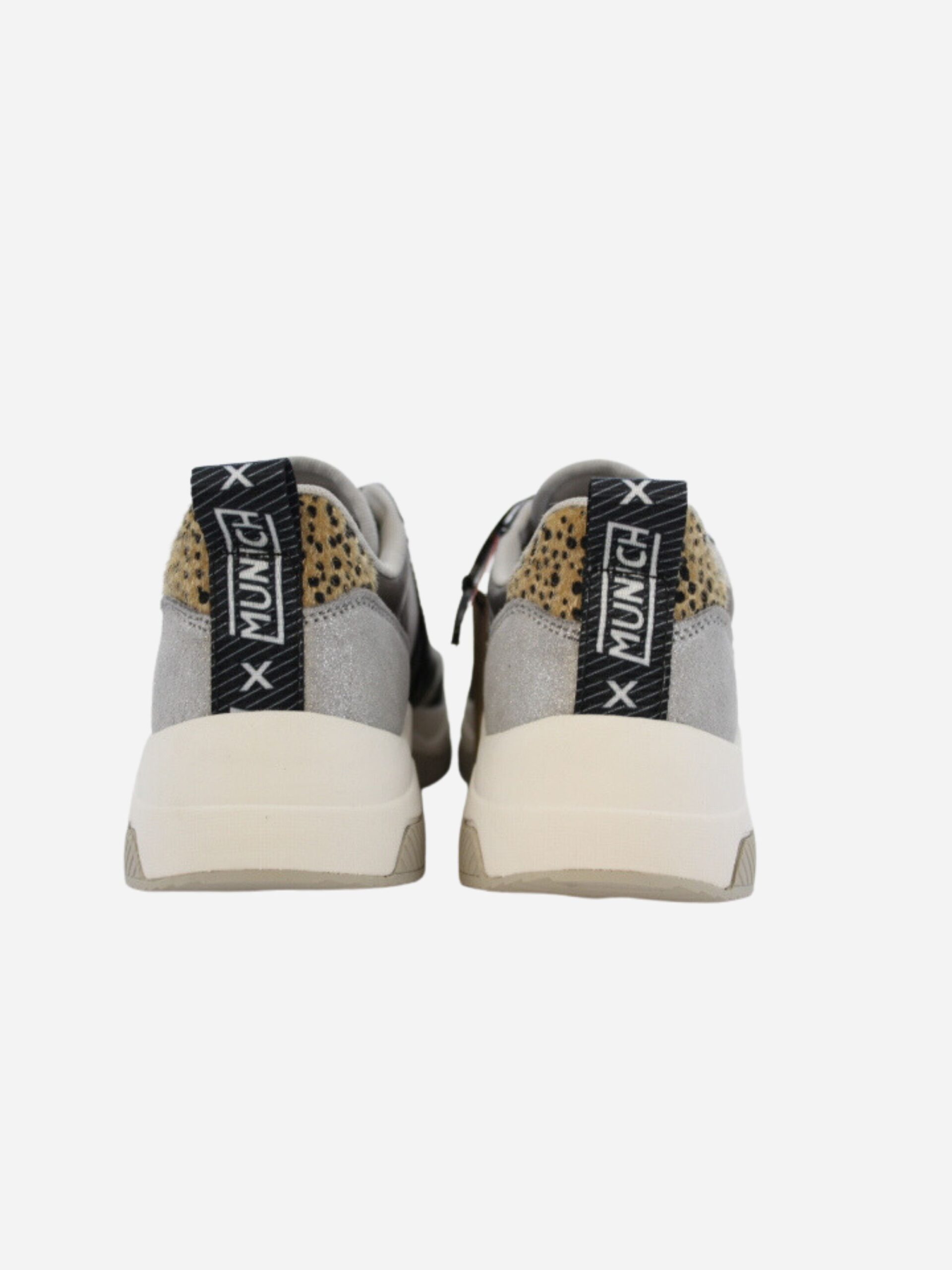 Sneakers da donna Munich. Sneakers in pelle con dettagli in camoscio e materiale sintetico. Dettaglio posteriore con glitter e finto pelo leopardato. Nella confezione sono presenti lacci di ricambio e stickers Munich.