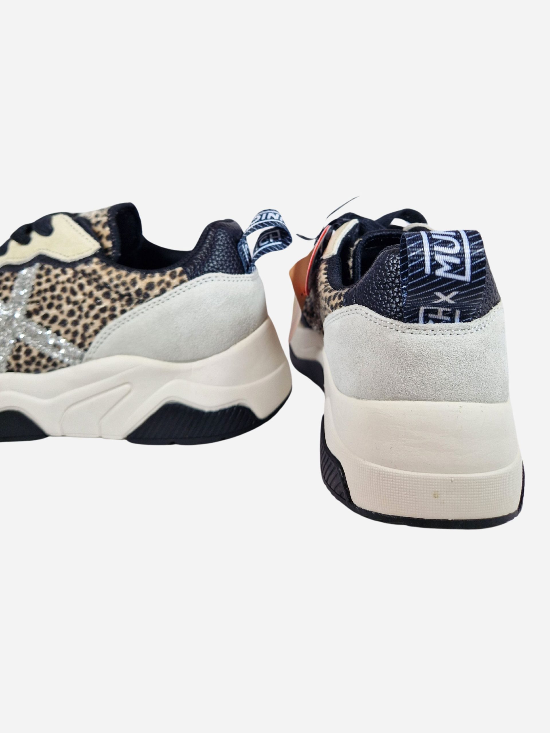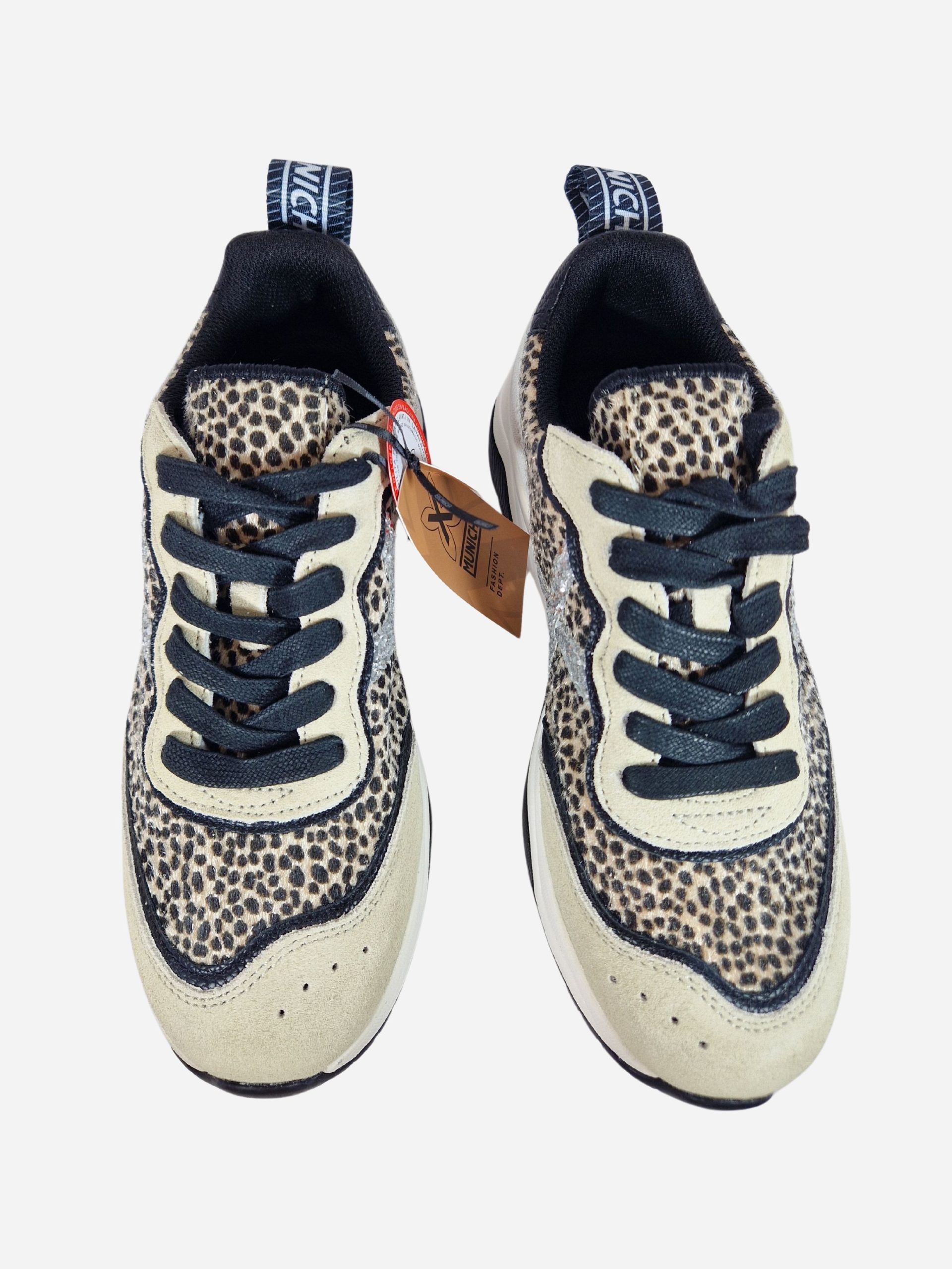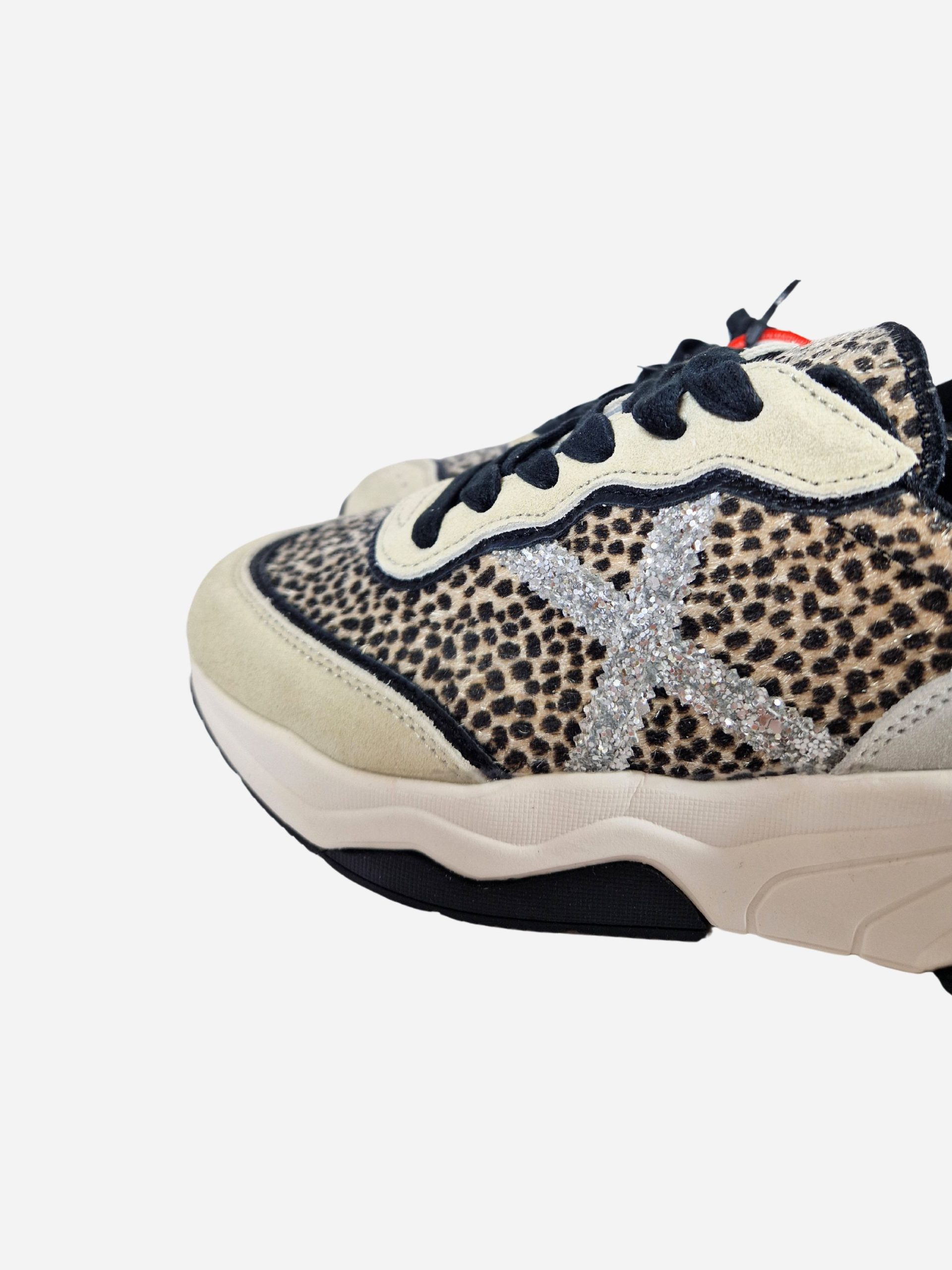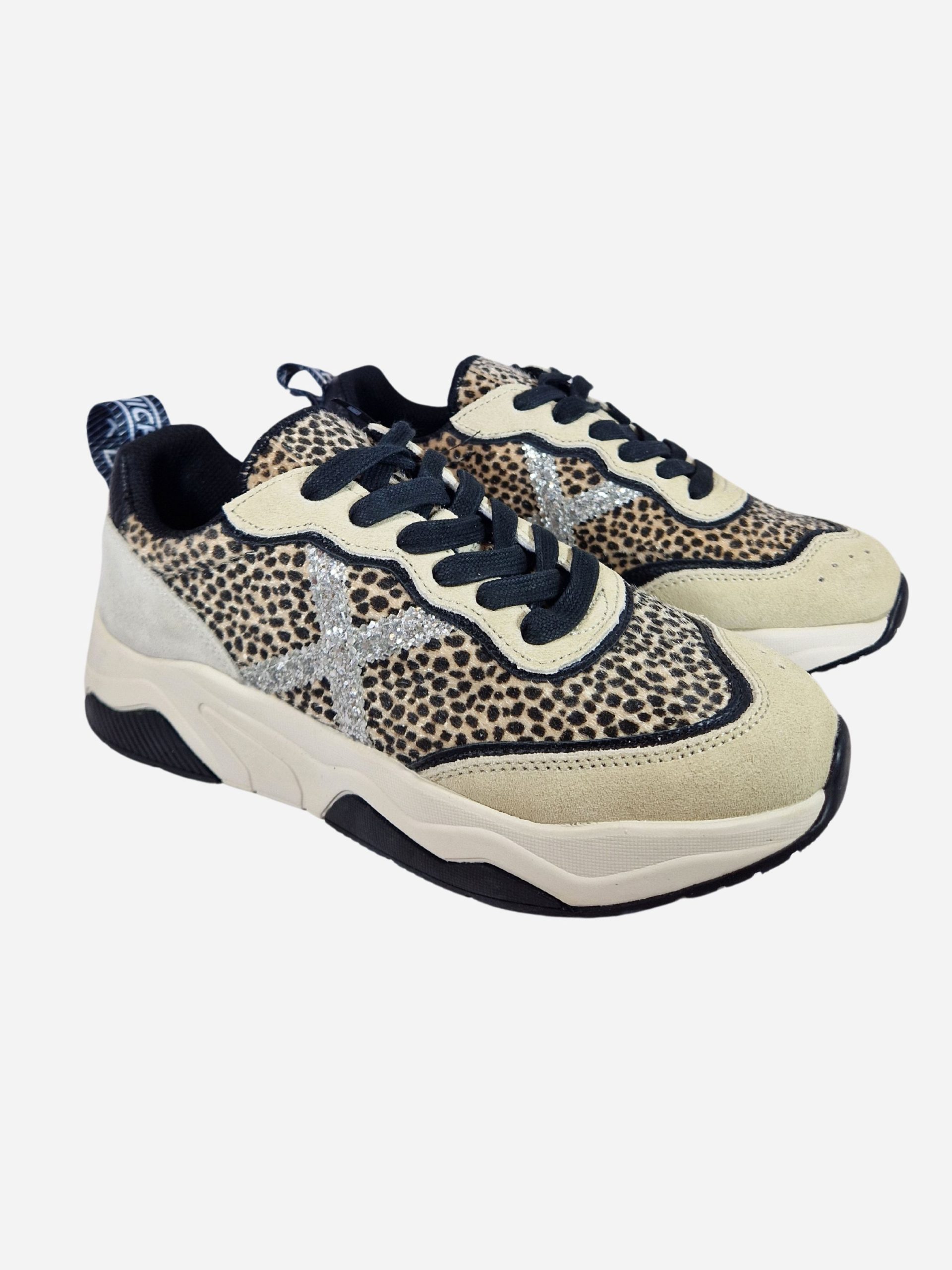 Sneakers WAVE 165 by Munich. Scarpe realizzate in cavallino maculato e camoscio. Logo X laterale in paillettes argento. Toppone in pelle nera. Chiusura con lacci. Suola in gomma.