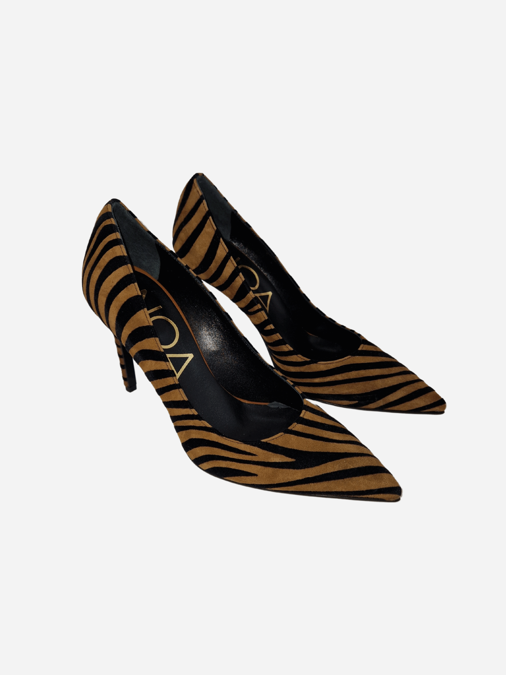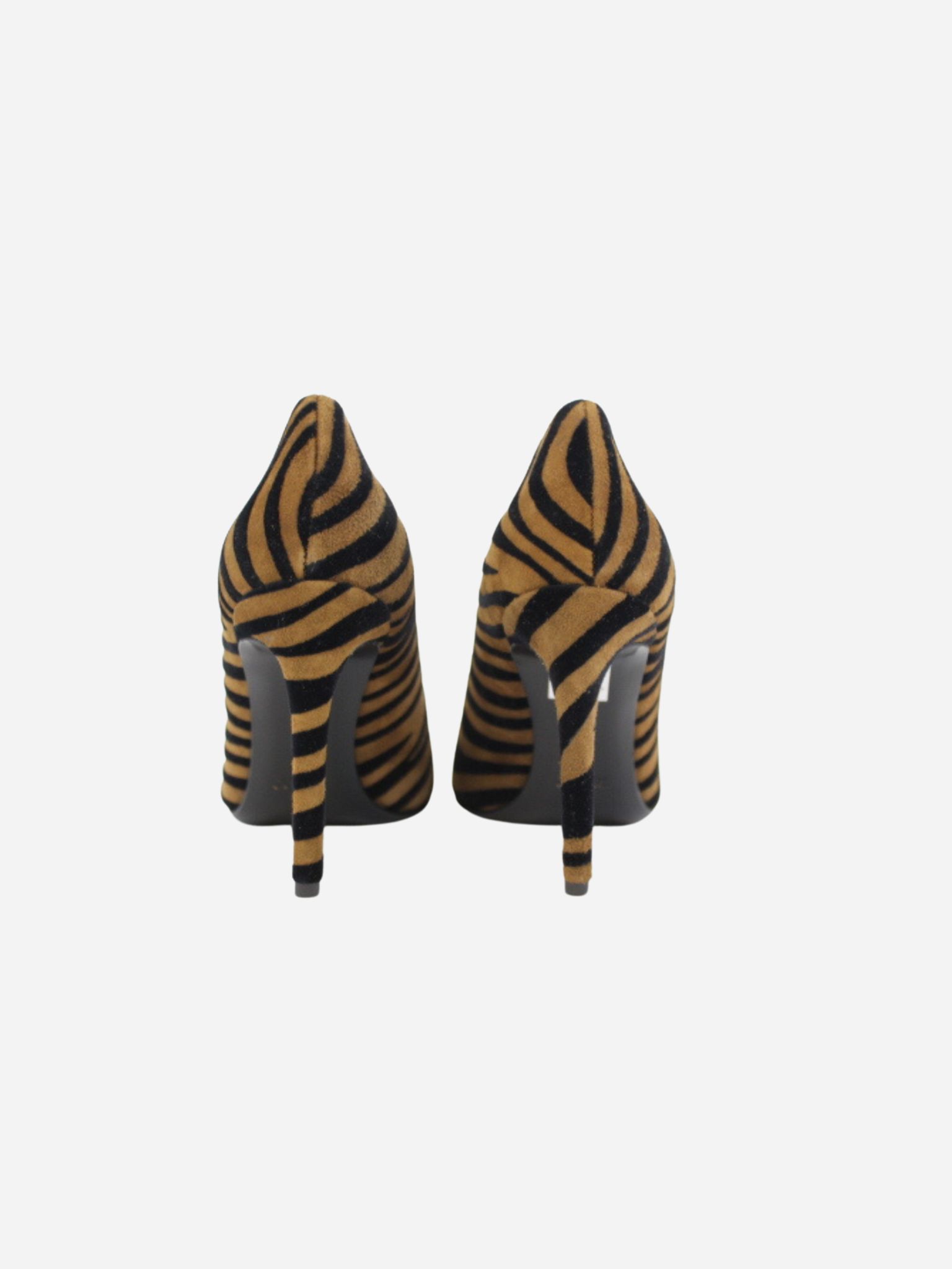 Décolleté a fantasia tigrata by Noa. Scarpa realizzata in vera pelle scamosciata con fondo in cuoio e suola in materiale sintetico di qualità. Tacco a spillo di 9 cm.
