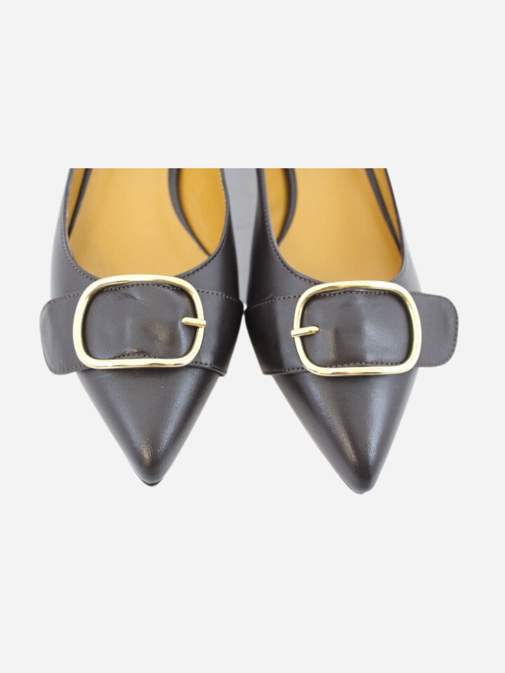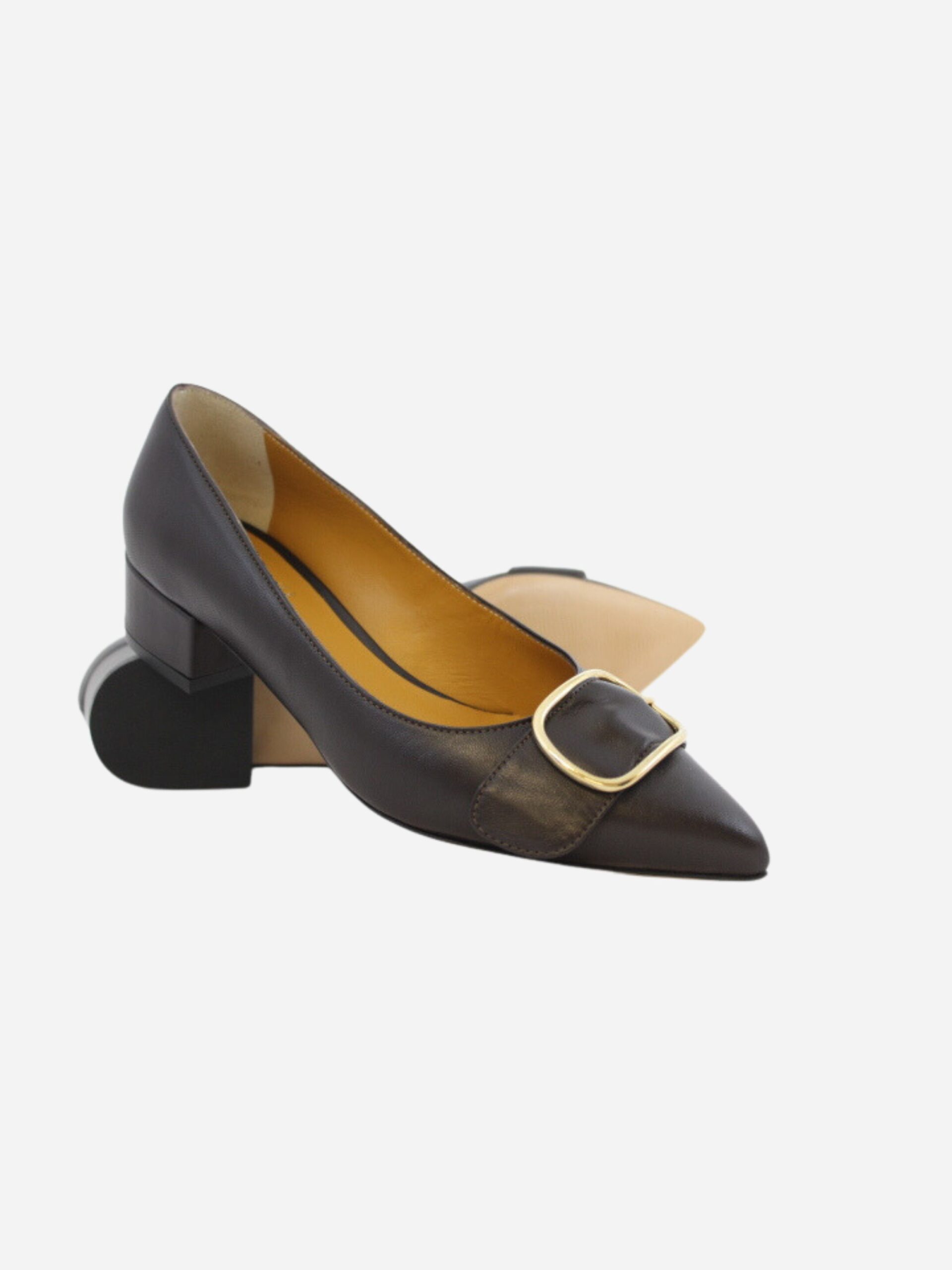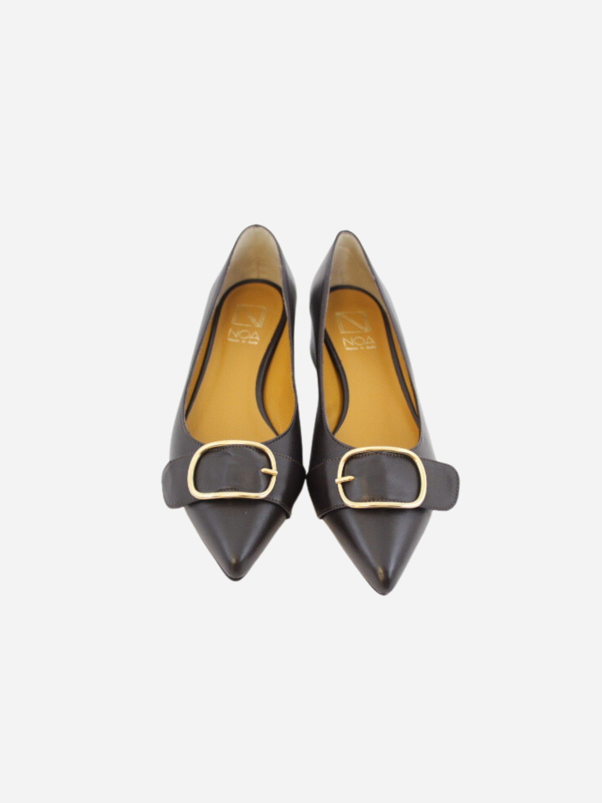 Mocassino a punta by Noa color testa di moro. Scarpe dalla linea classica, realizzate in vera pelle con fondo in cuoio e suola in materiale sintetico. Dettaglio accessorio con fibbia dorata sulla punta. Comodo tacco quadrato di 3 cm.