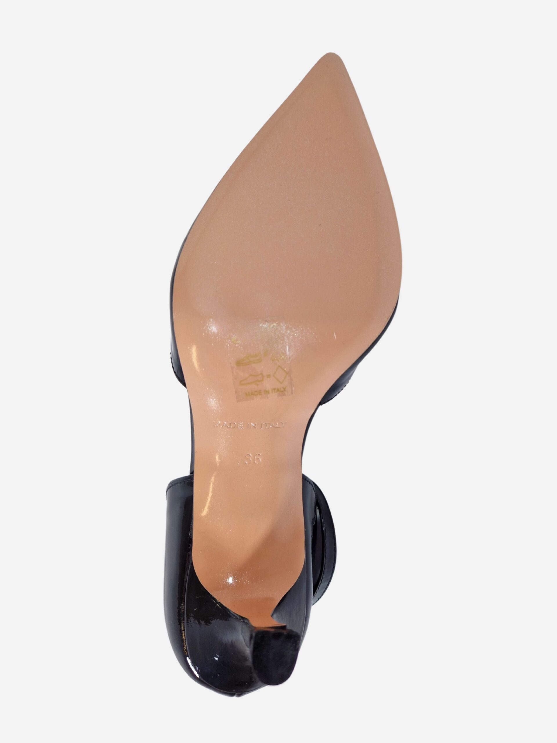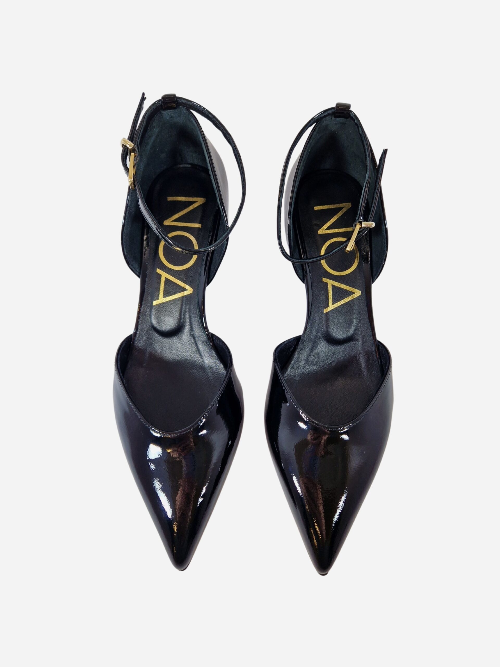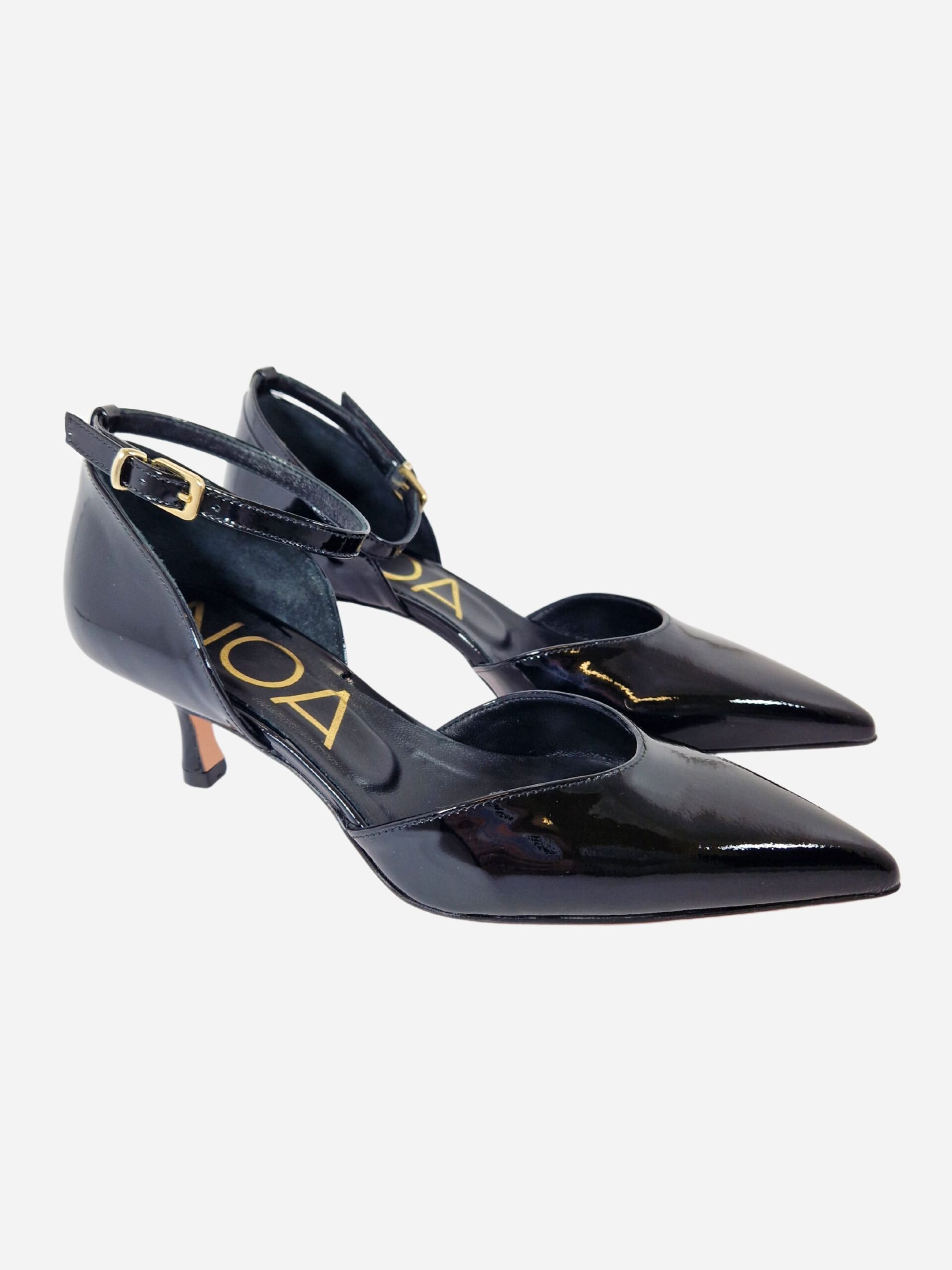 Scarpa semi-aperta by Noa. Calzature realizzate in vera pelle verniciata con fondo in cuoio. Chiusura con cinturino alla caviglia. Tacco di 5 cm.