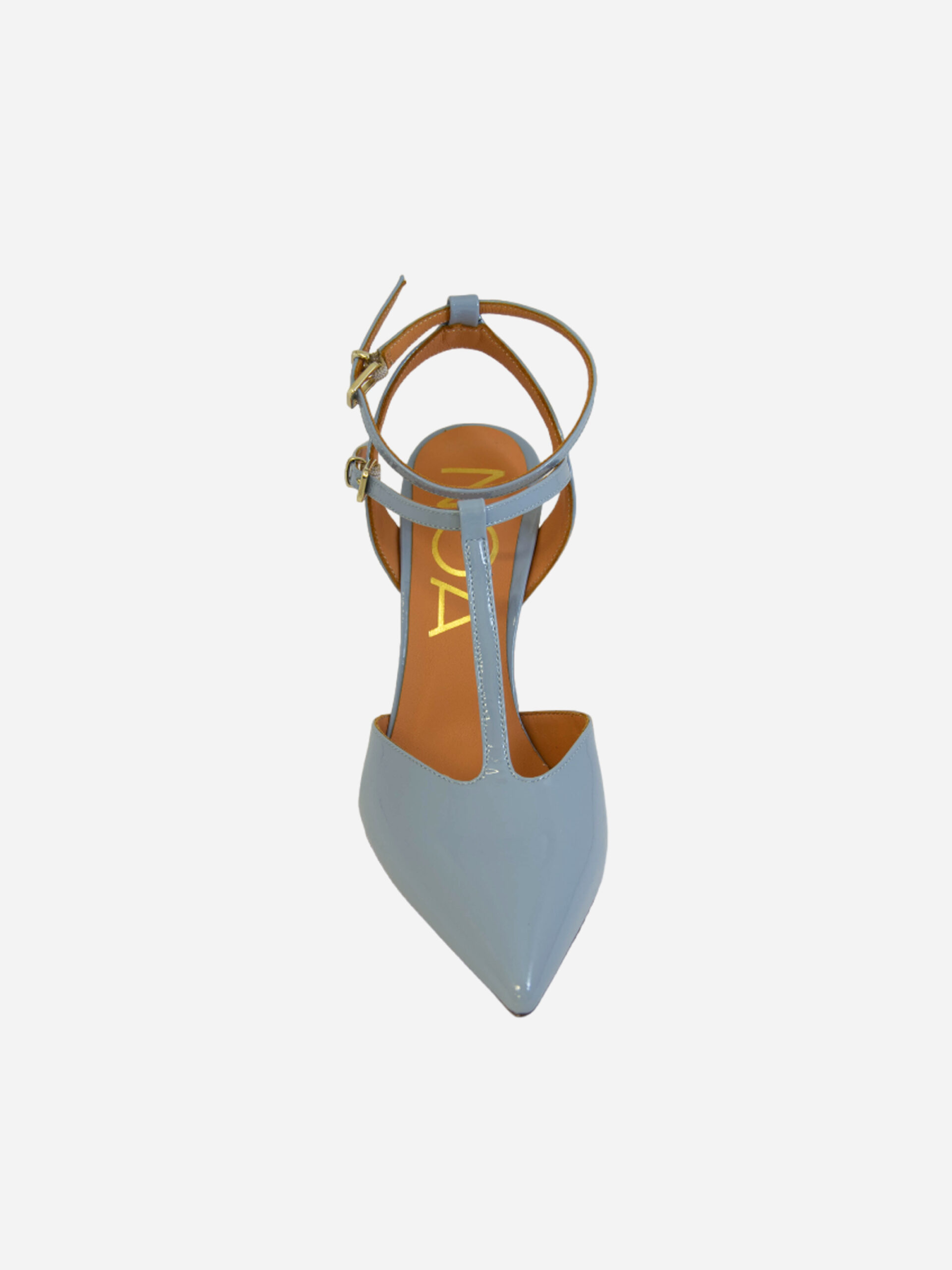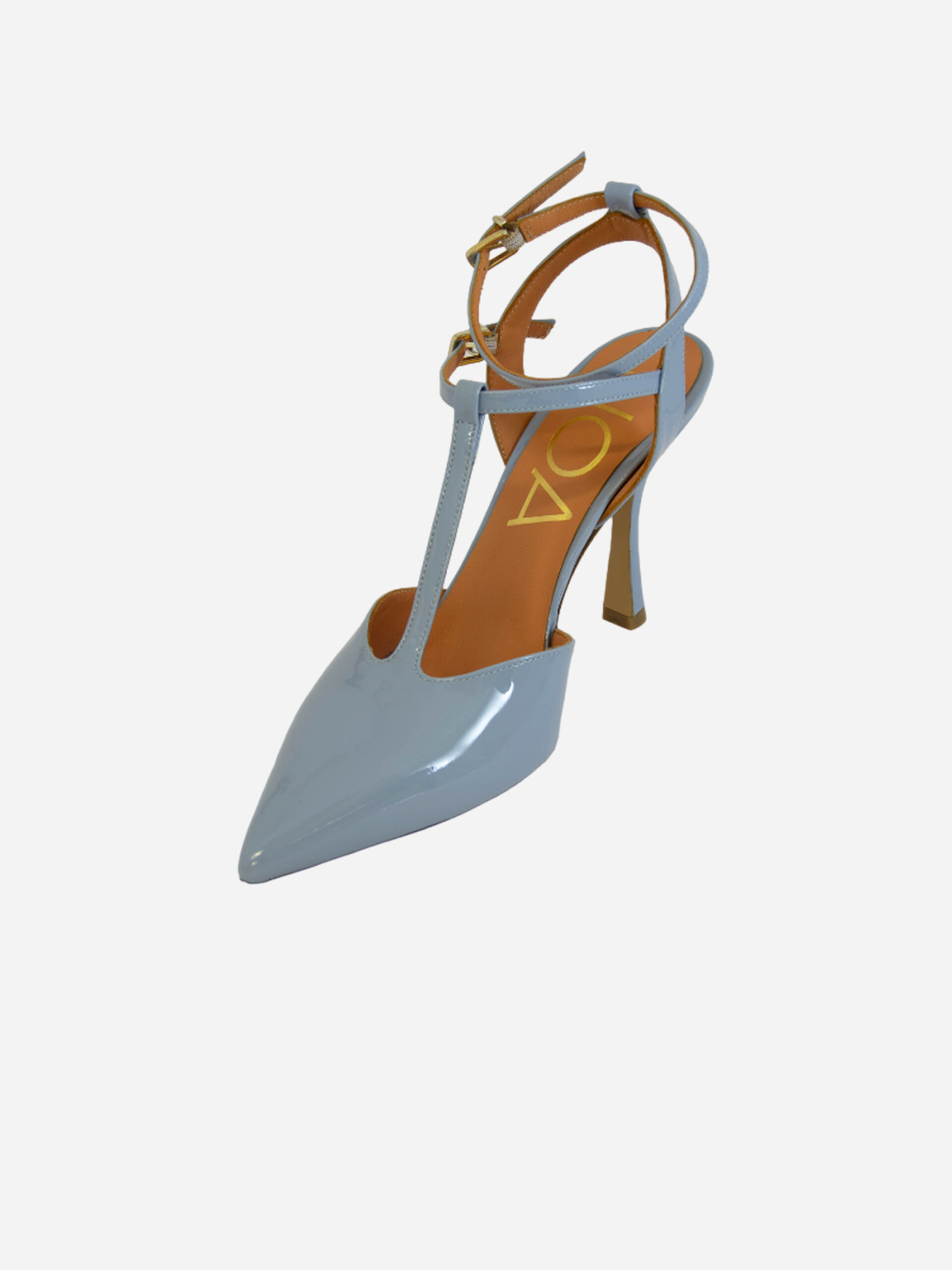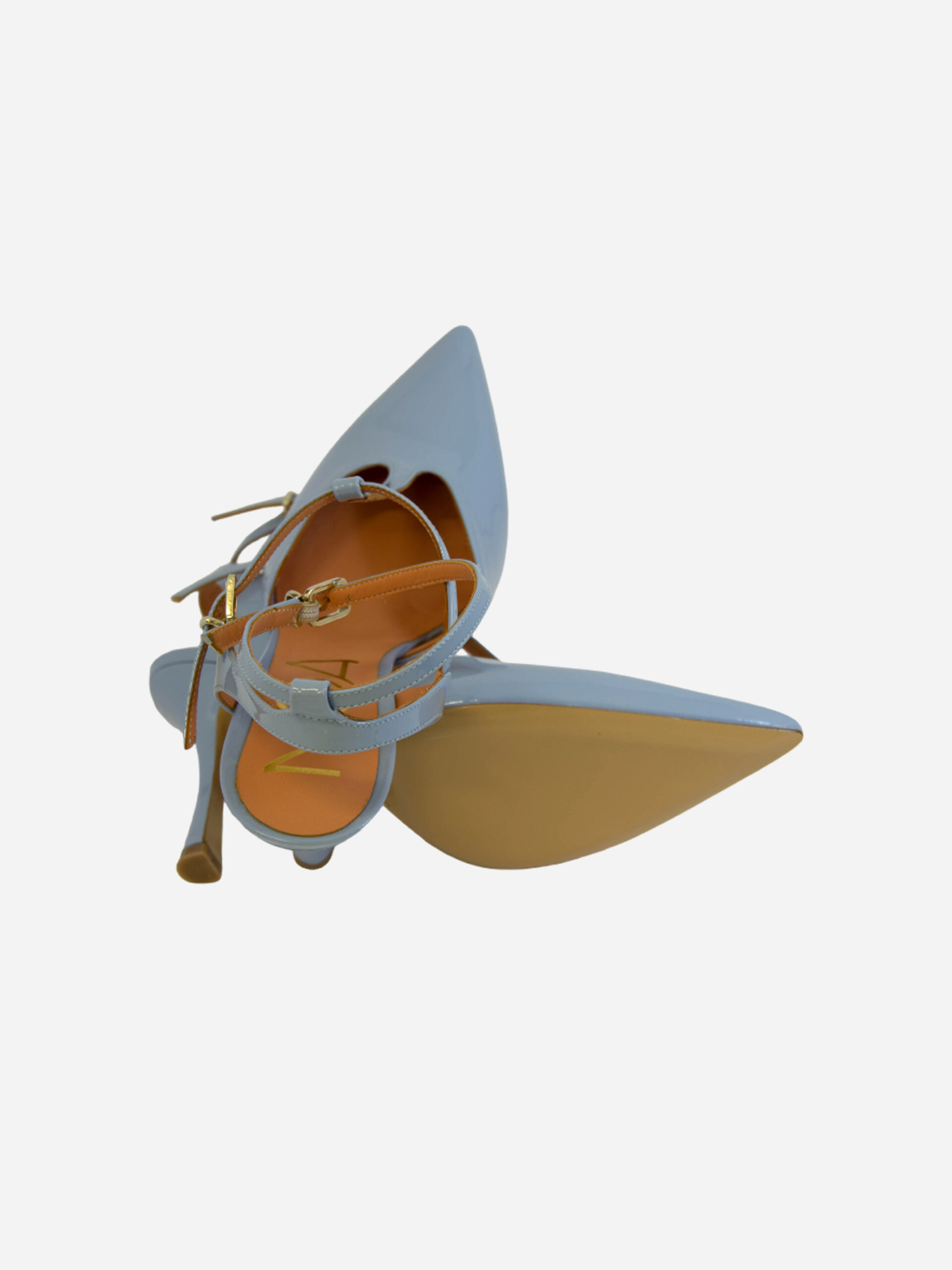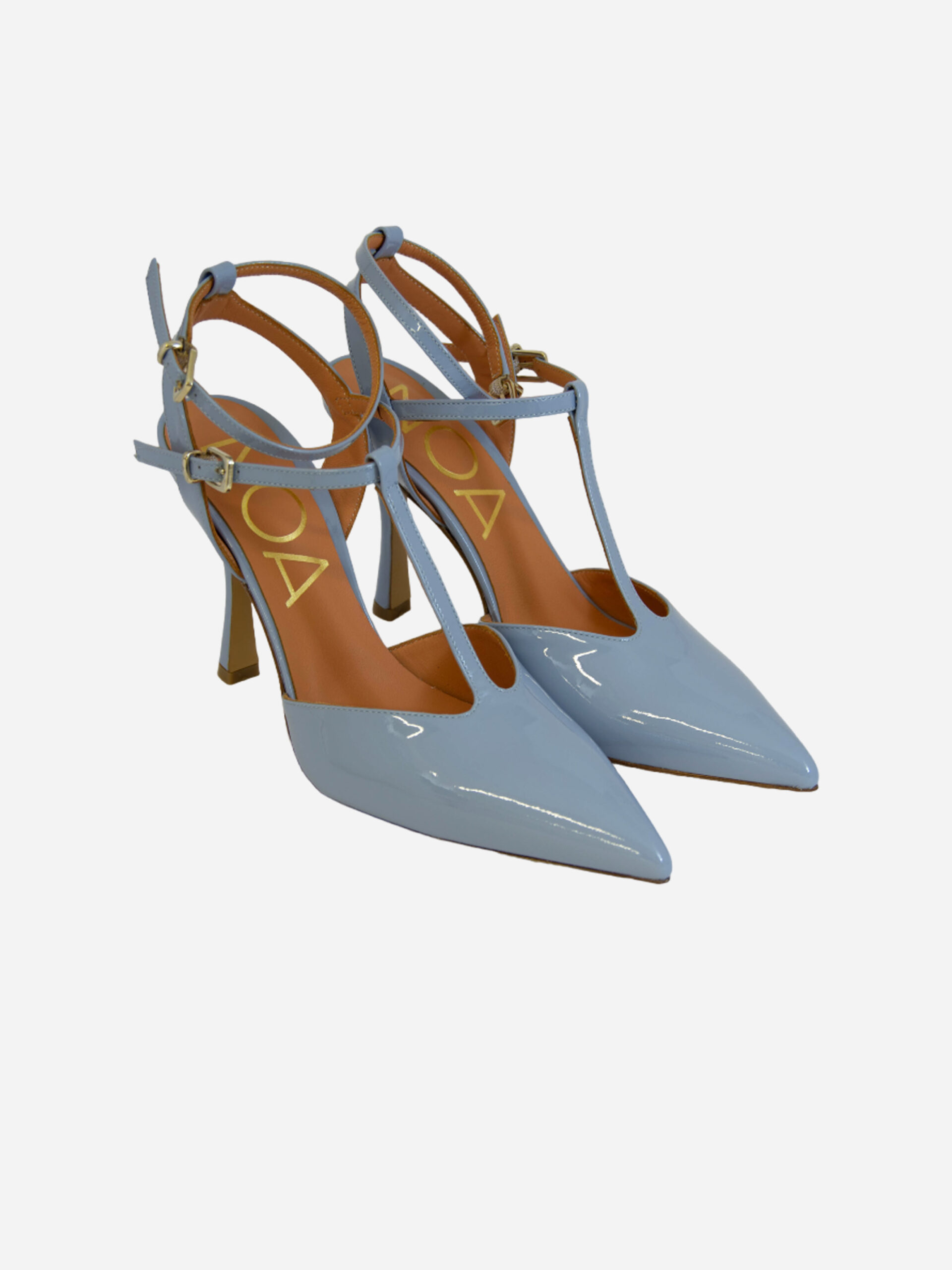 Slingback AN91 di Noa. Sandalo chanelle con tacco 10 cm nei colori vernice celeste e vernice nero. Il cinturino sul collo del piede e sulla caviglia permettono una maggiore stabilità e aderenza della calzata. Tomaia in pelle e fondo in cuoio. Made in Italy.