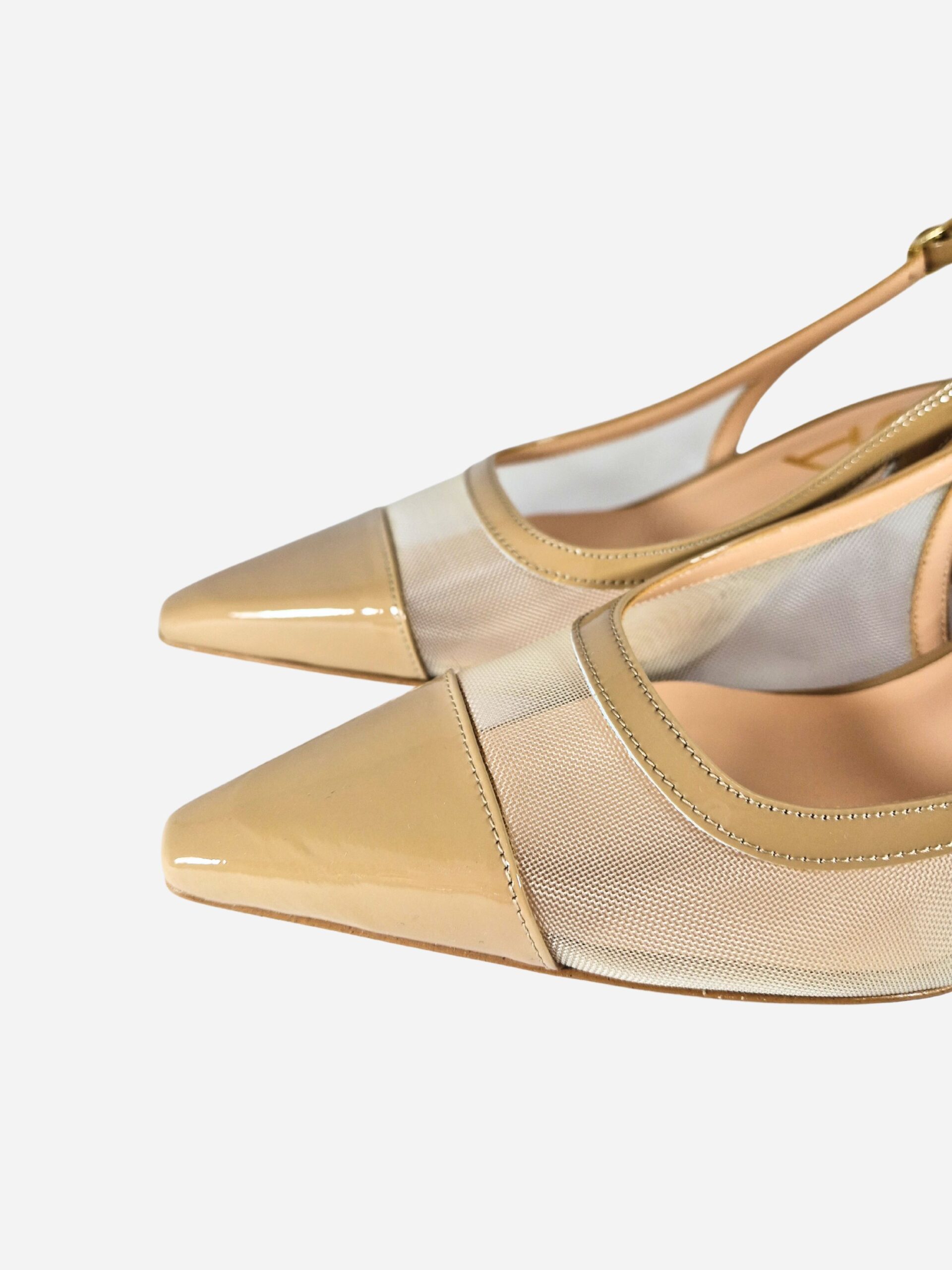 Slingback by Noa. Calzature realizzate in rete con rifiniture in vera pelle verniciata e fondo in cuoio. Chiusura con cinturino al tallone. Tacco di 5,5 cm.