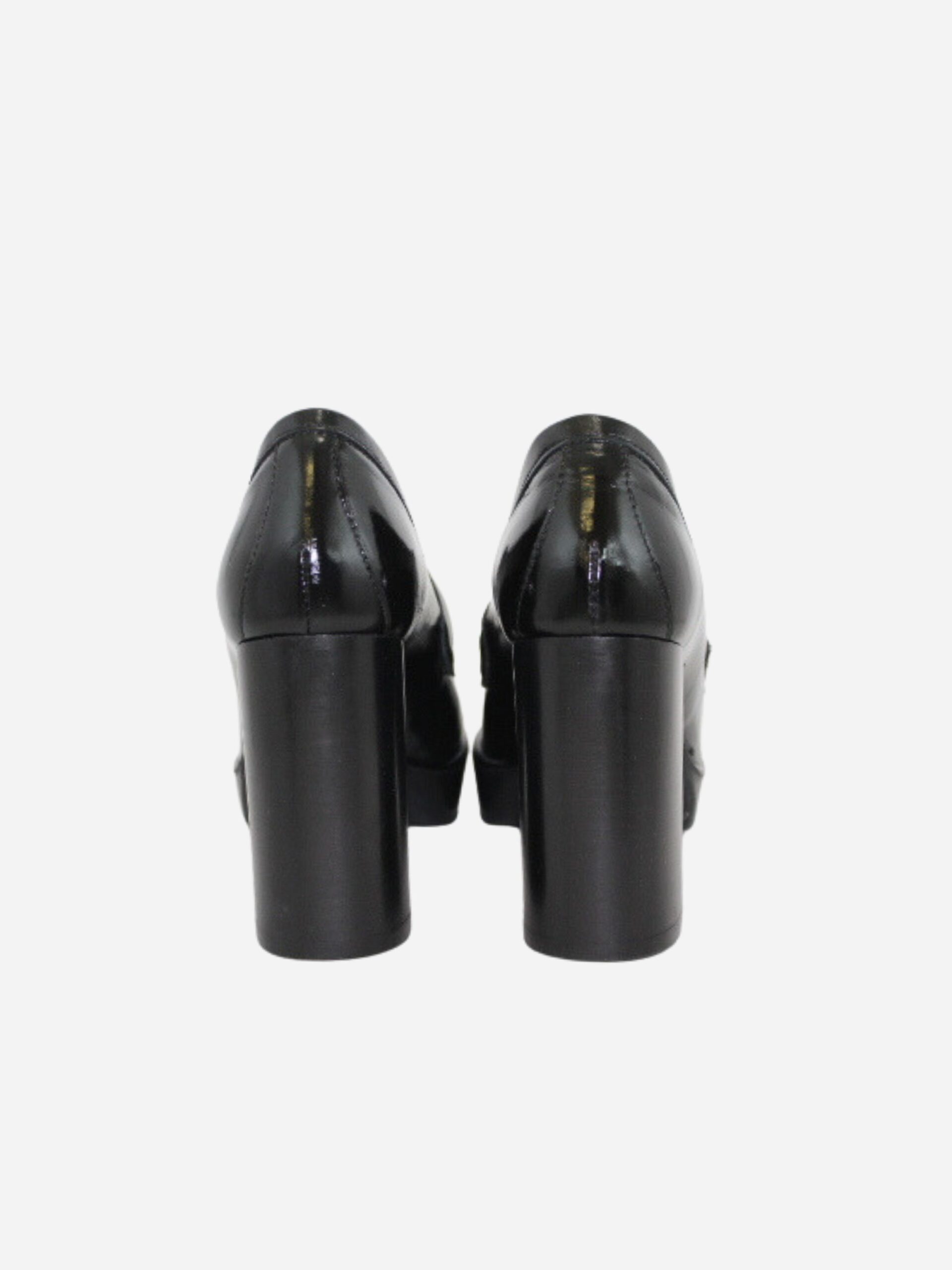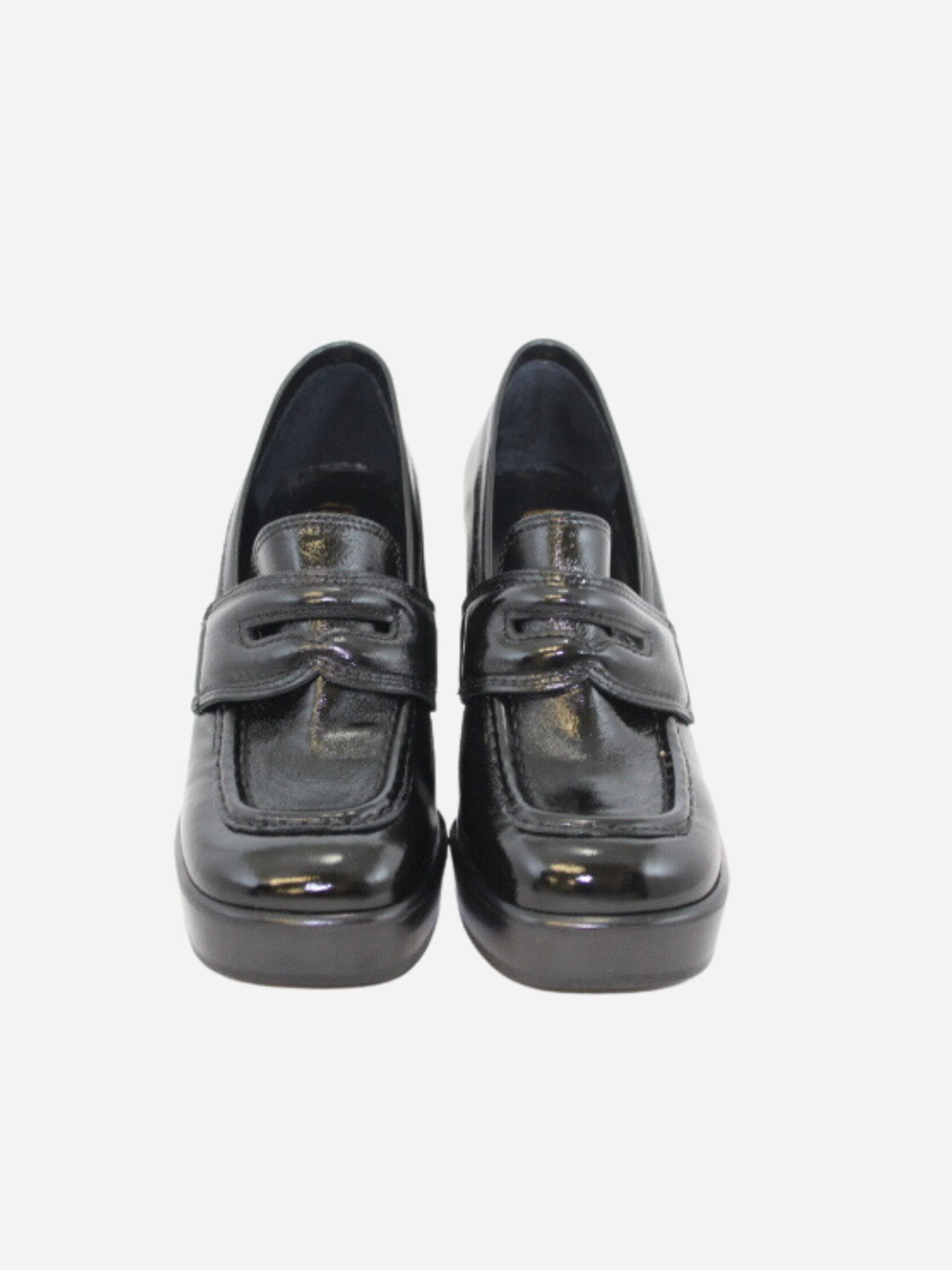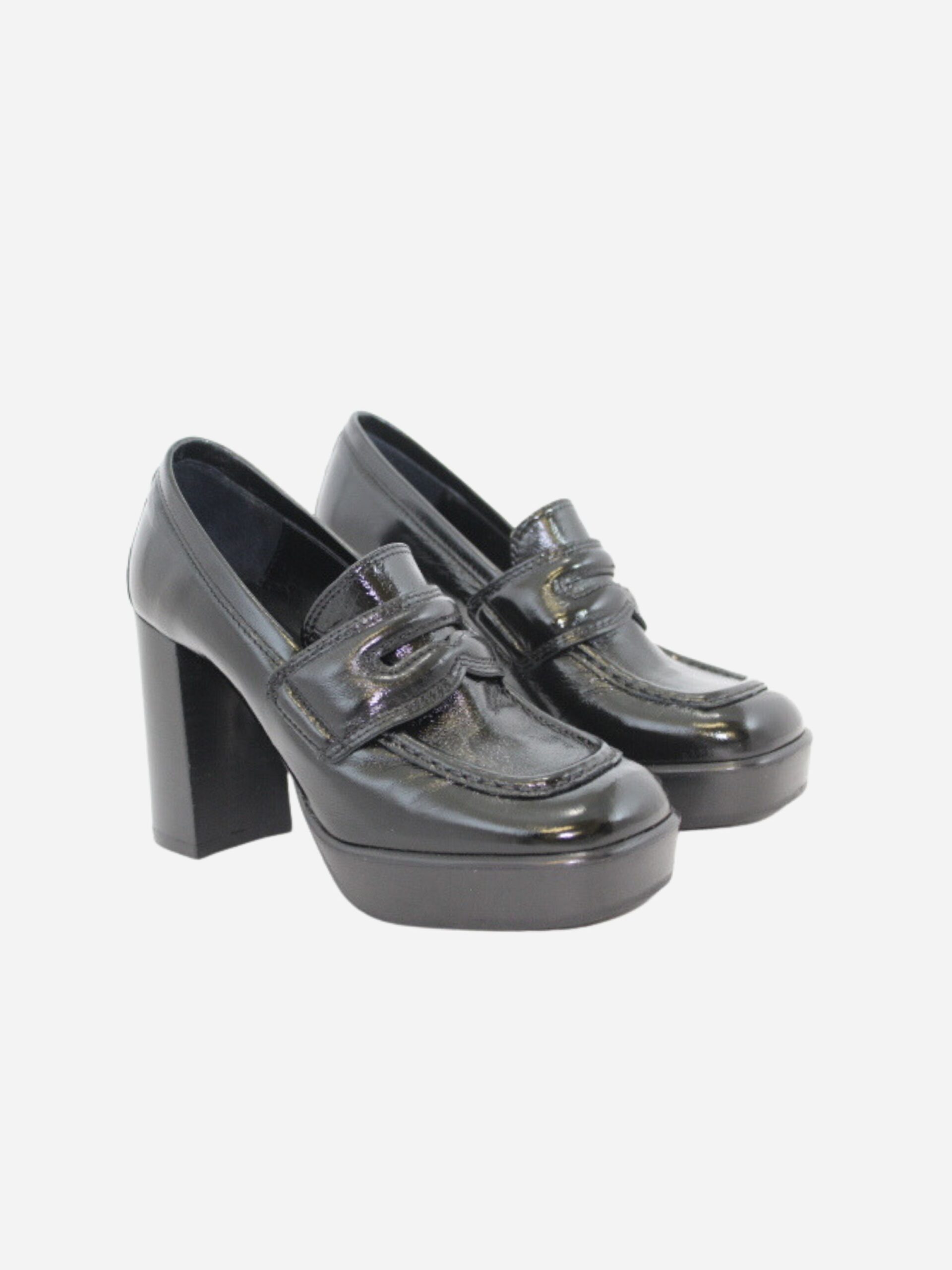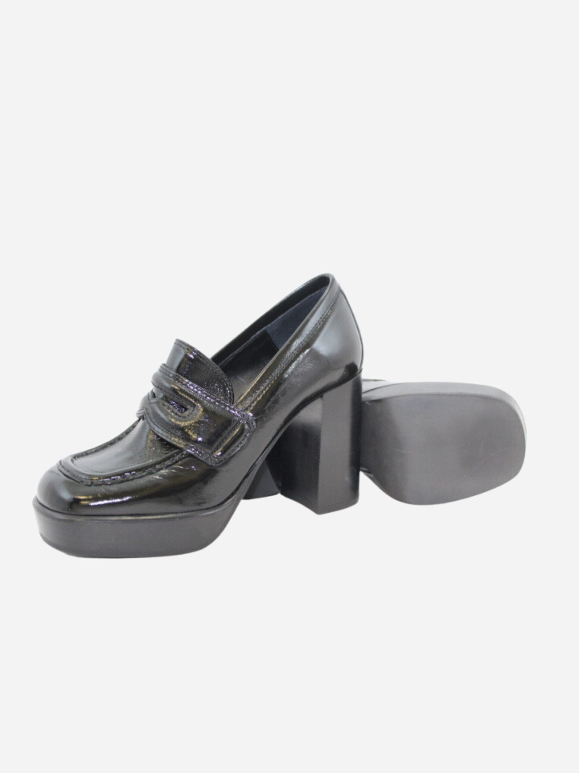 Mocassino con plateau by Ovyé. Scarpe realizzate in pelle naplak nella colorazione nera con fondo in materiale sintetico pregiato. Classica linguetta del mocassino. Plateau di 2 cm che rende la scarpa più comoda. Tacco largo di 10 cm.