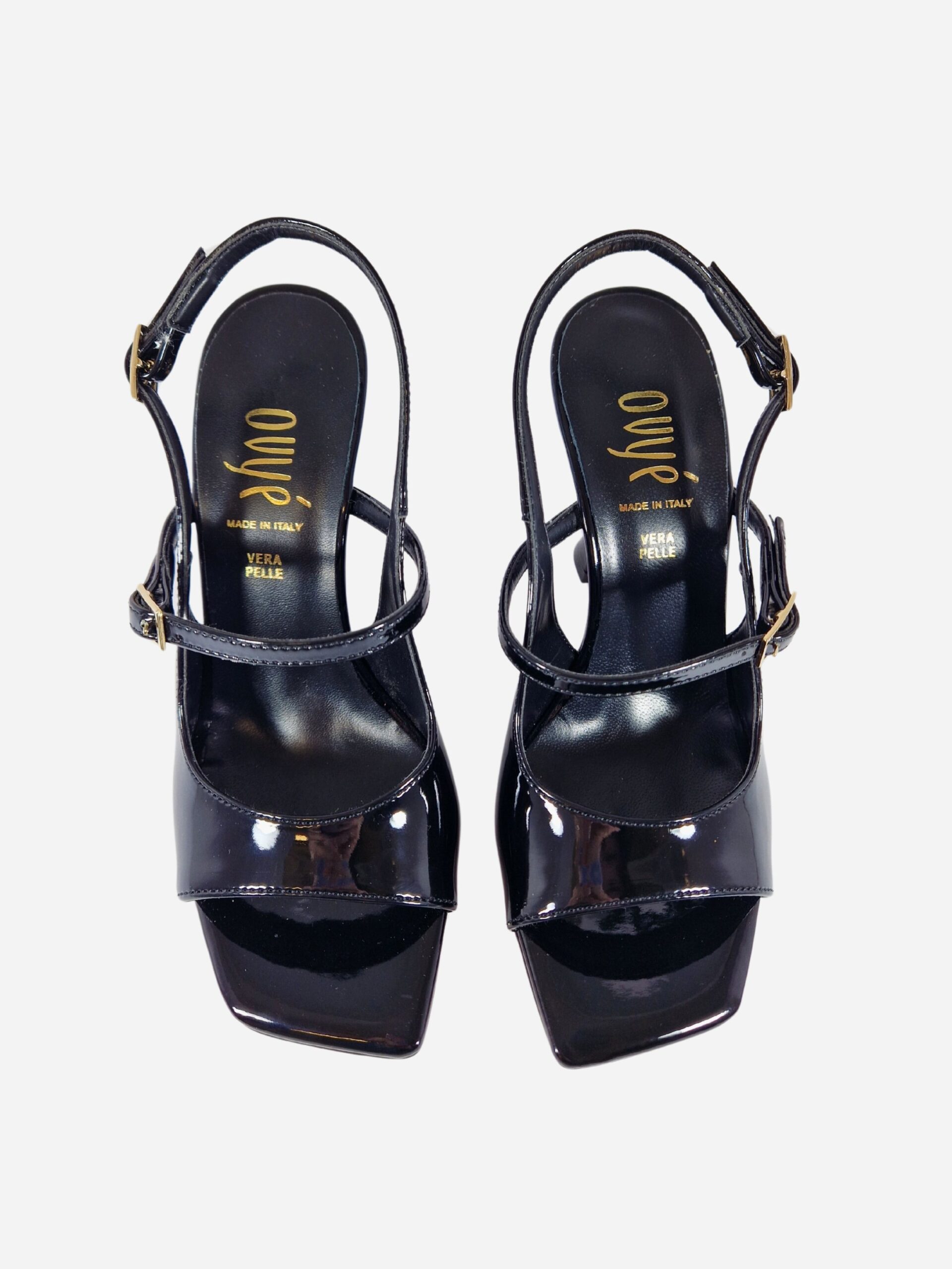 Sandali by Ovyé. Calzature realizzate in vera similpelle verniciata con fondo in cuoio e suola in materiale sintetico. Chiusura con doppio cinturino, al tallone e che abbraccia il piede. Tacco di 10 cm.