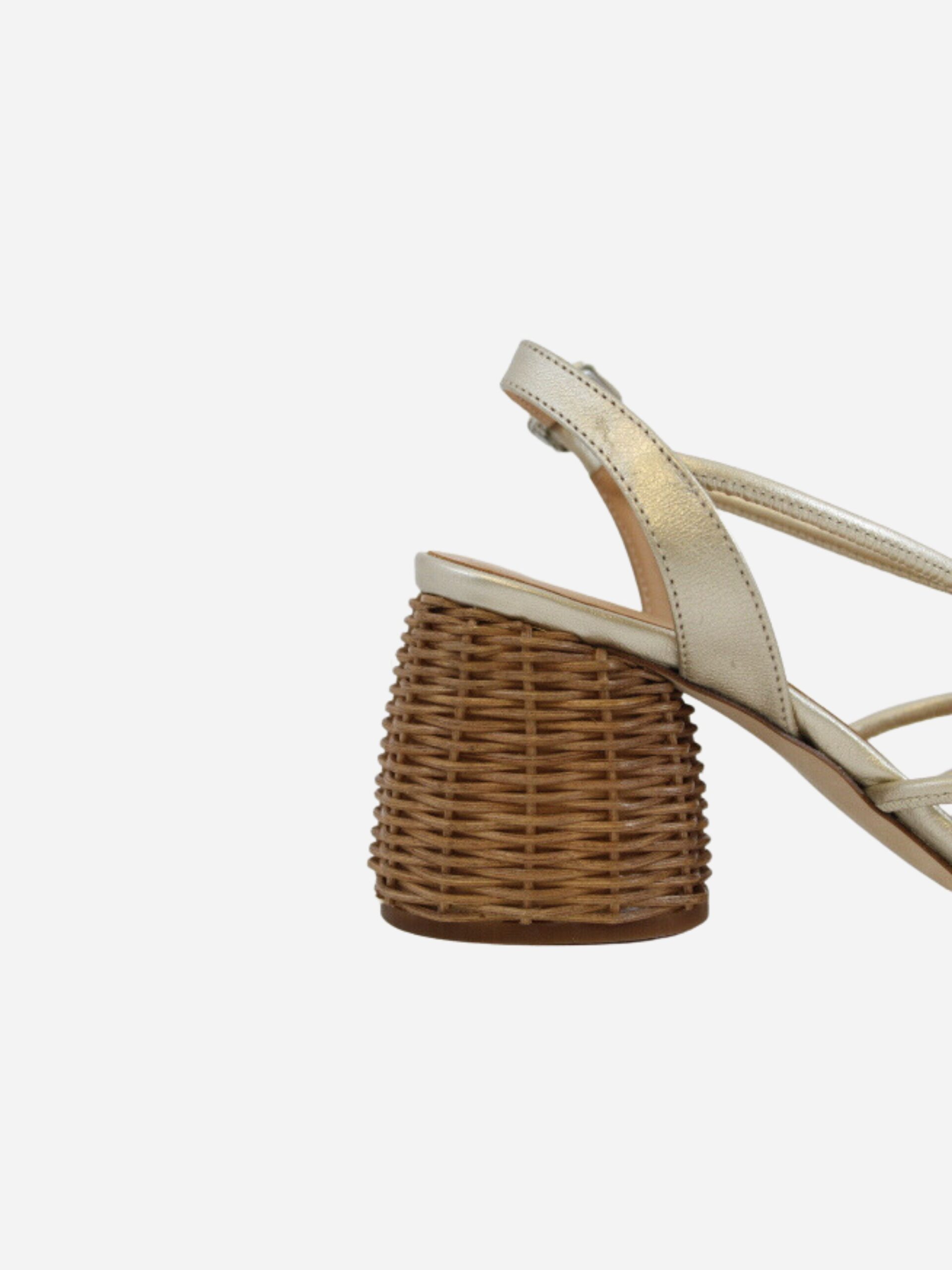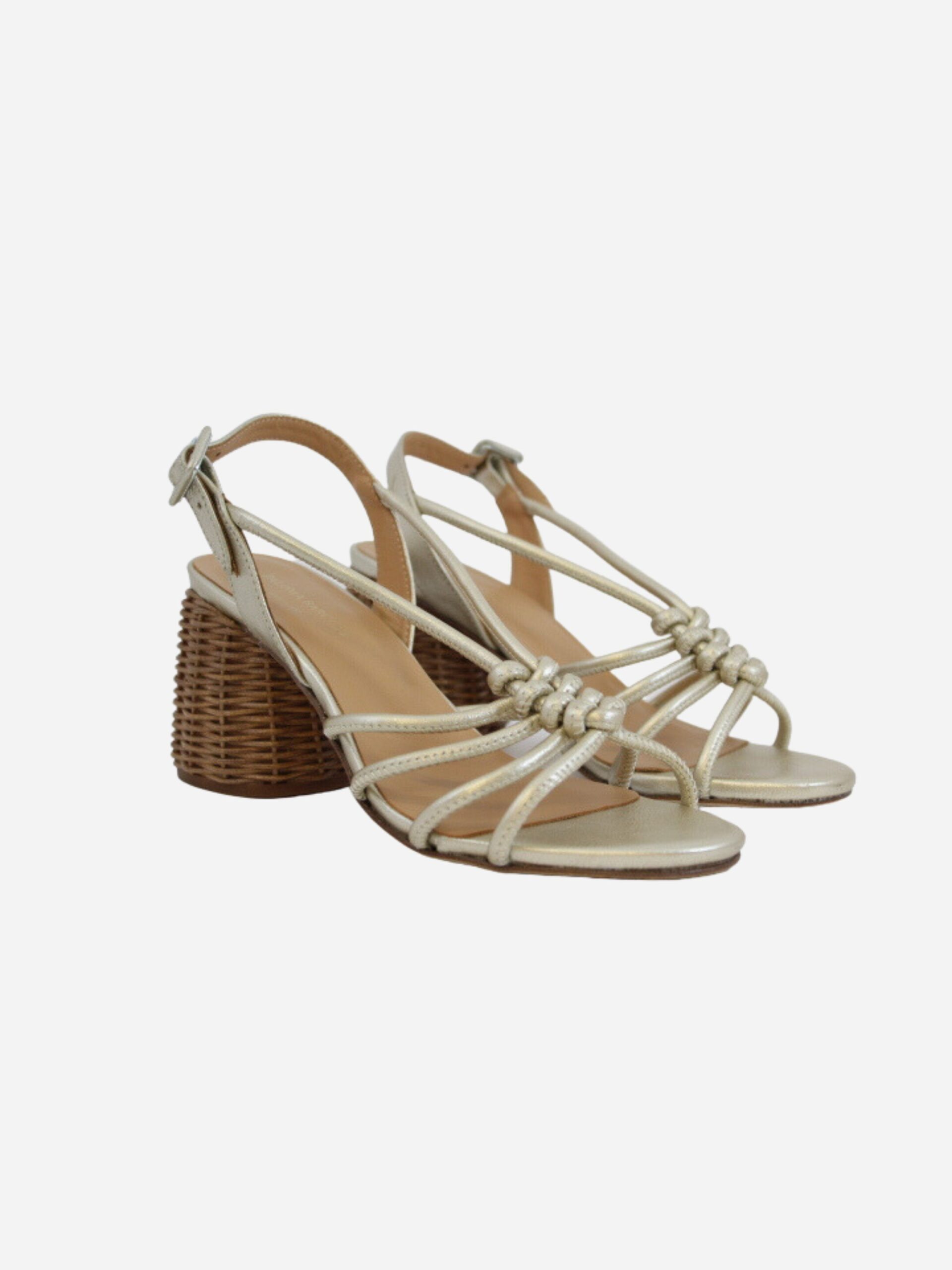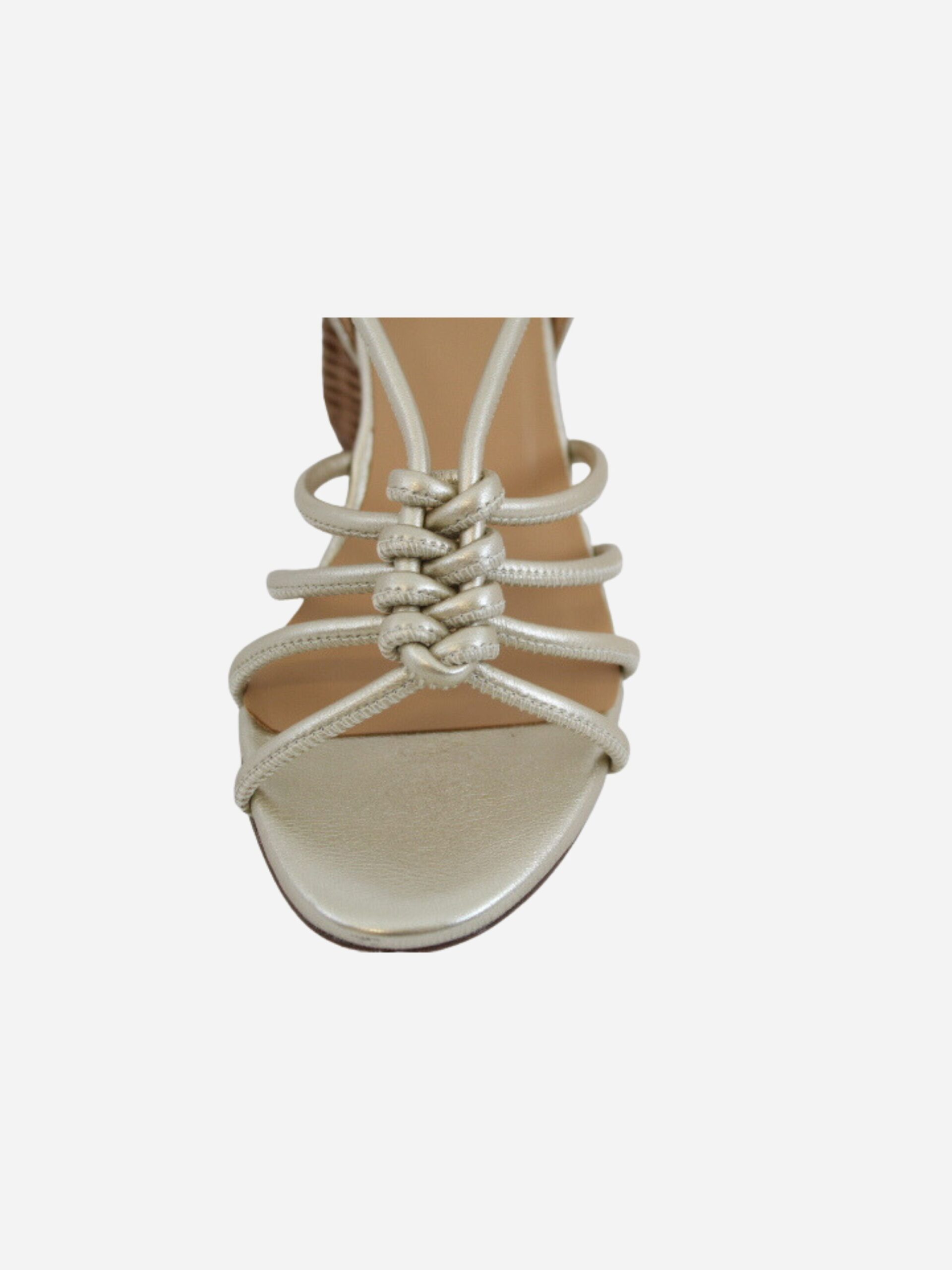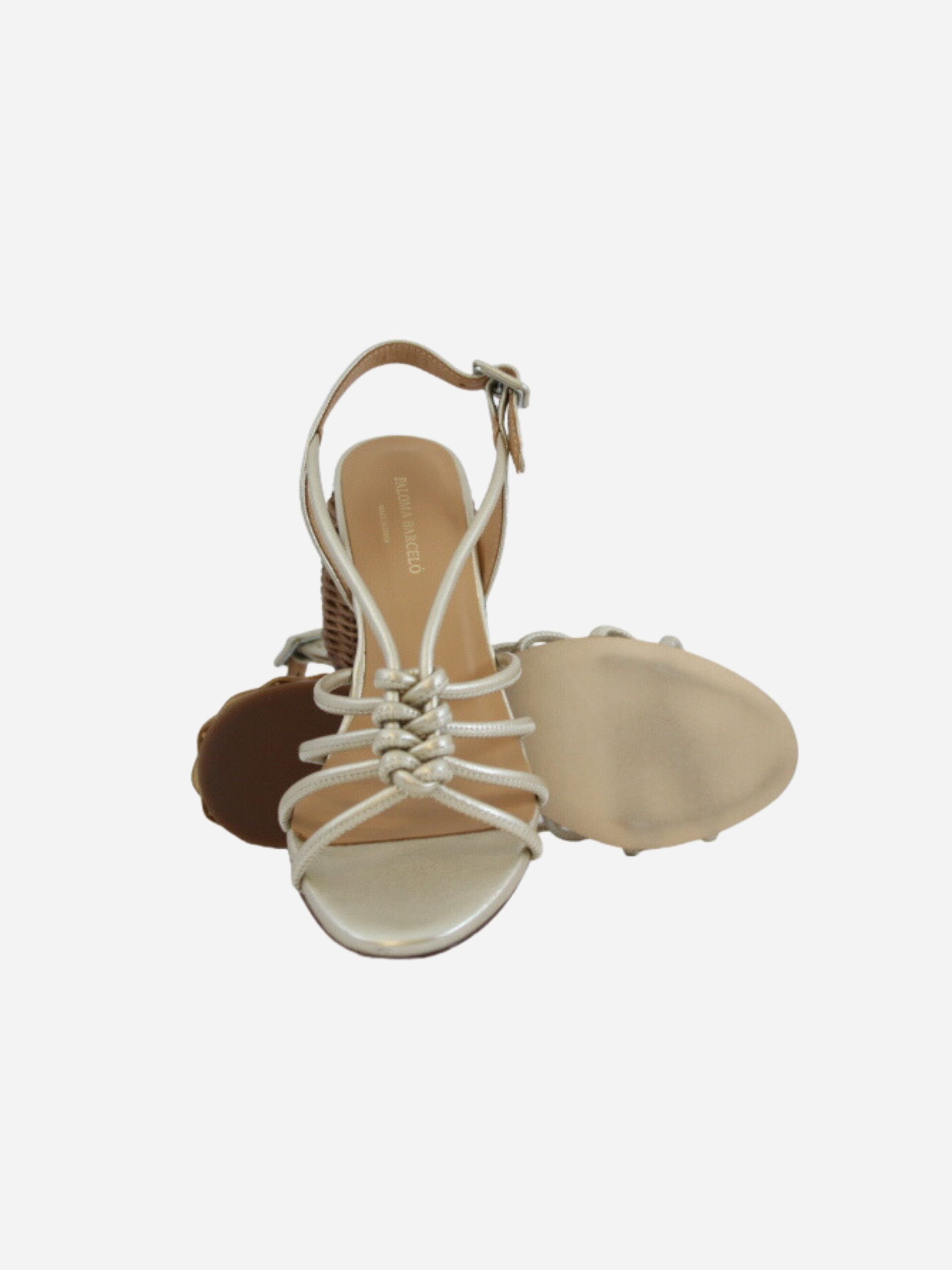 Sandalo color platino di Paloma Barcelo’. Dettaglio annodato frontale e tacco largo intrecciato. Chiusura con cinturino.