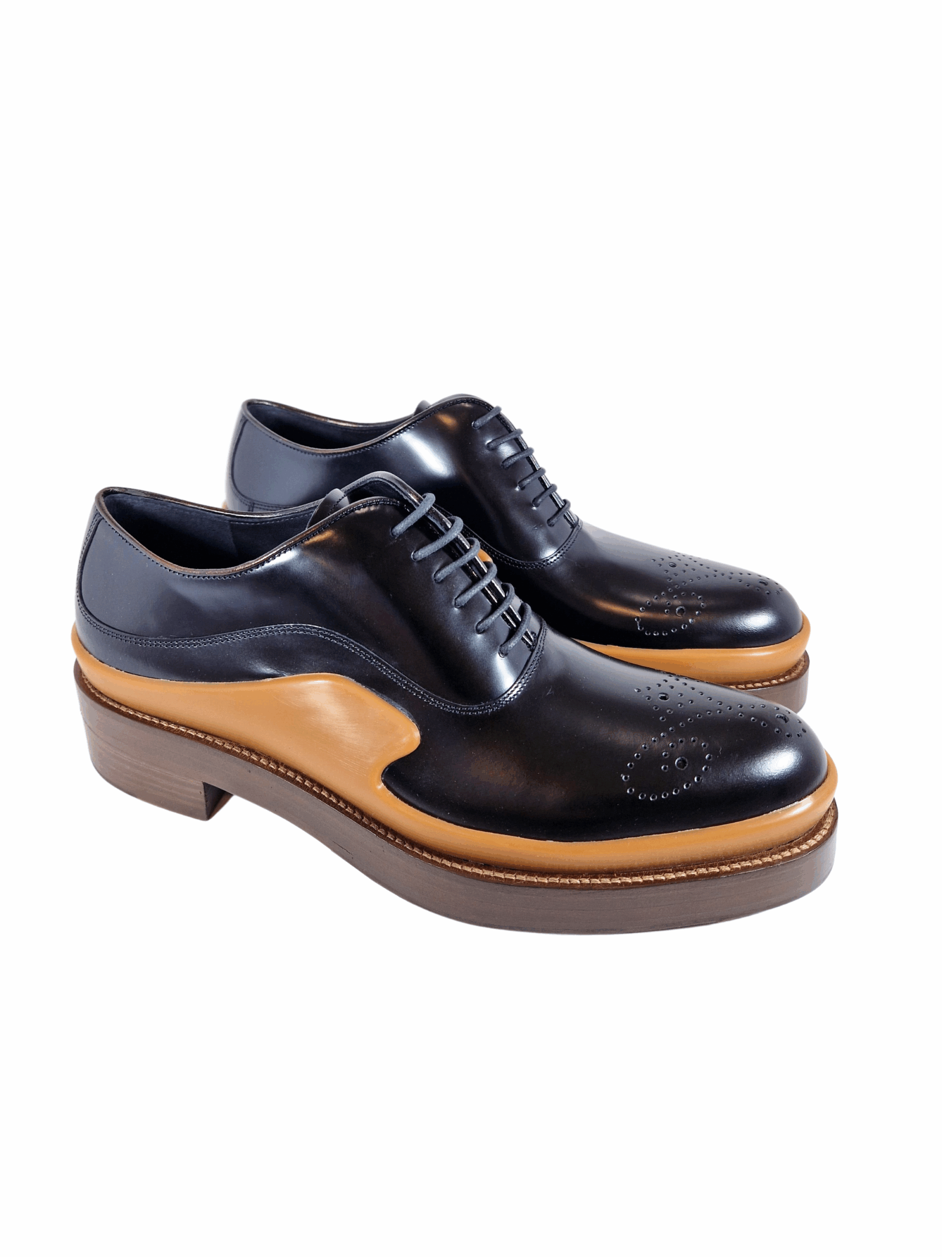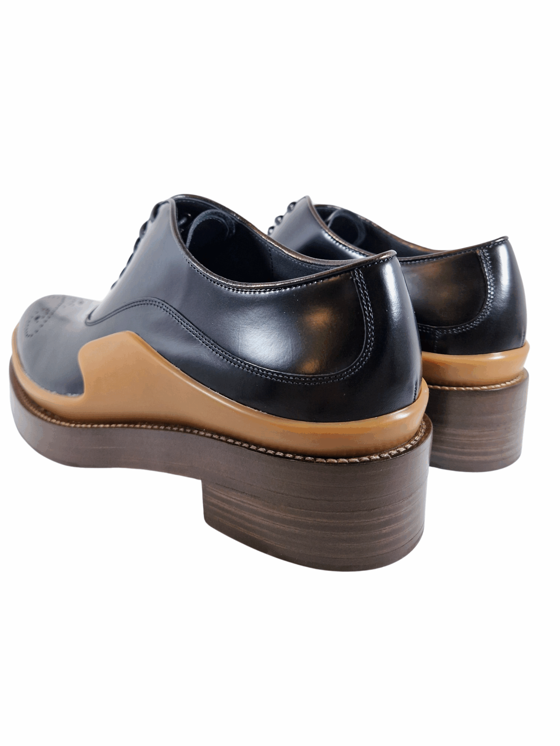 Scarpa allacciata by Prada. Calzature realizzate in vera pelle spazzolata con suola in cuoio. Motivo decorativo sulla punta. Comodo tacco di 4 cm.