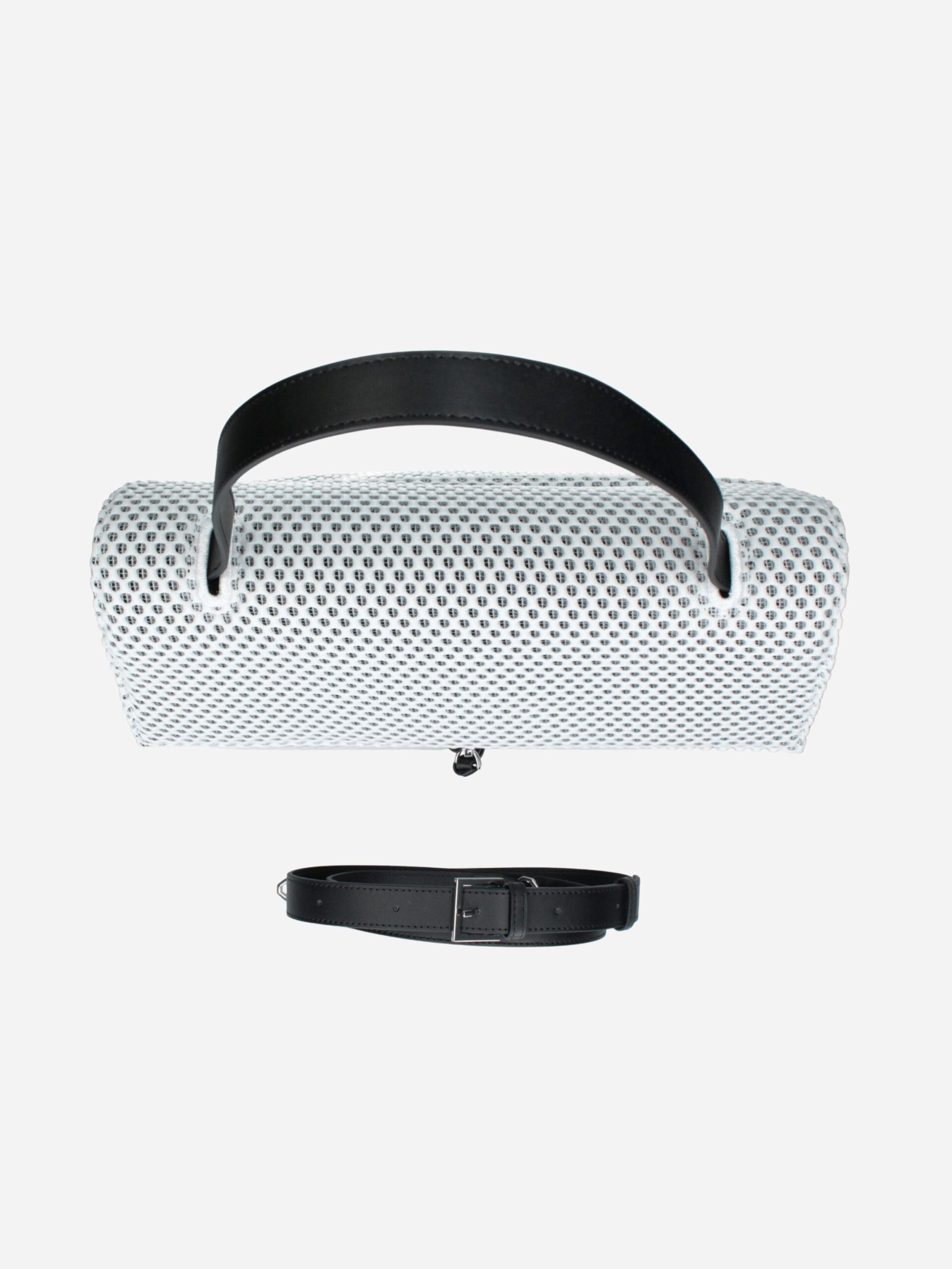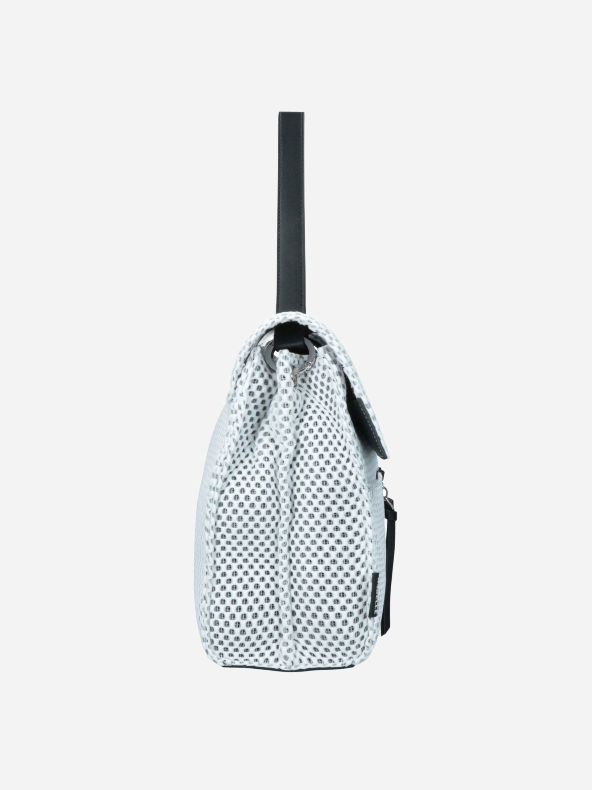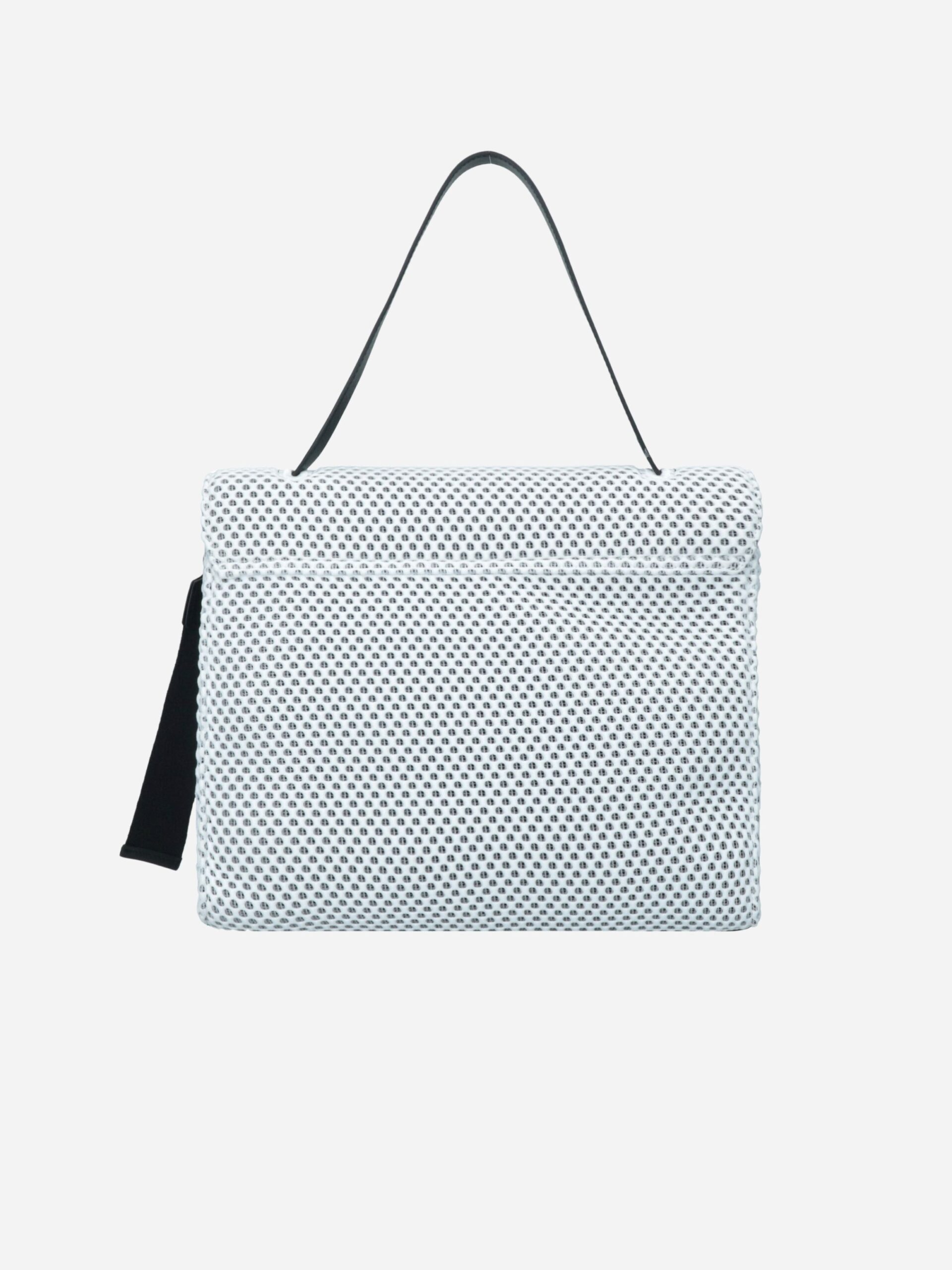 Borsa a cartella UNDERGROUND by Rebelle. Borsa realizzata in tessuto forato, comoda e capiente. L’interno è foderato e diviso in due scomparti da una tasca con zip. Può essere portata a spalla o crossbody grazie alla tracollina staccabile e regolabile. Nella parte davanti sono presenti due tasche e un charms portachiavi con logo.