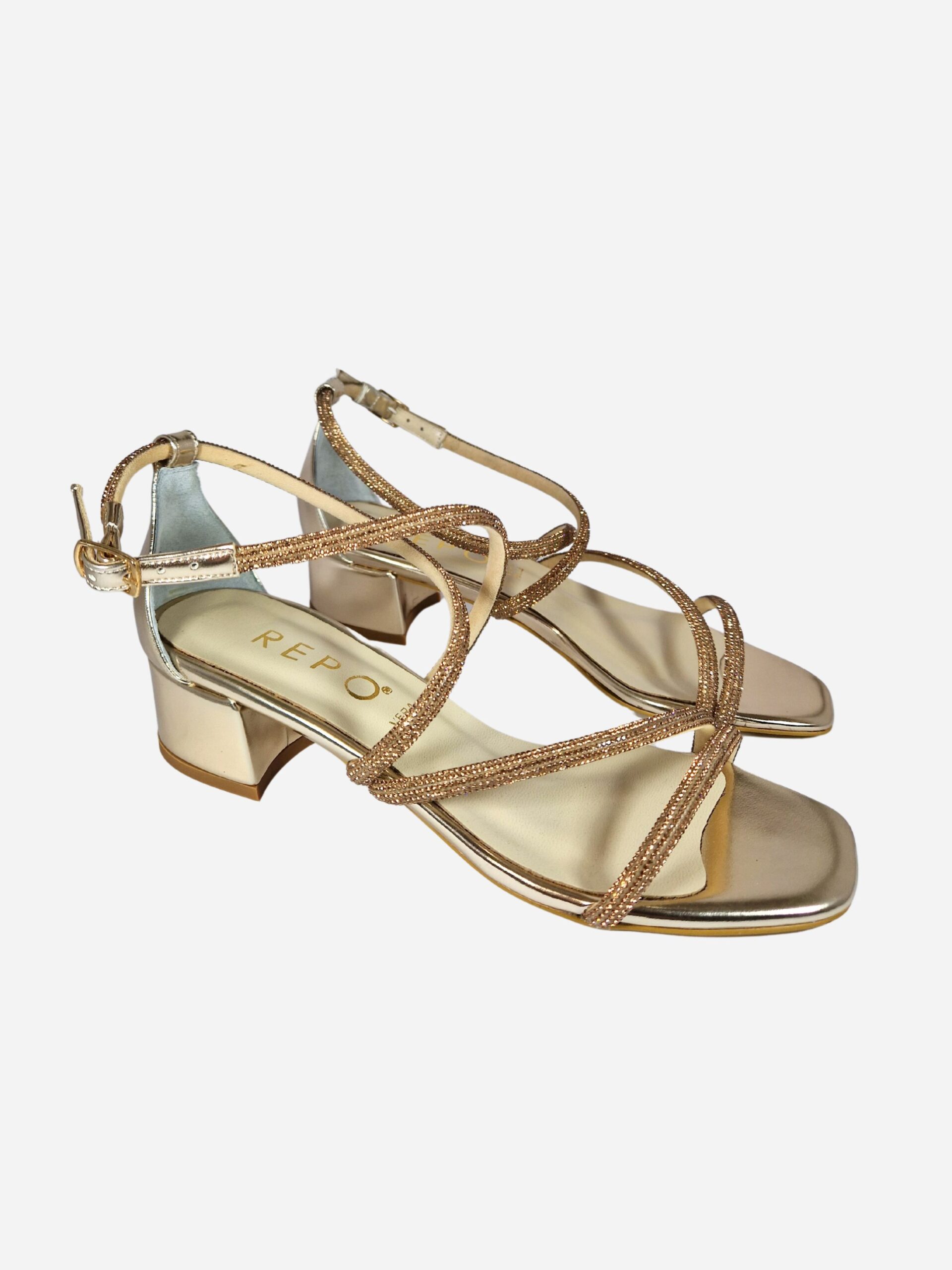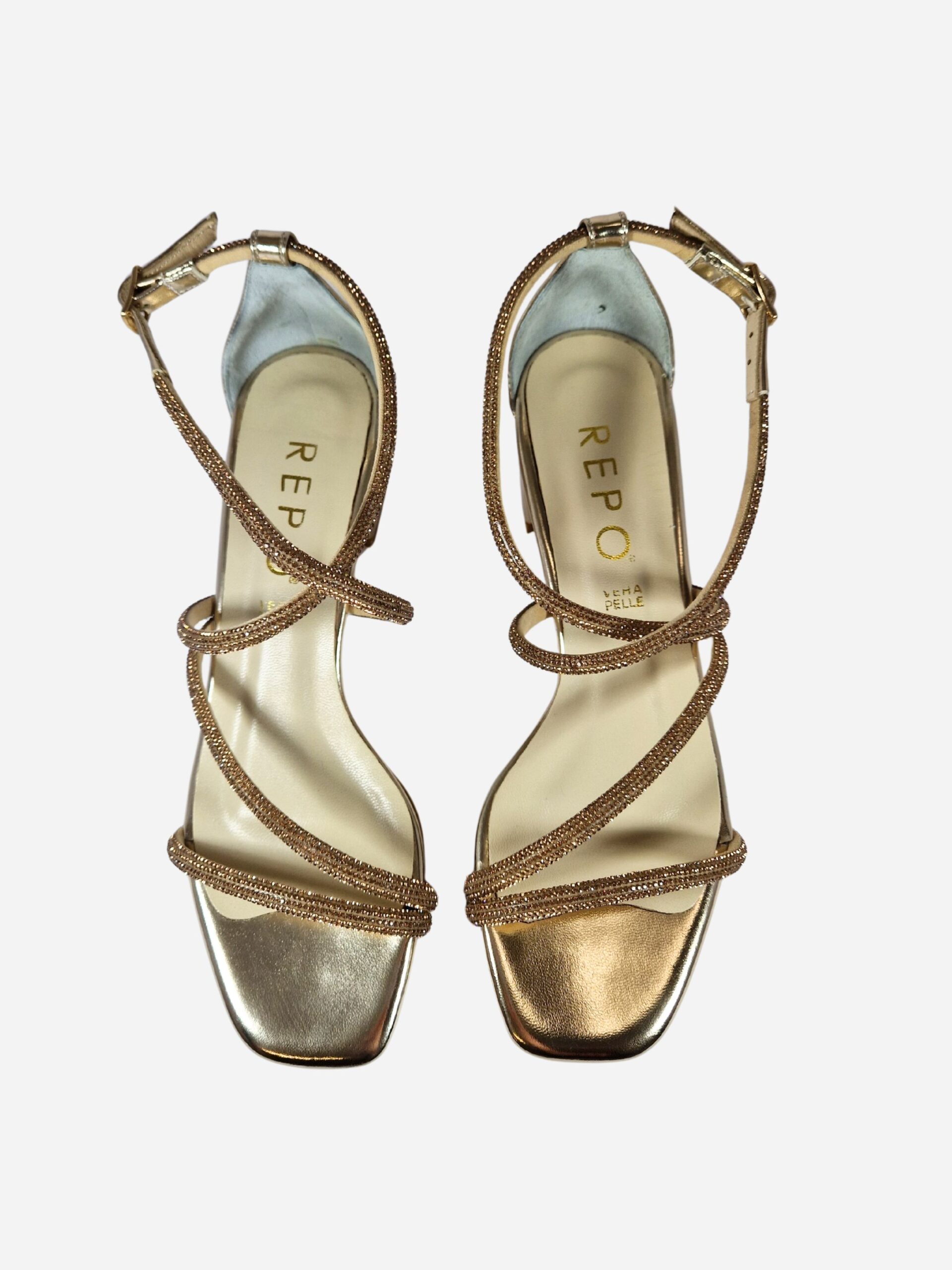 Sandali by Repo. Scarpe realizzate in vera pelle con fascette ricoperte di strass. Chiusura con cinturino. Comodo tacco largo di 4 cm.