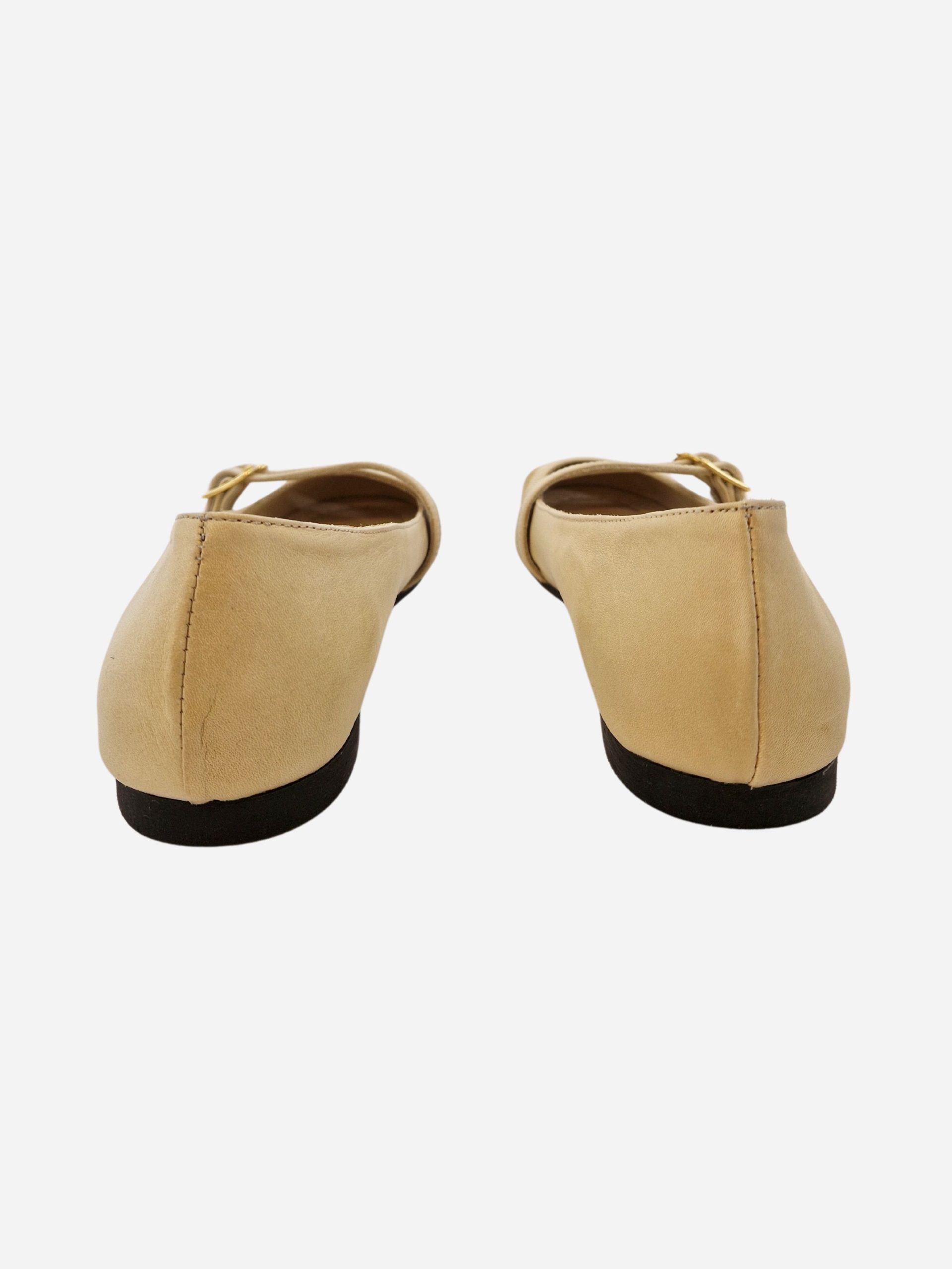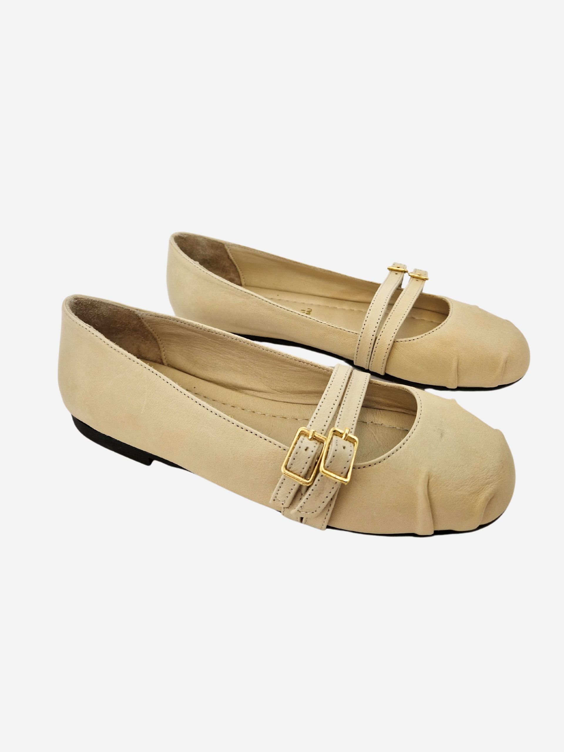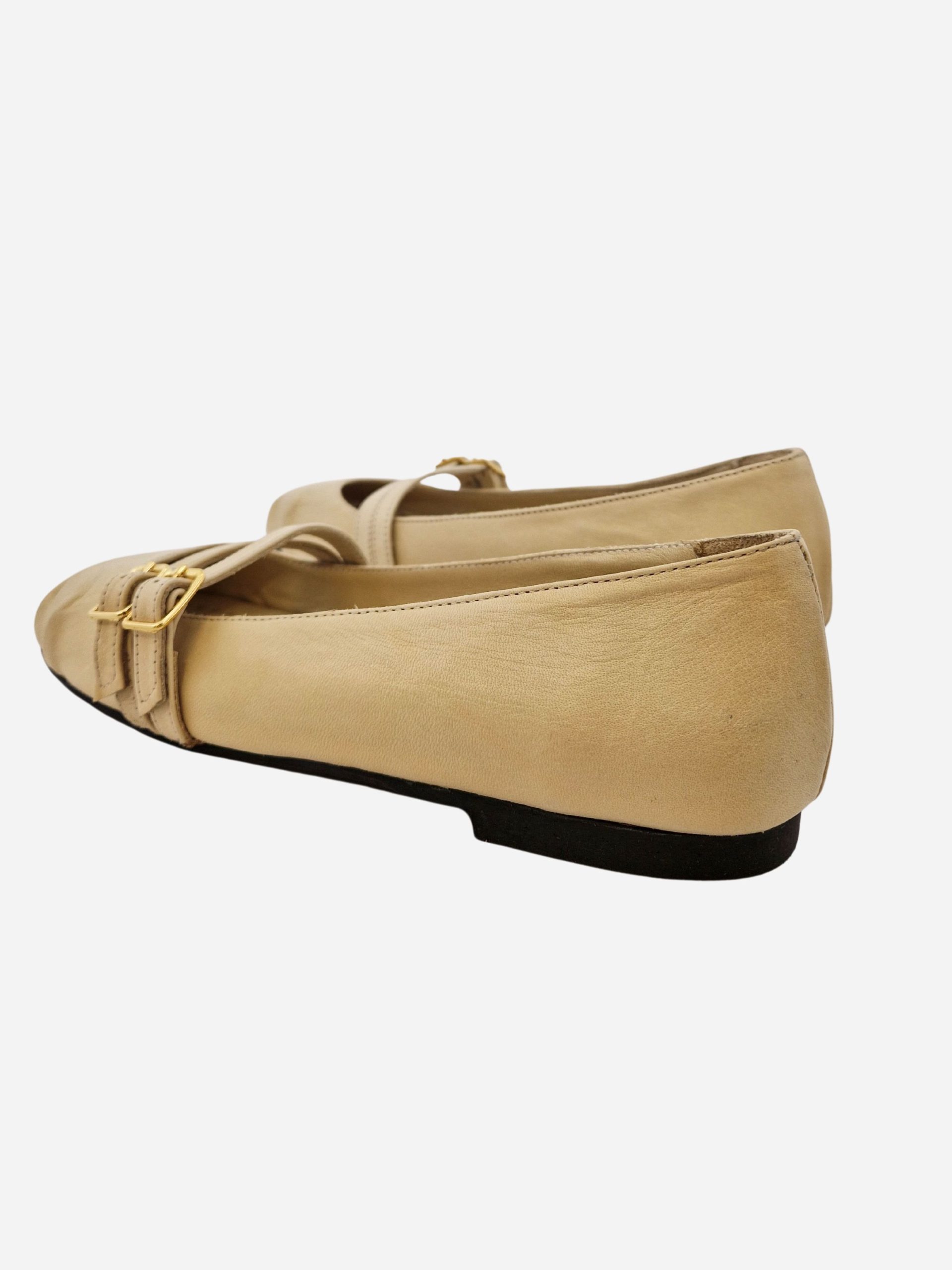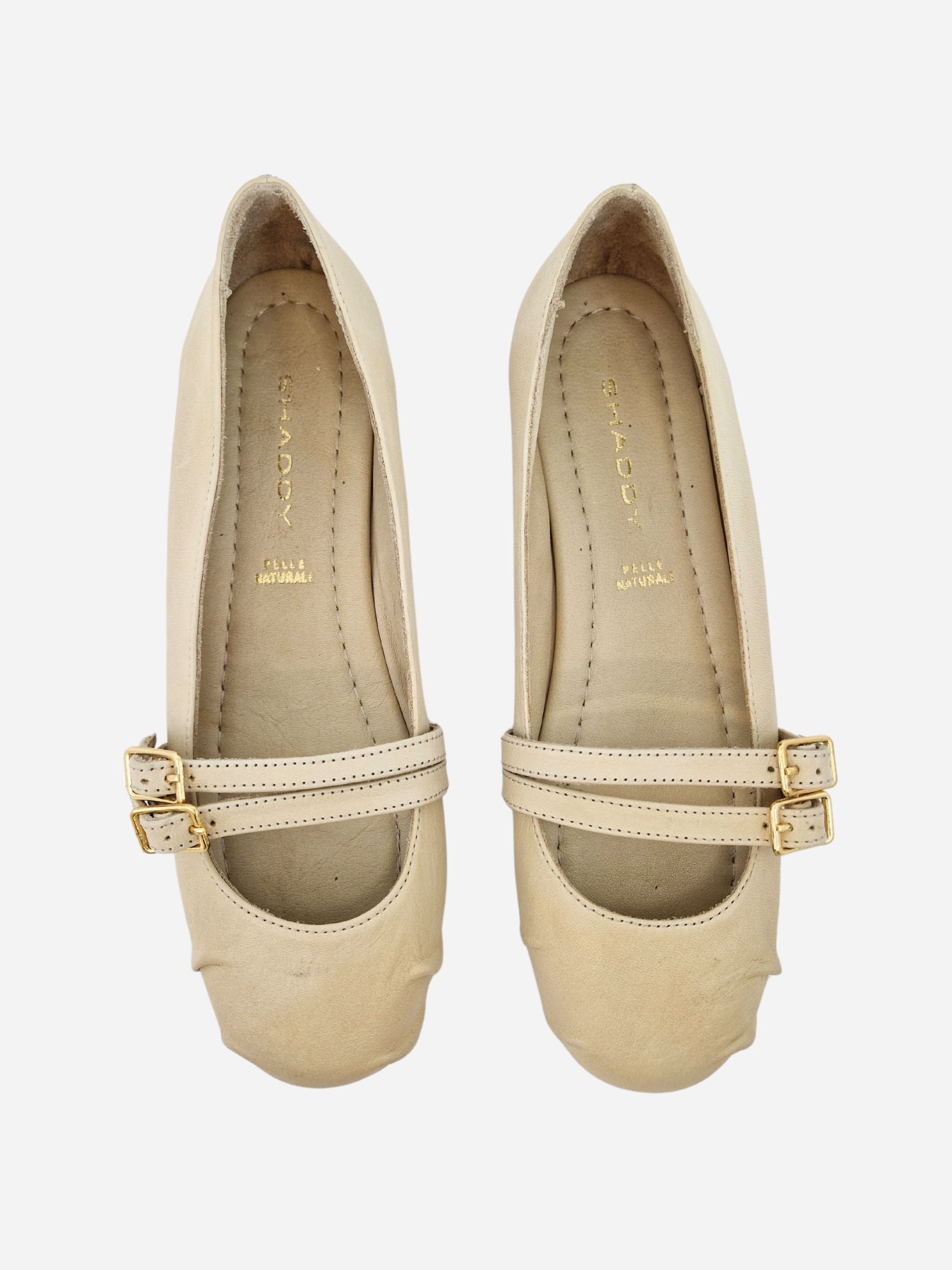 Ballerina by Shaddy. Calzature realizzate in vera pelle con morbido fondo in cuoio e suola in materiale sintetico. Punta arrotondata arricchita da 2 fibbie. Disponibile in più varianti: cuoio, blu navy e panna.