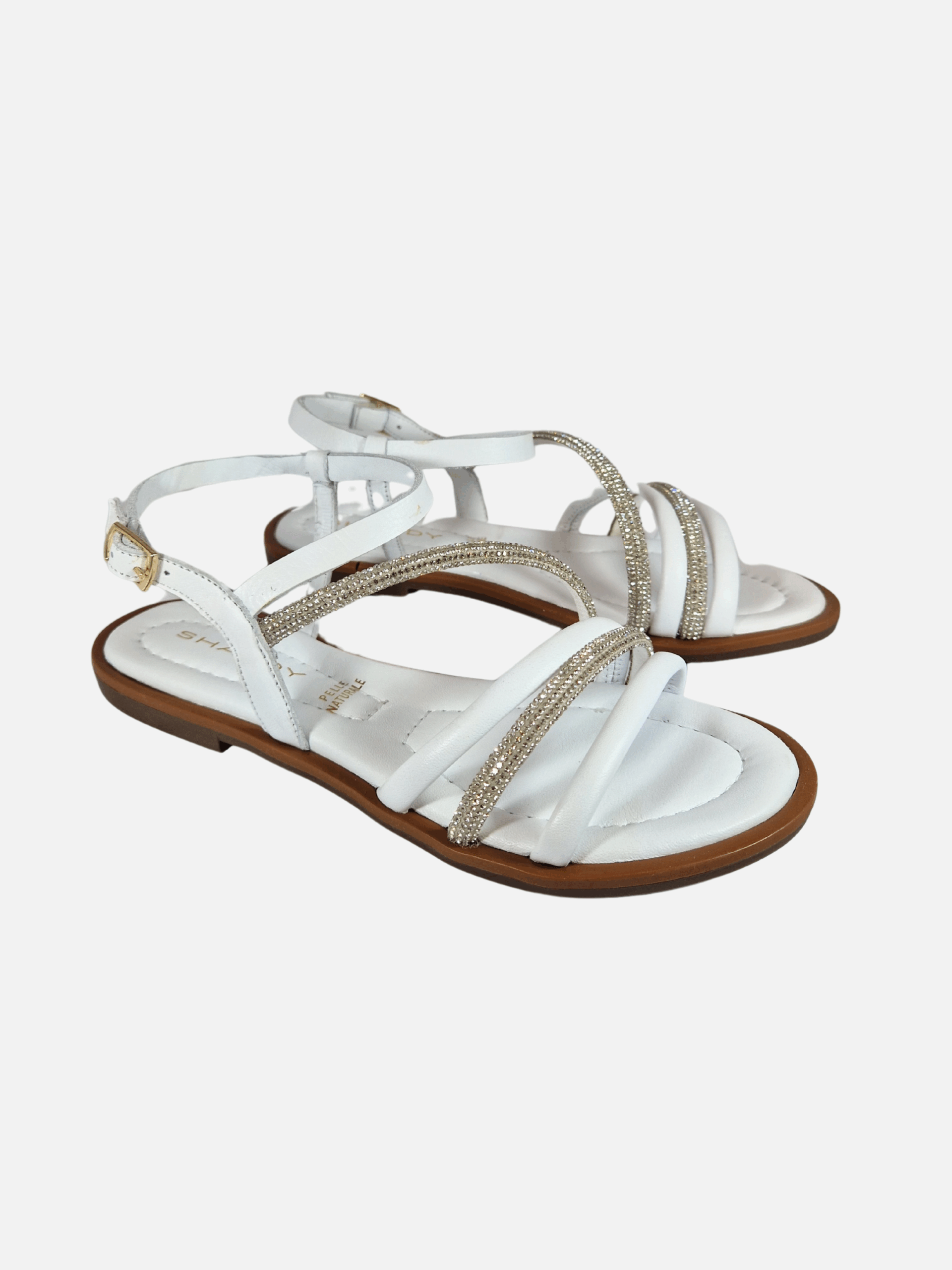 Sandali by Shaddy. Calzature realizzate in vera pelle con morbido fondo in cuoio e suola in materiale sintetico, arricchite da fascette con strass. Chiusura con cinturino.