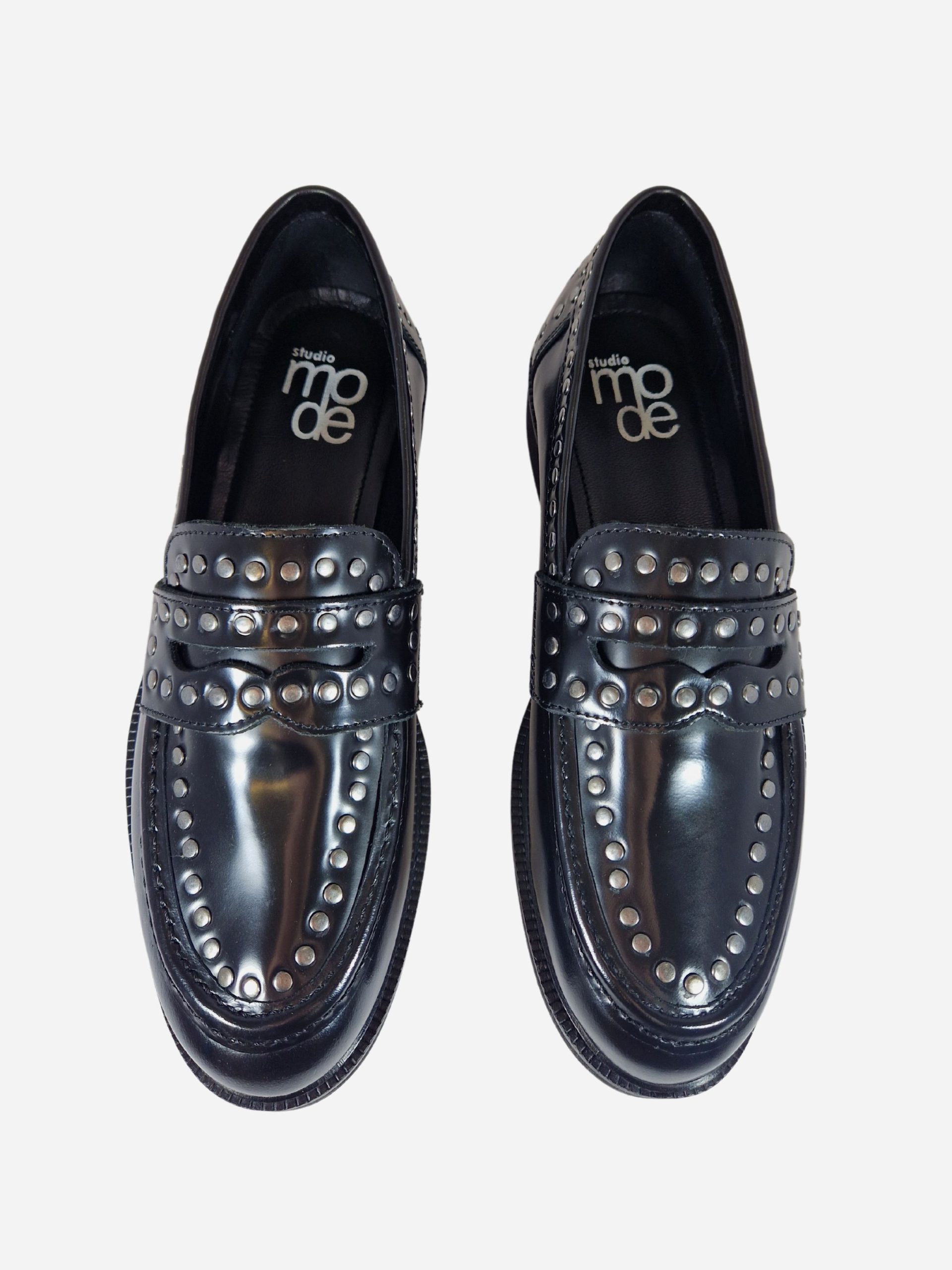 Mocassini by Studio Mode. Calzature dalla linea classica, realizzate in vera pelle con suola in materiale sintetico arricchite da borchie lungo tutta la tomaia.