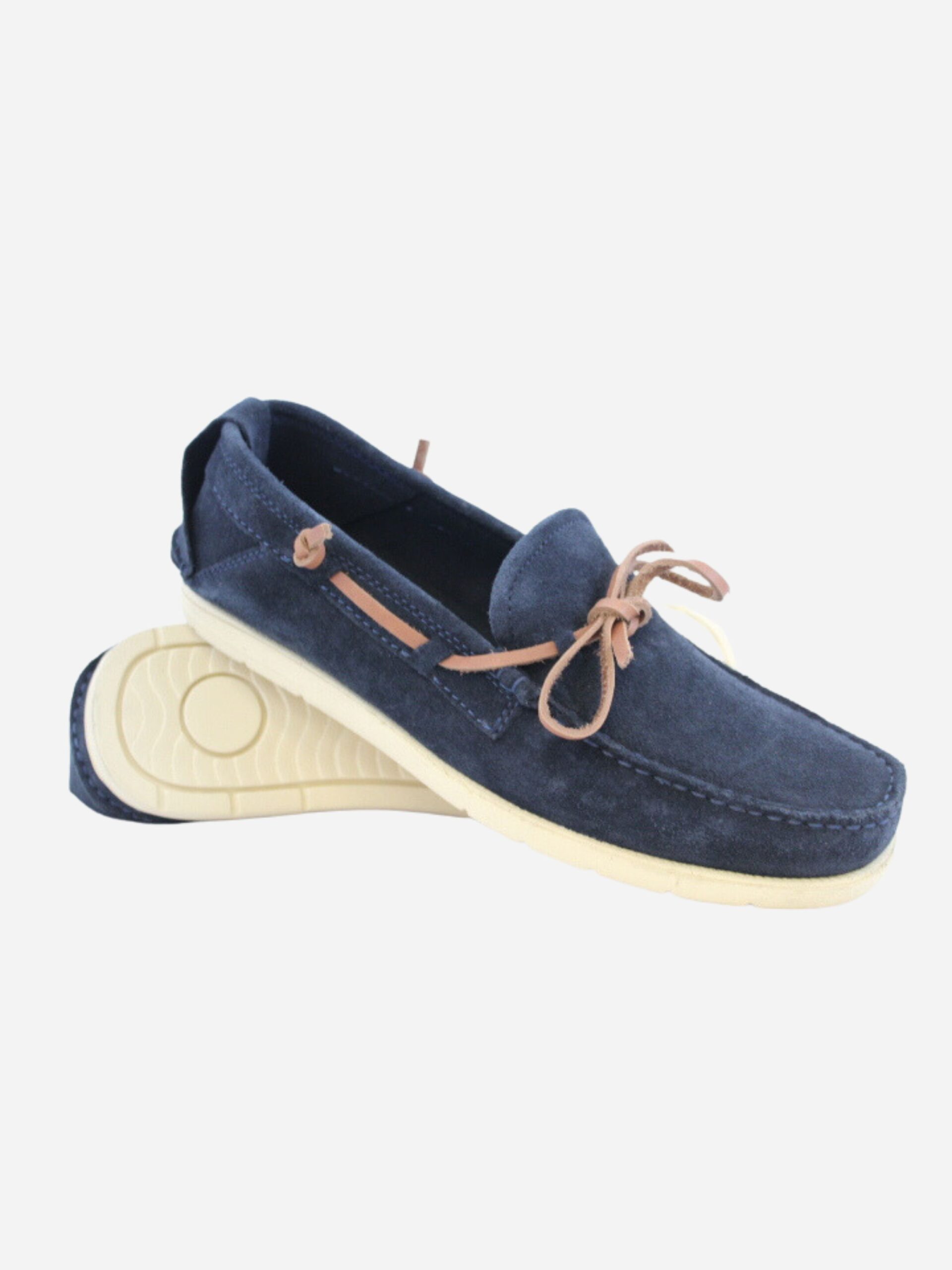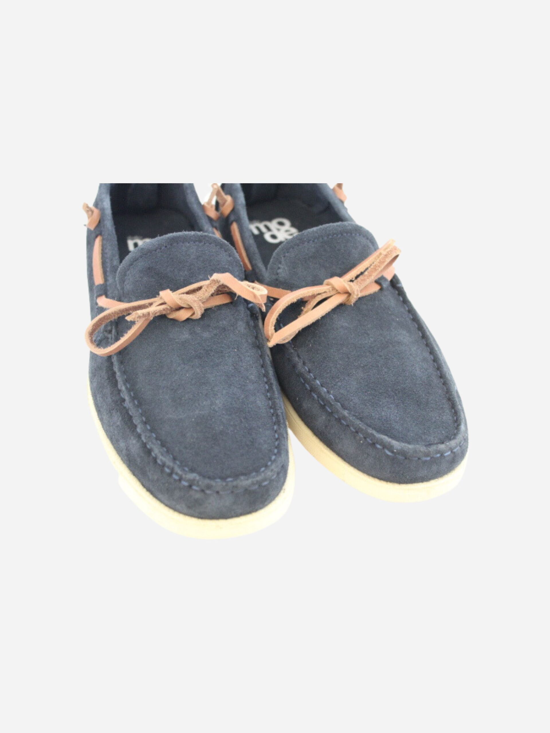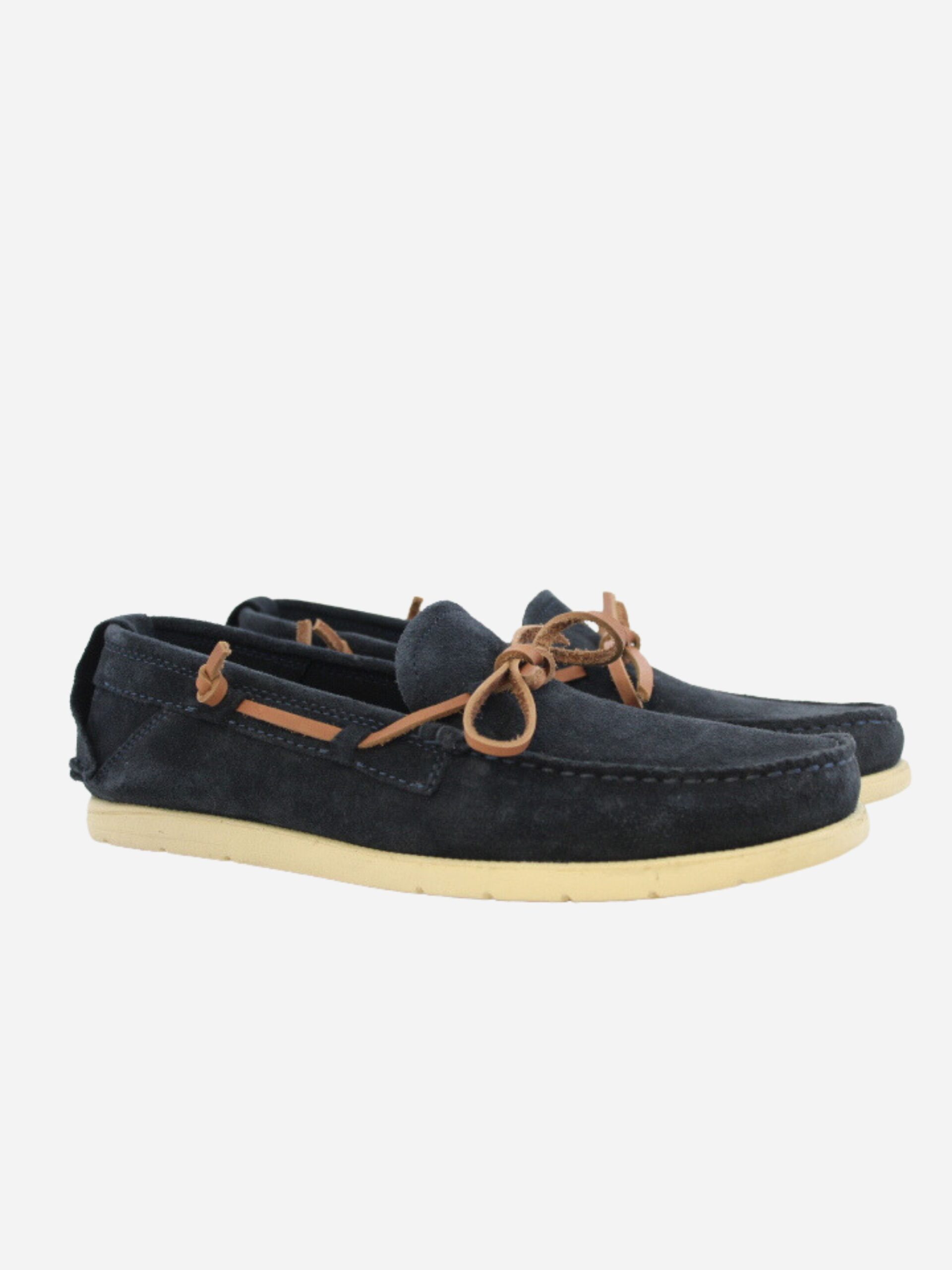 Mocassino by Studio Mode nella variante blu. Scarpe in stile boat, realizzate in pelle scamosciata con cordino a contrasto color cuoio. Suola in gomma.