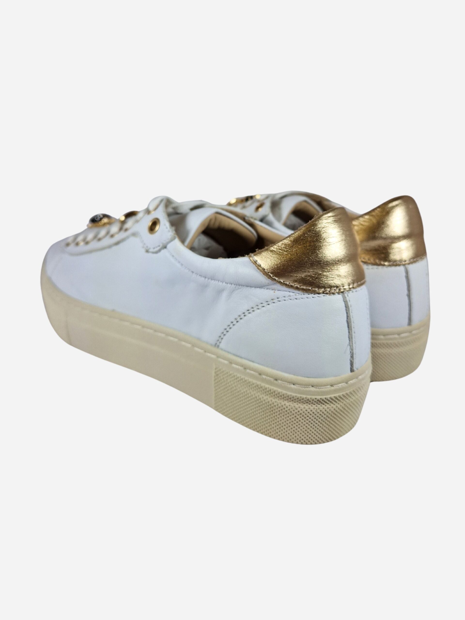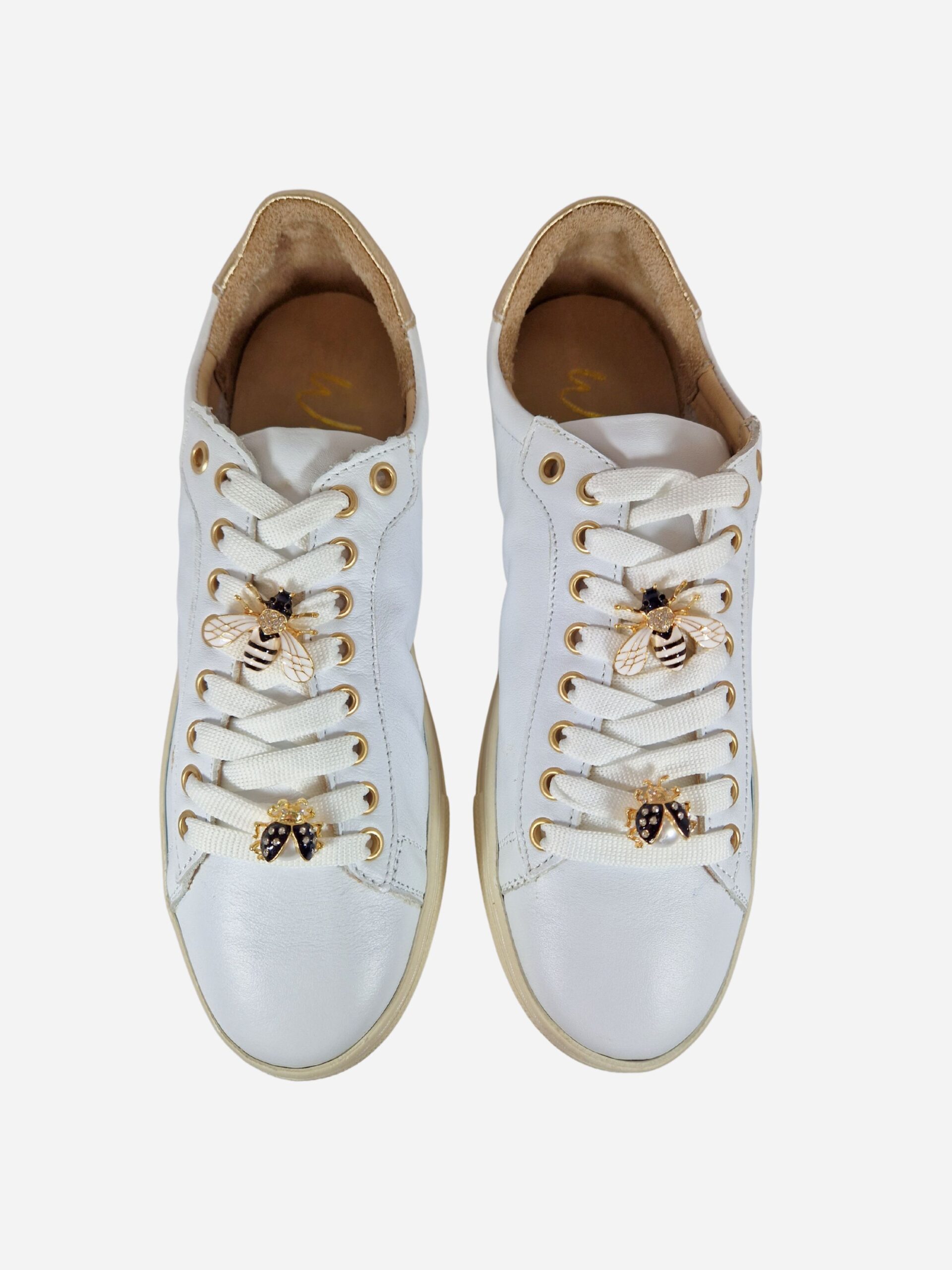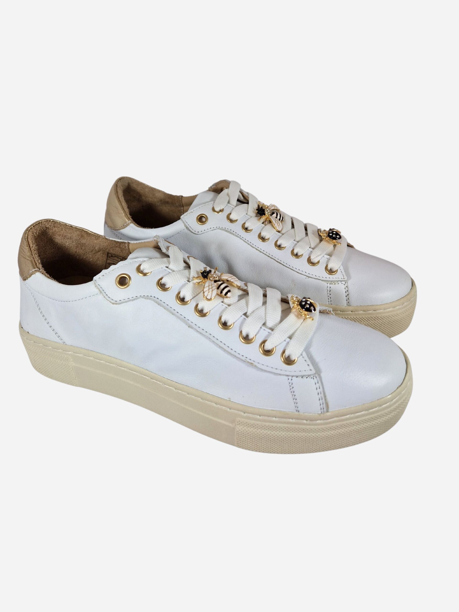 Sneakers by Wave. Calzature realizzate in vera pelle con suola platform in gomma. Le scarpe sono arricchite da piccoli charms a forma di ape sui lacci.